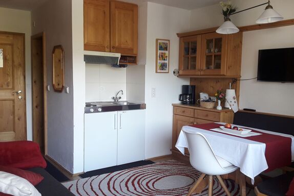 Bestehend aus 1 Wohn-/Schlafraum mit Dusche und WC, Balkon, Schrankbetten oder Ausziehcouch, Kochnische mit sämtlichem Koch- und Tafelgeschirr, Kaffeemaschine, Wasserkocher, Toaster, SAT-TV.