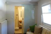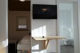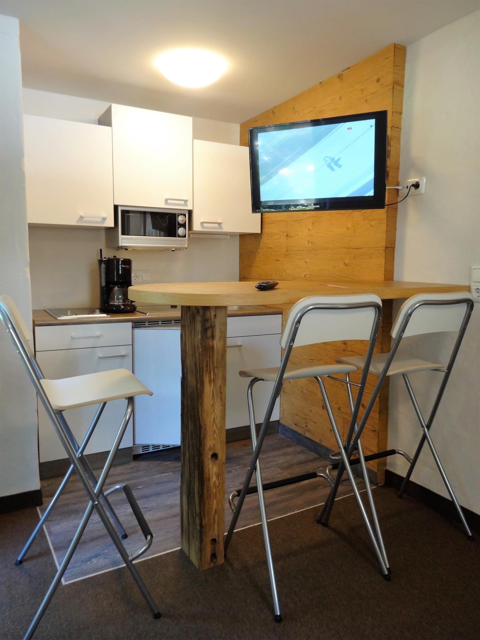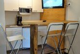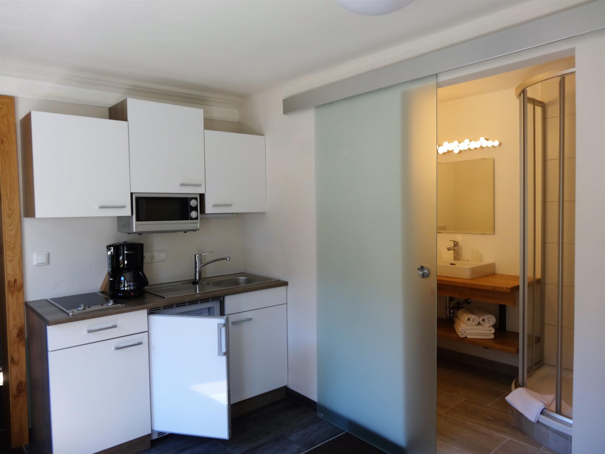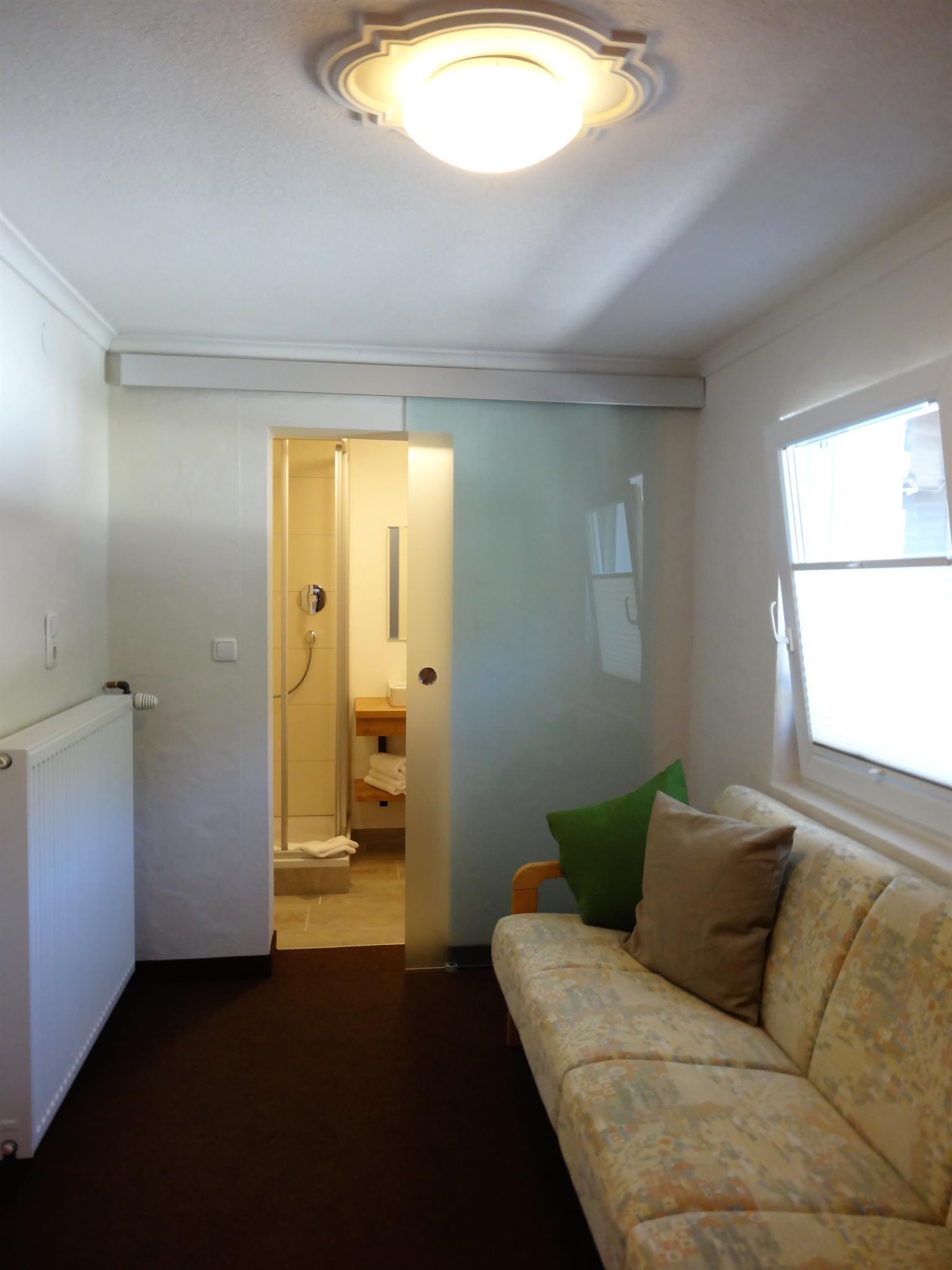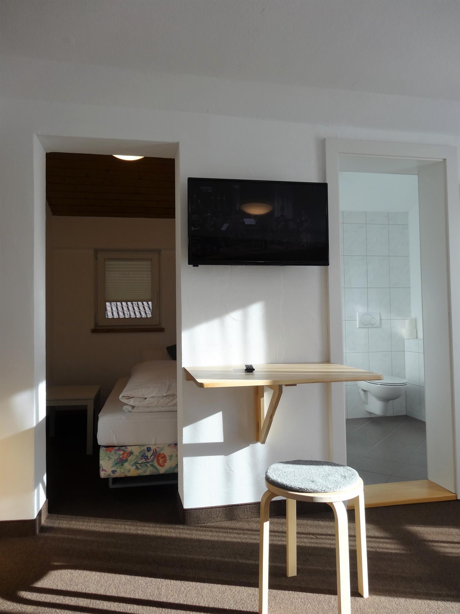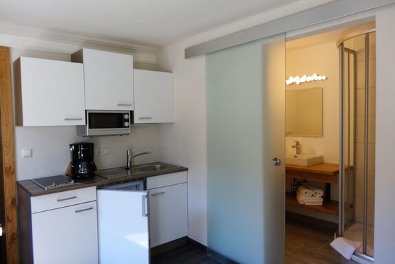 Apartment mit Blick in Richtung Garten od. Berge: entweder(Wohn-) Schlafzimmer mit 1 Doppelbett und Zusatzbett im etwas sep. Bereich oder Wohn-Schlafzimmer mit 1 Zusatzbett / Couchbett oder Etagenbett (Liegefläche 200x80 cm) Küchenzeile, kleiner funktioneller Tisch oder Ess-Bar, Kabel-TV, Bad mit Dusche / evtl.BW und Wc