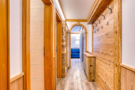 ca. 55m2 groß, Fußboden in Holzoptik, Vorraum mit Garderobe - Spiegel, Badezimmer Dusche – Föhn – Seife usw., WC, Schlafzimmer Doppelbett 180x200cm – Nachtkästchen – großer Kleiderkasten - Safe, Kinderzimmer mit Boxspringbett 160x200cm oder einzeln 2x 80x200cm, Wohnzimmer mit voll ausgestatteter Küchenzeile mit Cerankochfeld – Kabel TV mit TV Schrank - Eckbank – Schlafcouch zum Ausklappen 180x200cm –Balkon mit Bestuhlung Richtung Süd/Ost