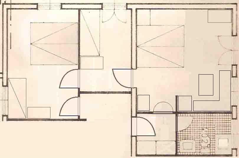 1 großer Wohn-Schlafraum mit Doppelbett, Eckbankgruppe und Sat-TV, 1 Schlafzimmer mit Doppelbett und Einzelbett, 1 Schlafzimmer mit Etagenbett und ausziehbarer Einzelcouch, DU/WC, Kochnische und großer Balkon, ca. 65 m². Helle, freundliche Wohnun
