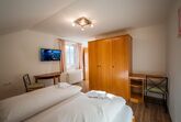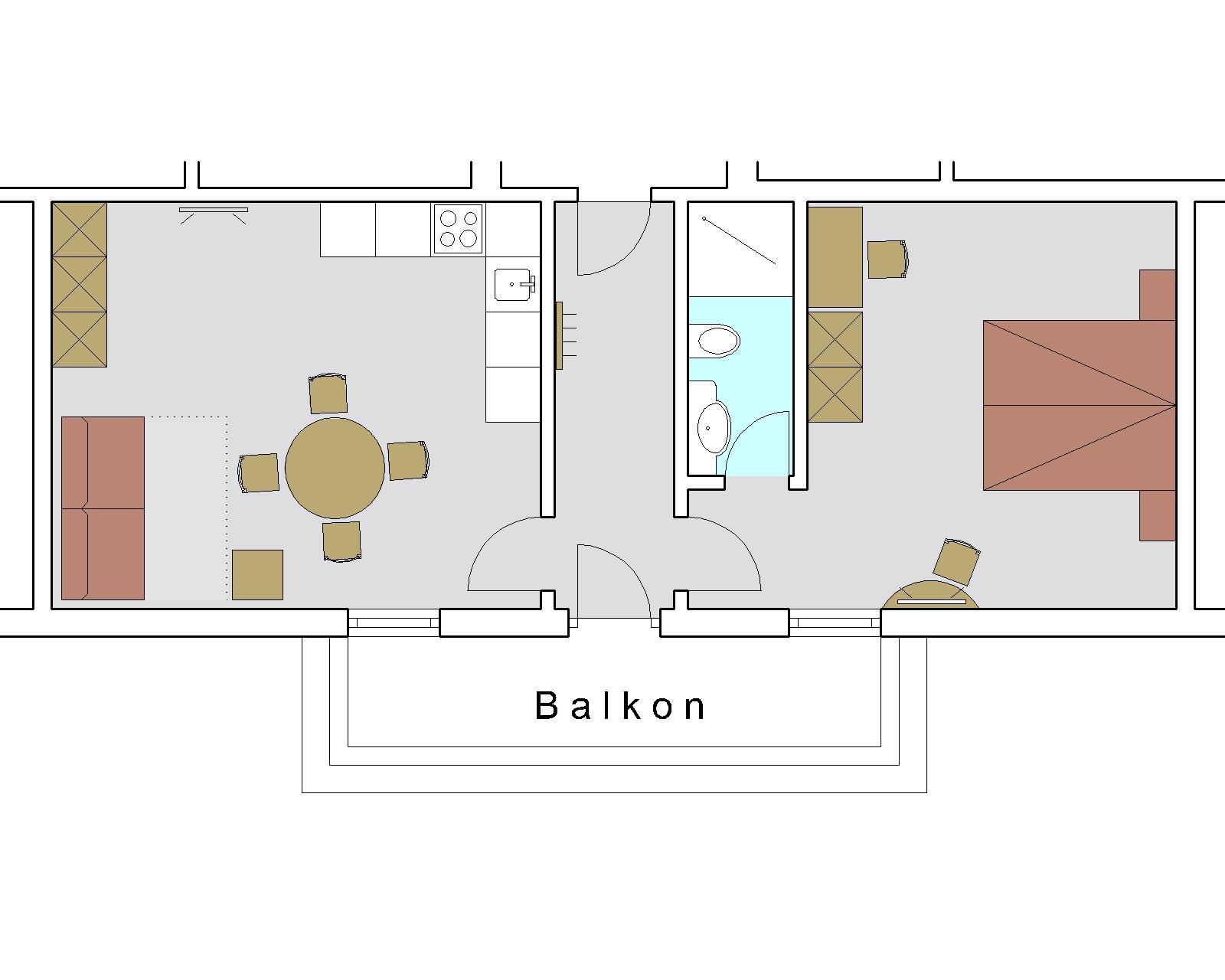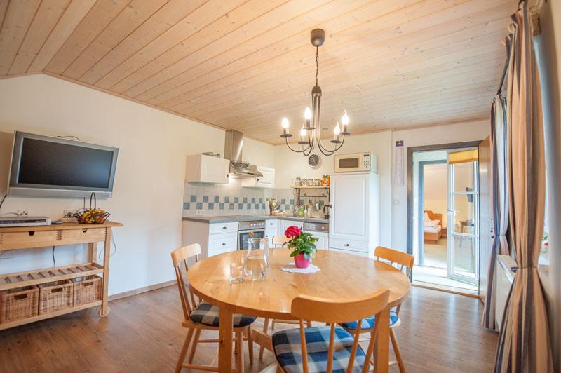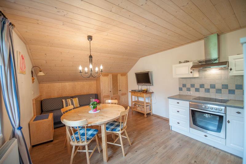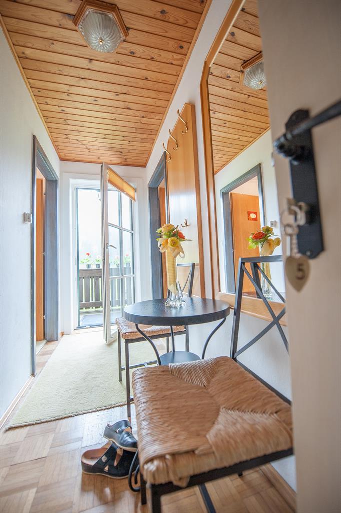Die Ferienwohnung befindet sich im Haupthaus im 2. Stock, ist 45 m² groß und verfügt über ein Schlafzimmer mit Doppelbett und DU/WC. Die vollständig ausgestattete Küche ist ein extra Raum mit einer Couch. Vorraum. Sehr schöner südseitiger Balkon.