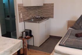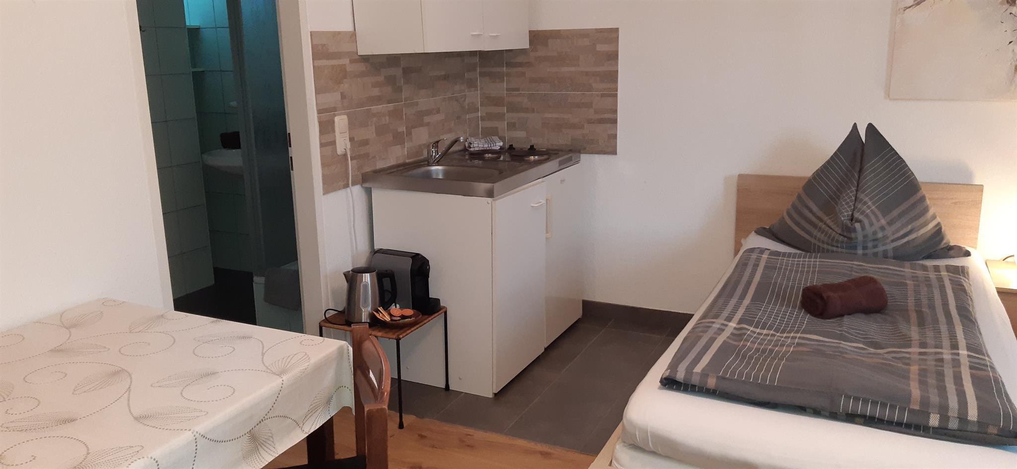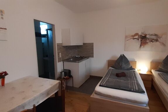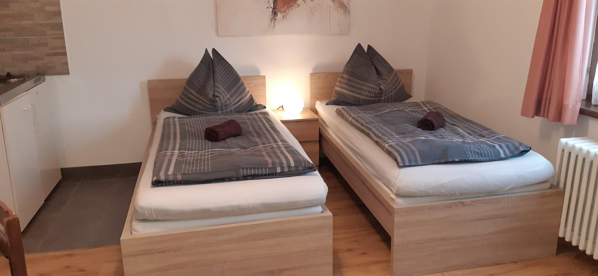 Klein-Appartment (20 m²) mit Bad/Dusche/WC und kleiner Küchenecke. 2 getrennte Betten (können zu einem Doppelbett zusammengschoben werden) 1. Stock Nichtraucher Handtücher und Bettwäsche vorhanden