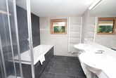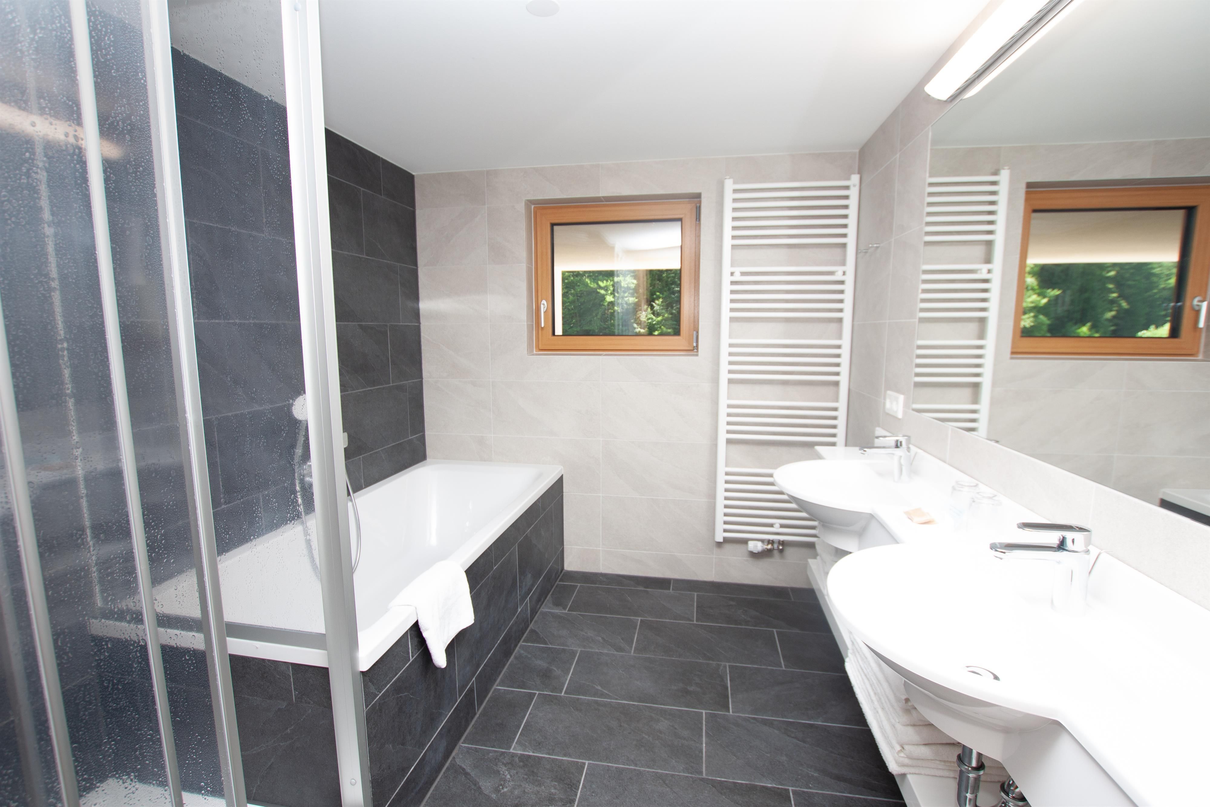 Badezimmer mit Dusche, Badewanne, 2 Waschbecken, Haarfön