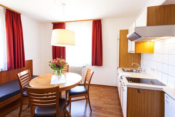Appartement Nr.5 - Panorama select Familienappartement mit 1 Schlafzimmer und 1 Wohn-Schlafzimmer, Küche komplett eingerichtet mit Kaffeemaschine, Wasserkocher, Toaster und Geschirrspüler – Mikrowelle auf Wunsch, Bad oder Dusche/WC, Telefon, Radio, 2x Flatscreen-TV, Zimmersafe, Haartrockner im Bad, Balkon, für 2- 4 Personen, ca. 45 m2