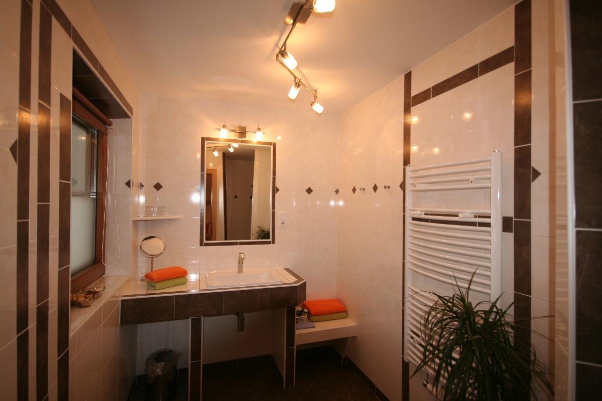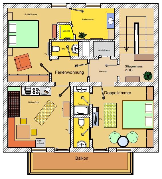 Unsere Ferienwohnung für 2-4 Personen mit Vorraum, zwei Schlafzimmern für je zwei Personen mit jeweils Bad, Toilette, TV (SAT) und kostenlosem Internet. Wohnraum mit Küchenzeile, Geschirrspülmaschine, Backrohr, Mikrowelle usw.