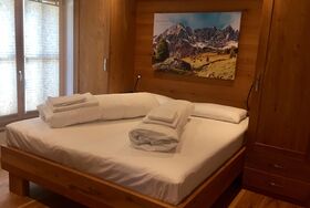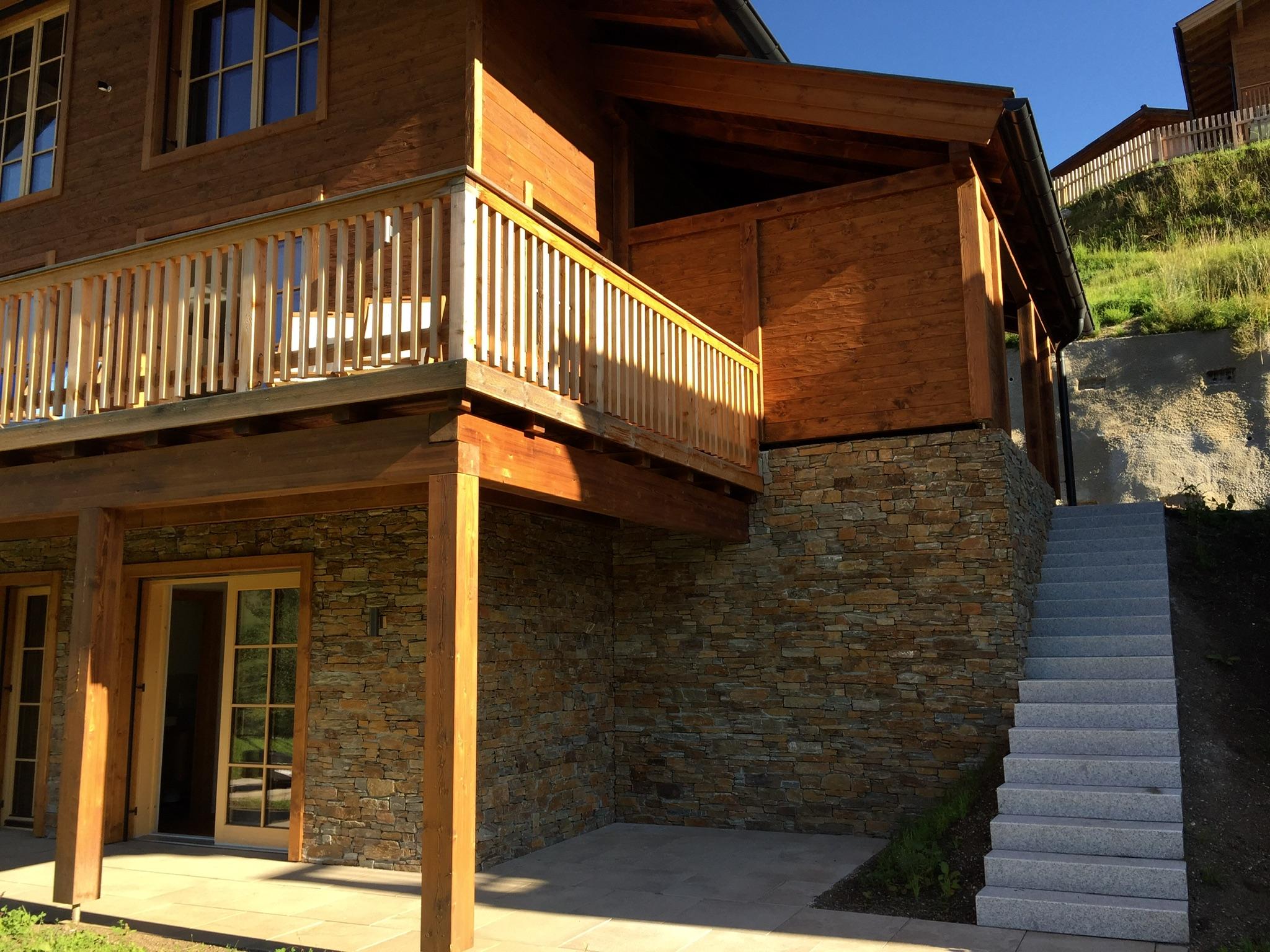 Geniessen Sie das verträumte Bergdorf und ihr sonnenverwöhntes Chalet:der großzügige Wohnbereich ist charmant eingerichtet mit viel Holz, moderner Küche, kuscheligem Sofa und einem grossen Esstisch. 5 Schlafzimmer mit Doppelbett, Dusche und WC und TV, Schrank.