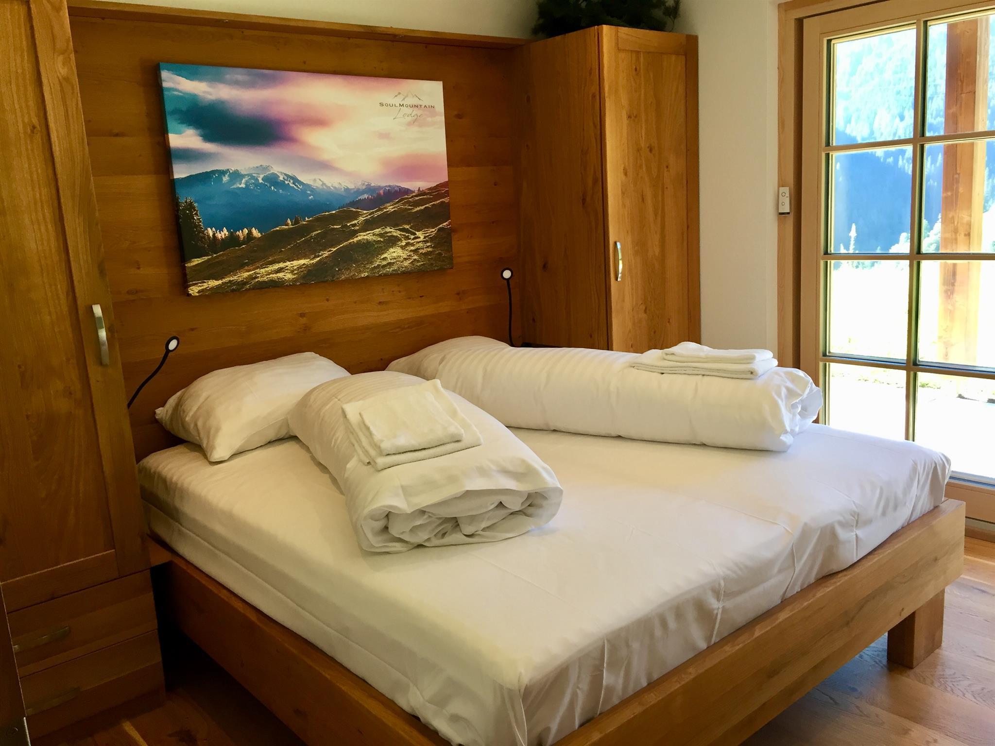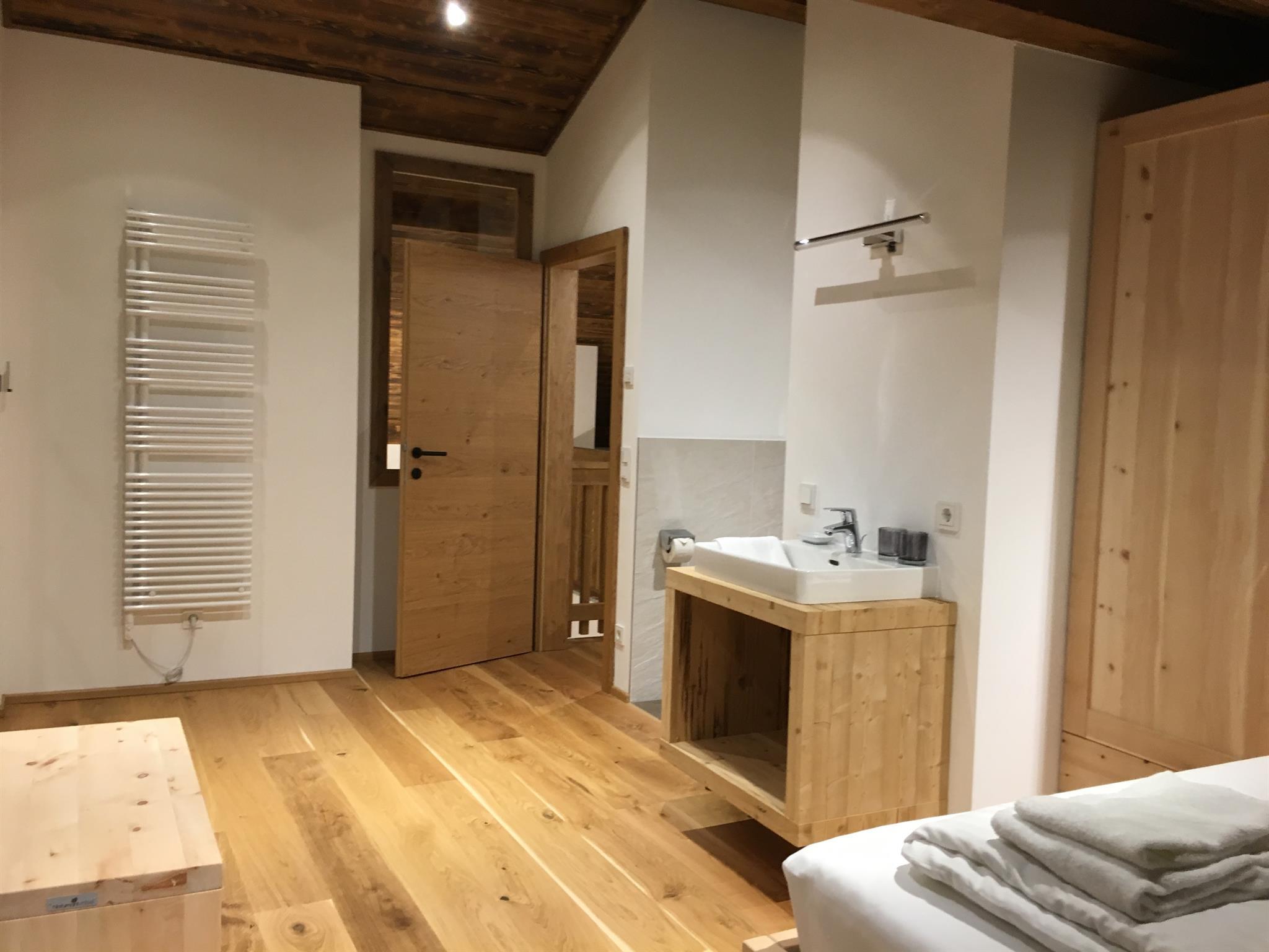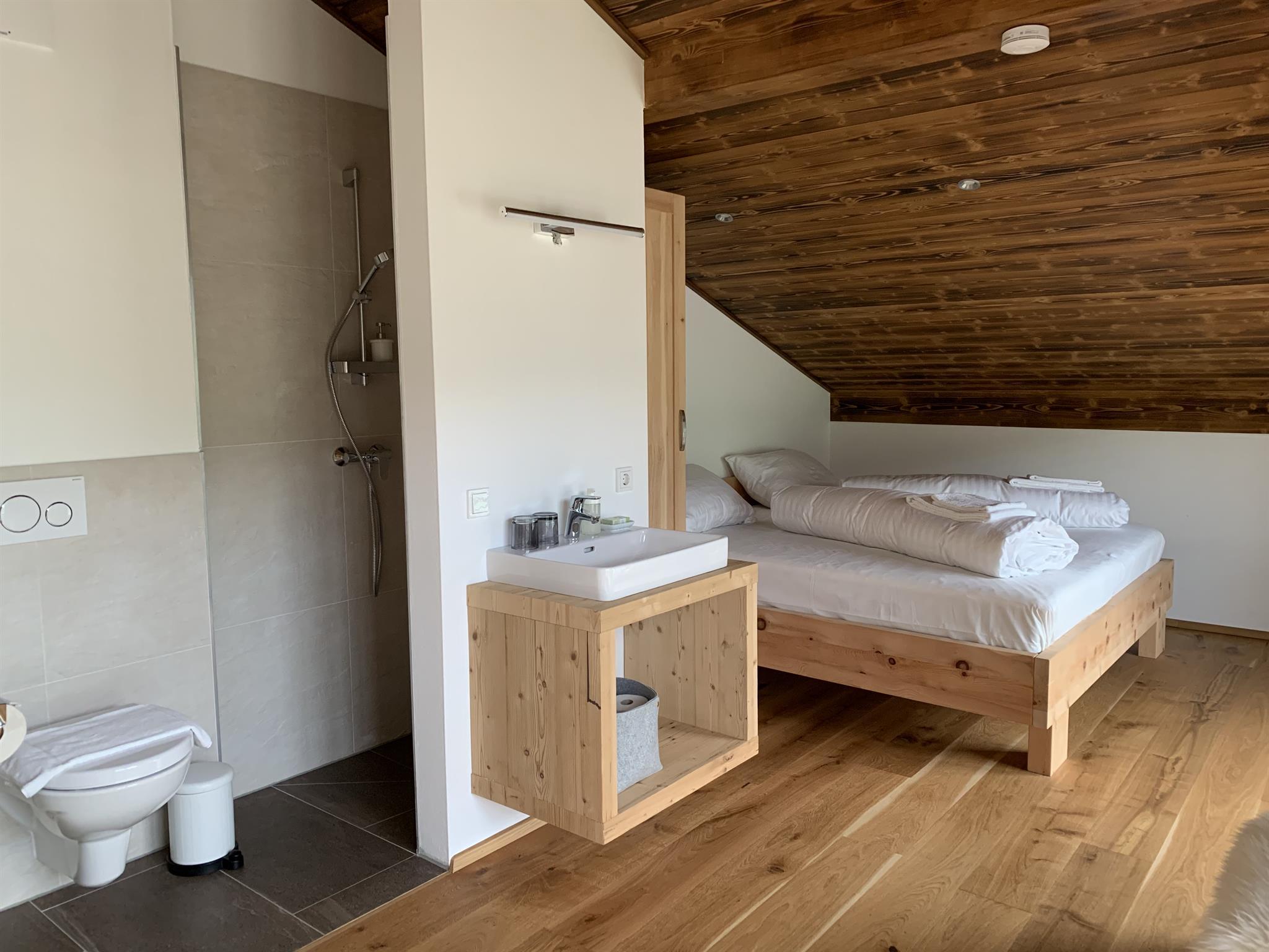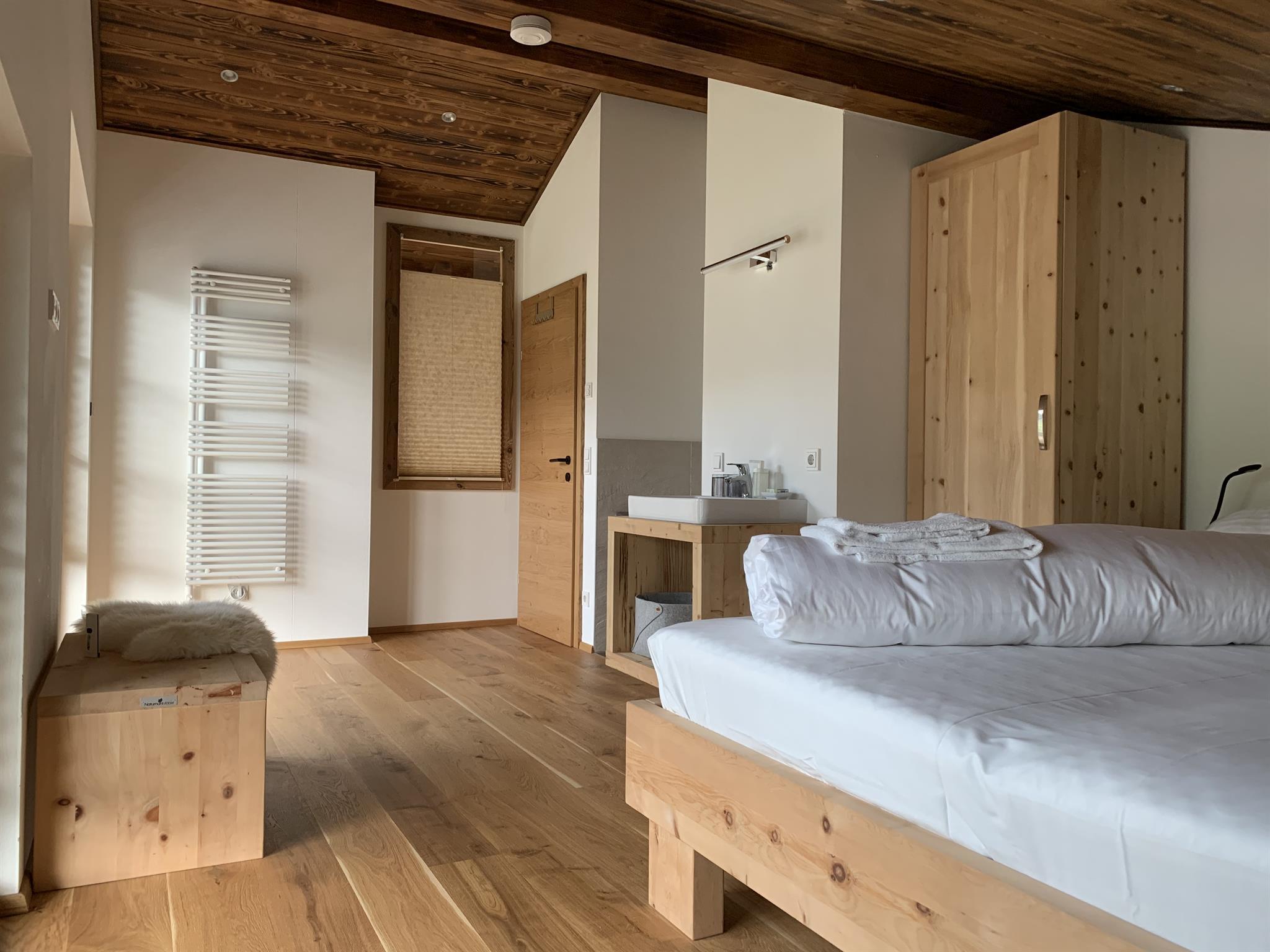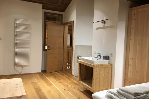 • Zirbensuite: Doppelbett und Einbauschränke zur Südseite offener Dusch/Waschbereich.