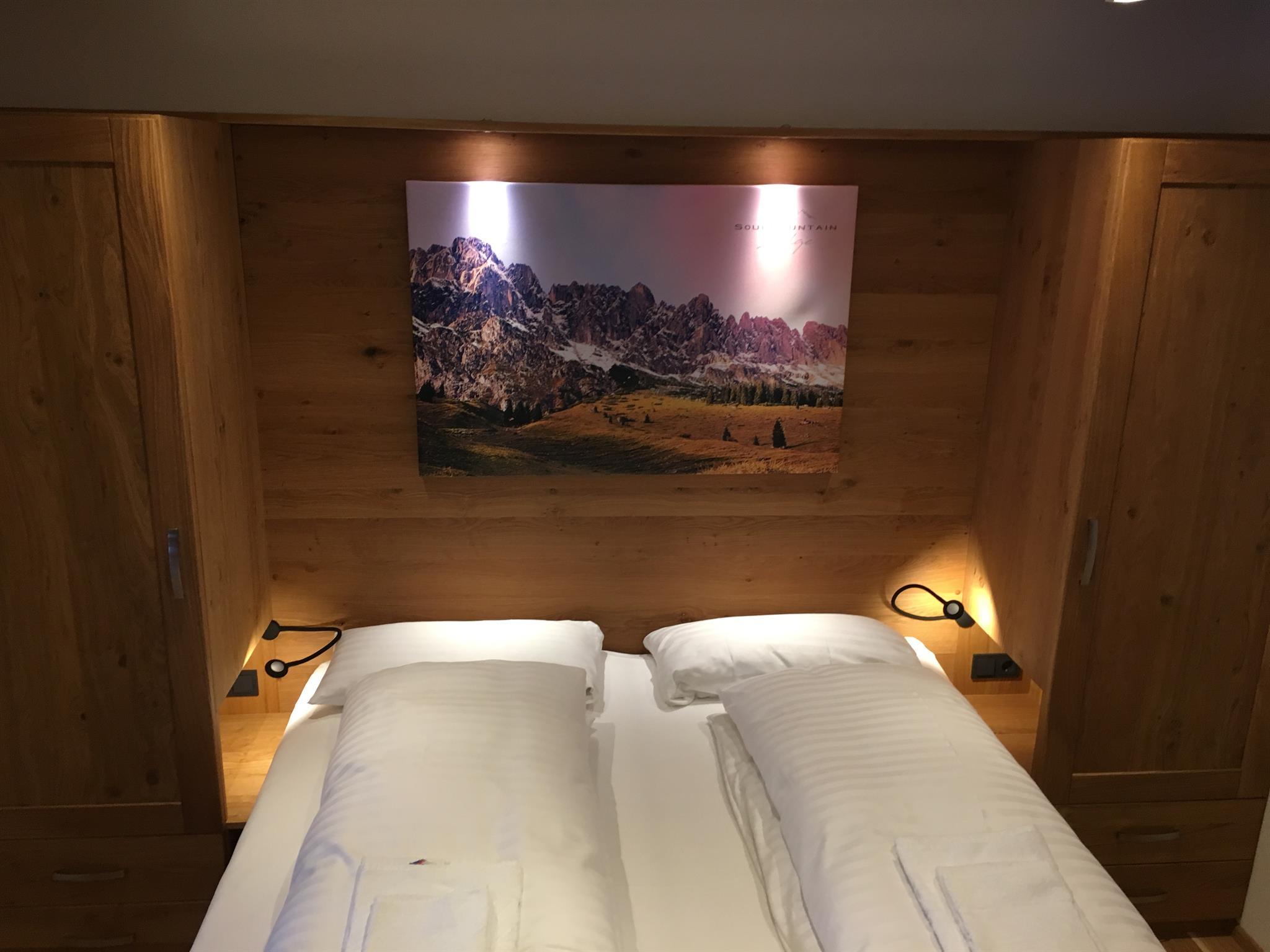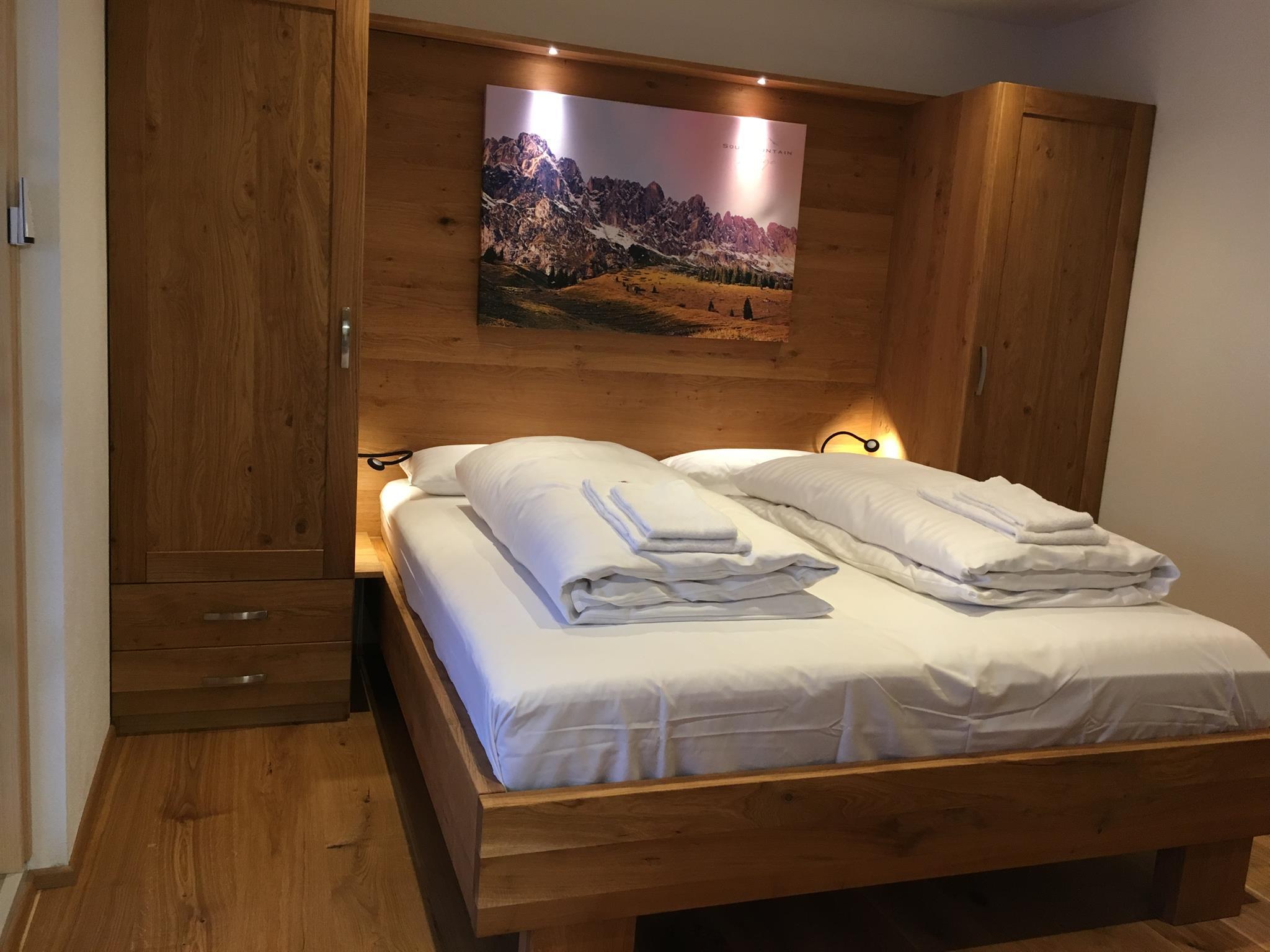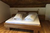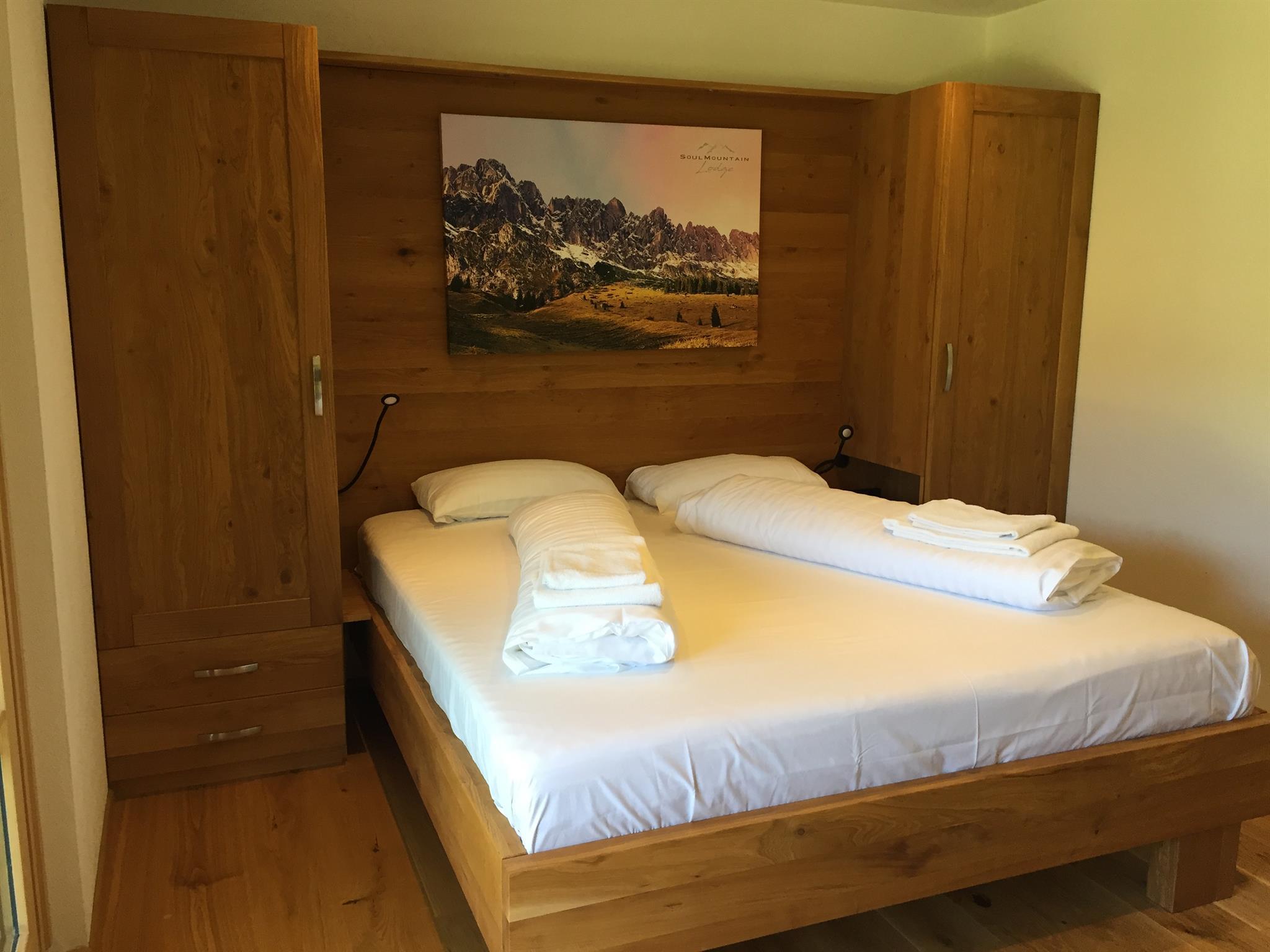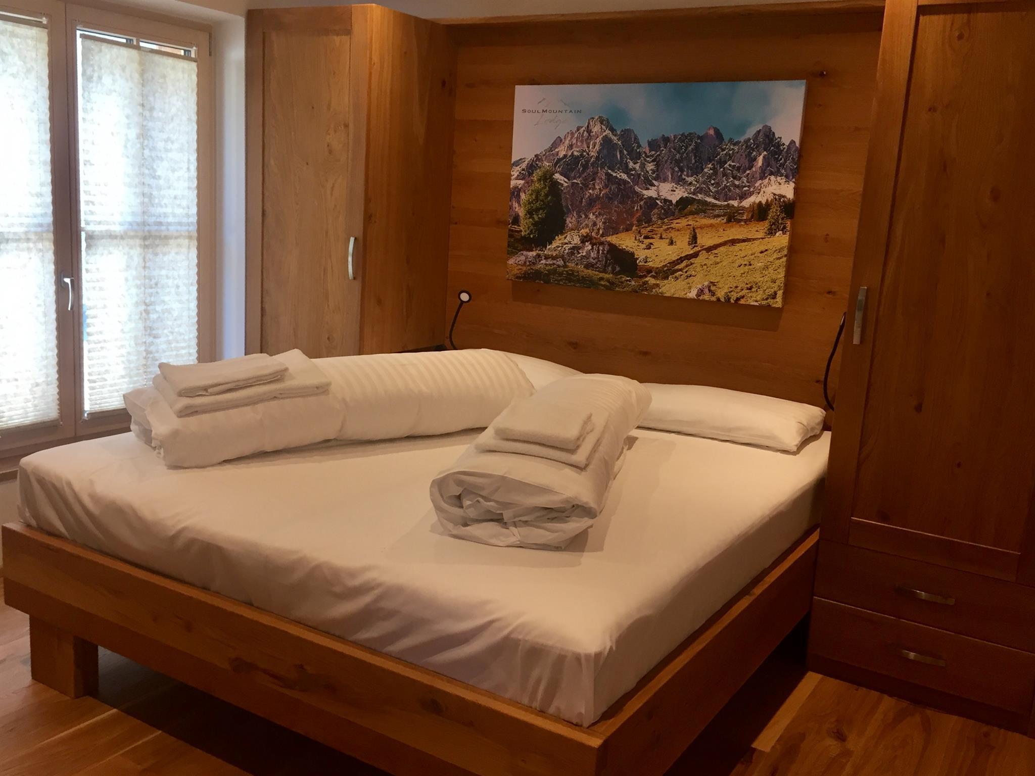• Zirbensuite: Doppelbett und Einbauschränke zur Südseite offener Dusch/Waschbereich.