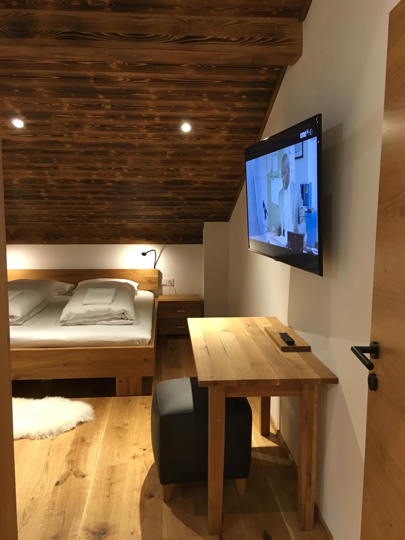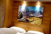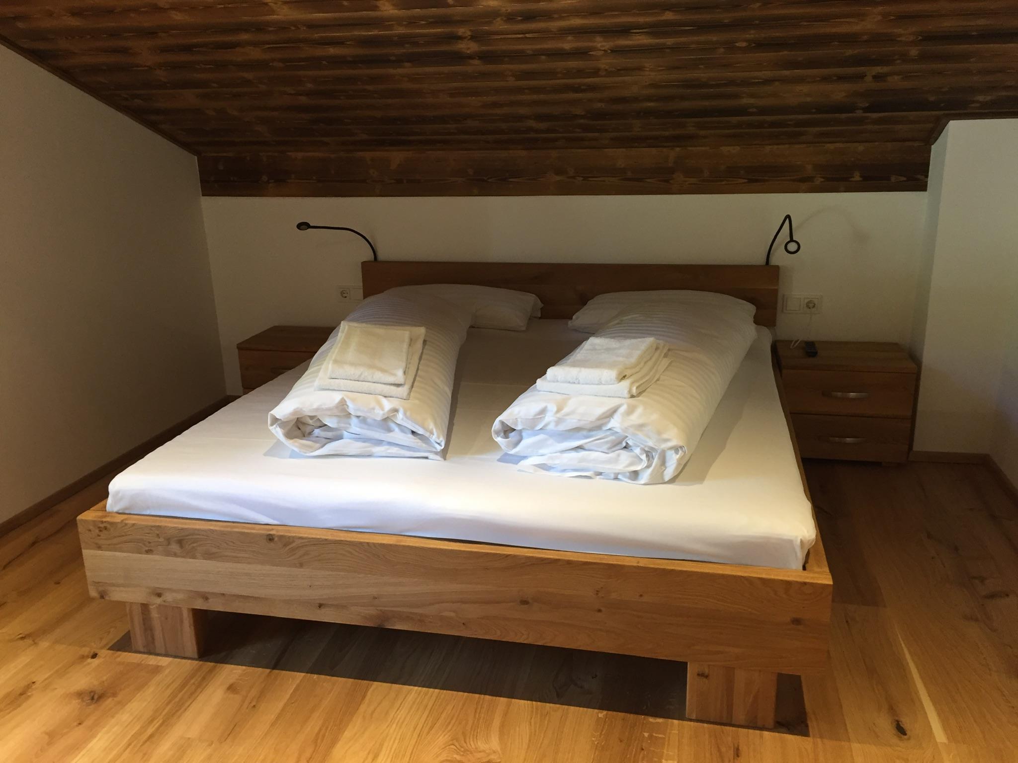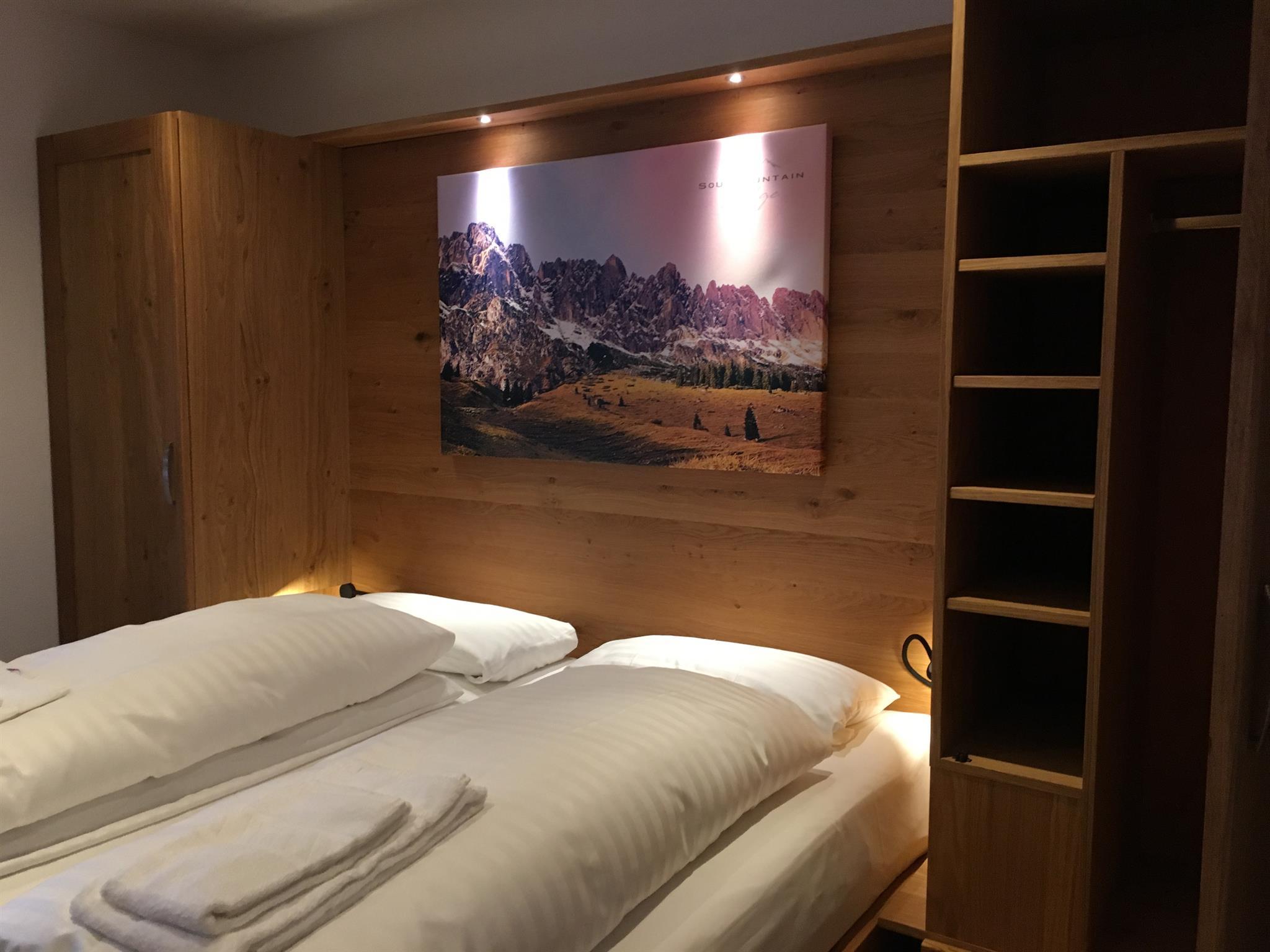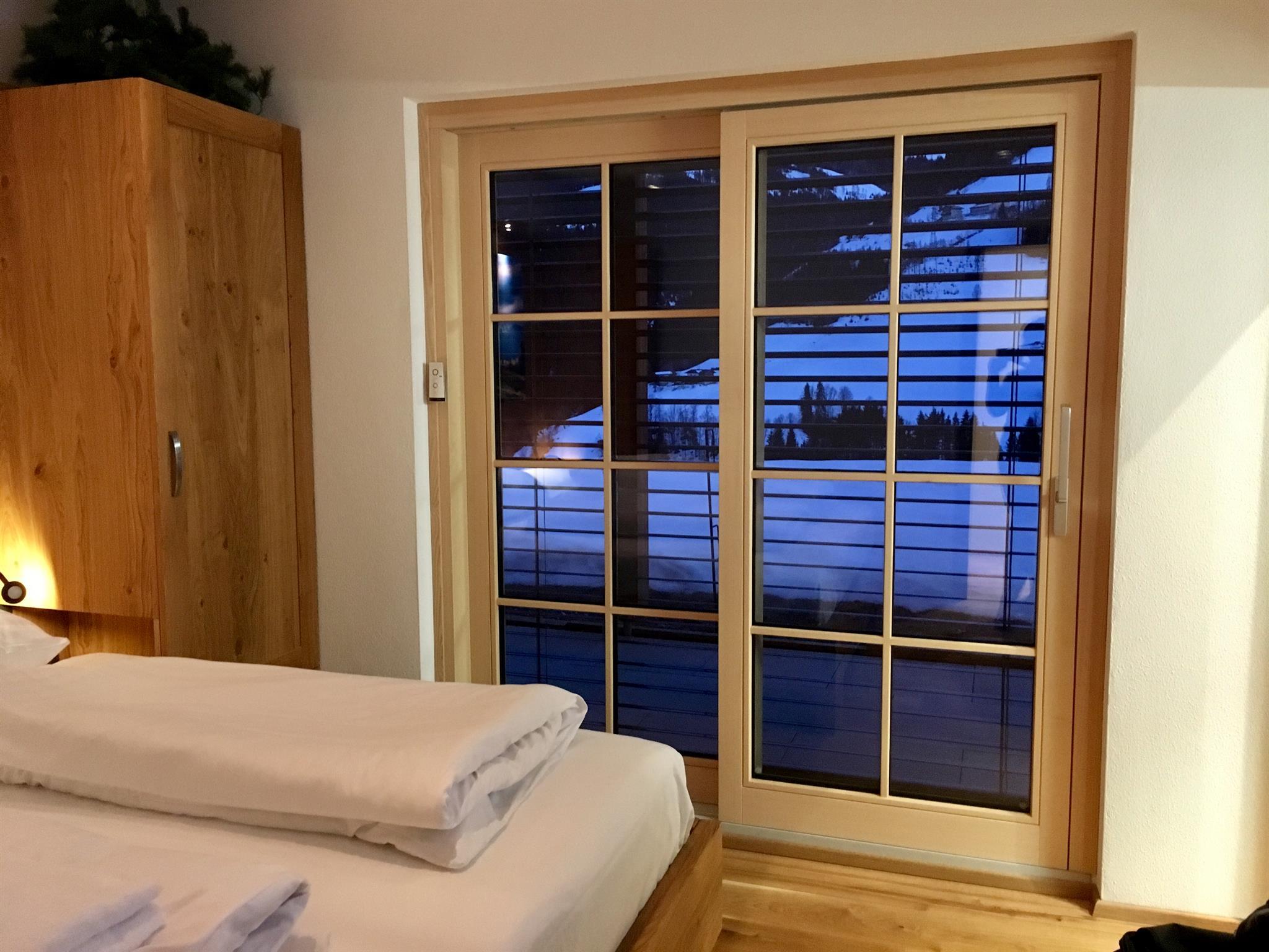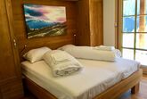 • Zirbensuite: Doppelbett und Einbauschränke zur Südseite offener Dusch/Waschbereich.