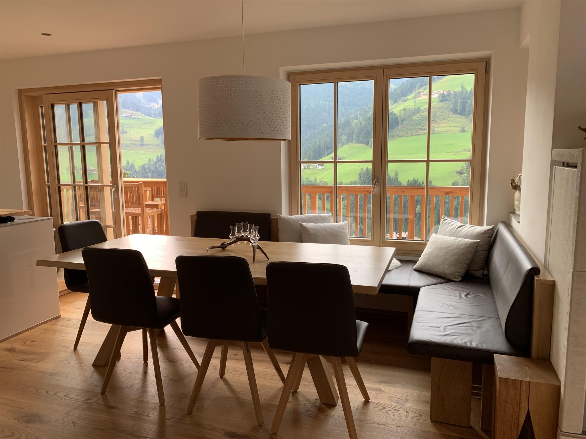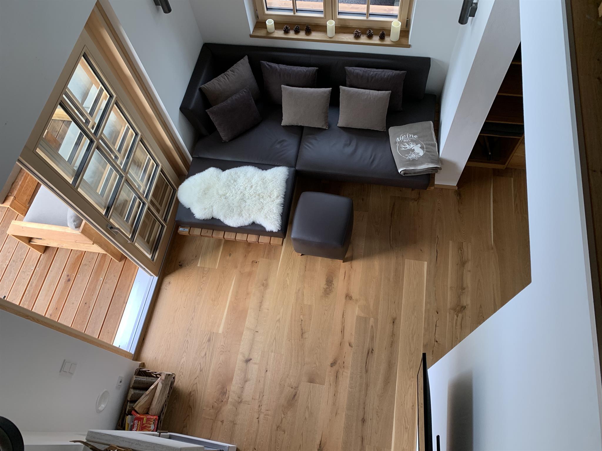 • Eingangsbereich mit Lederbank, Schrank, Hutablage, offener Wohnbereich mit großem Sofa, TV und freies W-lan, Esstisch mit Lederbank vor Holzkamin und großen Fensterfächen