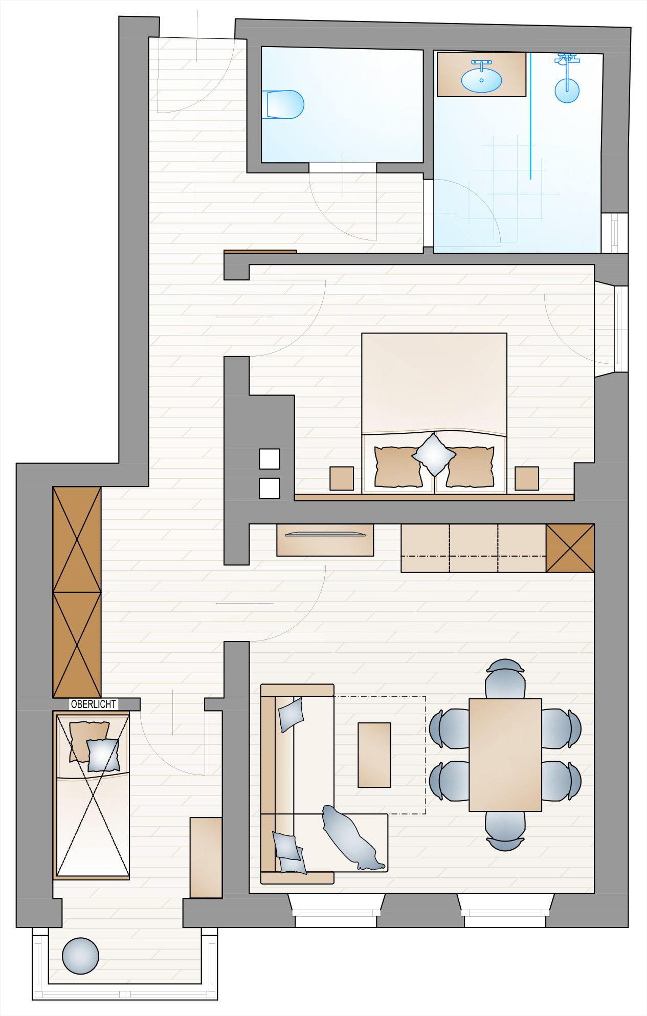 - 1 Wohnzimmer mit Doppelcouch (ausziehbar)
