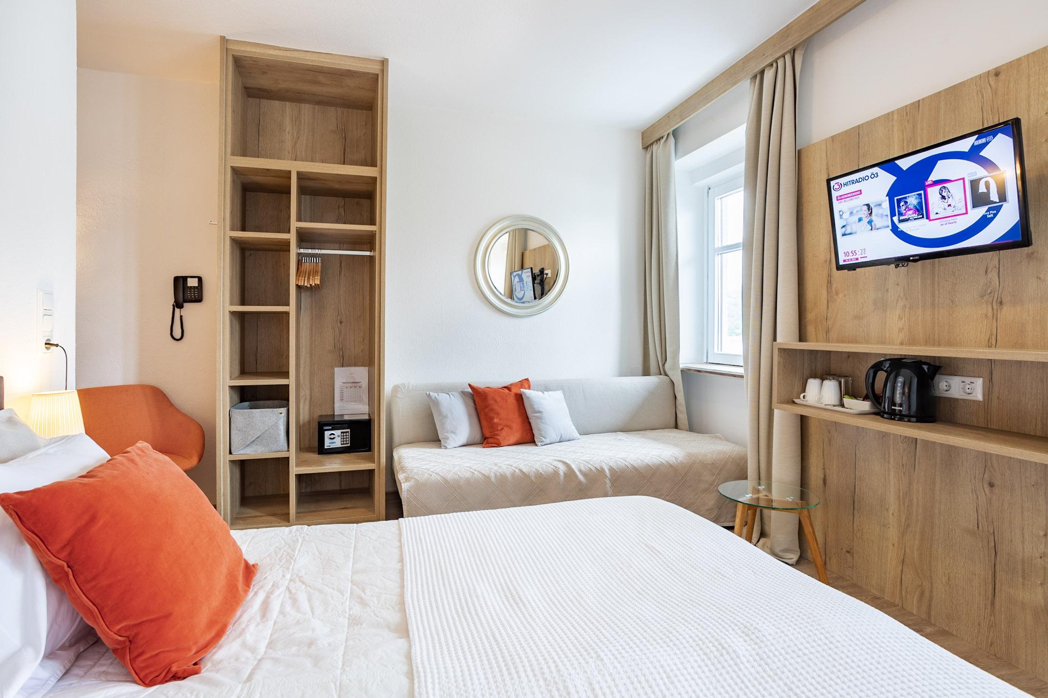 Boxspringbett 180x200cm, WLAN, Kabel TV, Safe, Wasserkocher | Bad mit Dusche, Haartrockner, Haarshampoo und Duschgel