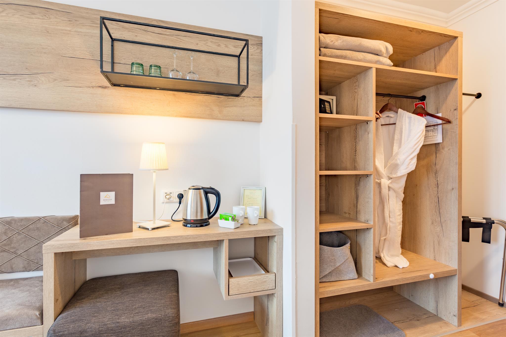 Liebevoll eingerichtete Zimmer mit Seeblick oder Bergblick, WLAN, Kabel TV, Safe. Gutes Frühstück in schönem Restaurant oder auf der Terrasse mit mediterranem Flair, Panorama - Sonnenterrasse mit Sonnenliegen.
