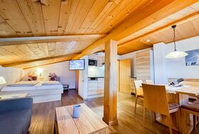 Dieses komfortable Appartement mit gemütlicher Mansarde bietet reichlich Platz für Familien oder Freunde und lädt zum Wohlfühlen ein. Der großzügige Wohnraum verfügt über eine voll ausgestattete Küche, eine ausziehbare Couch sowie ein Doppelbett – perfekt zum Entspannen und Beisammensein.