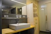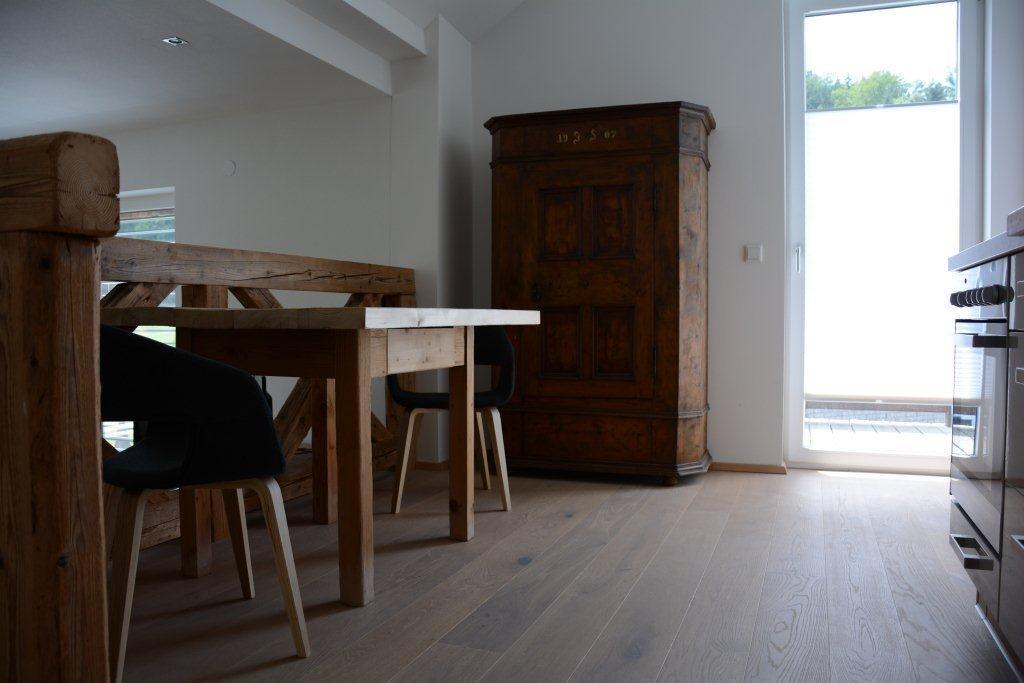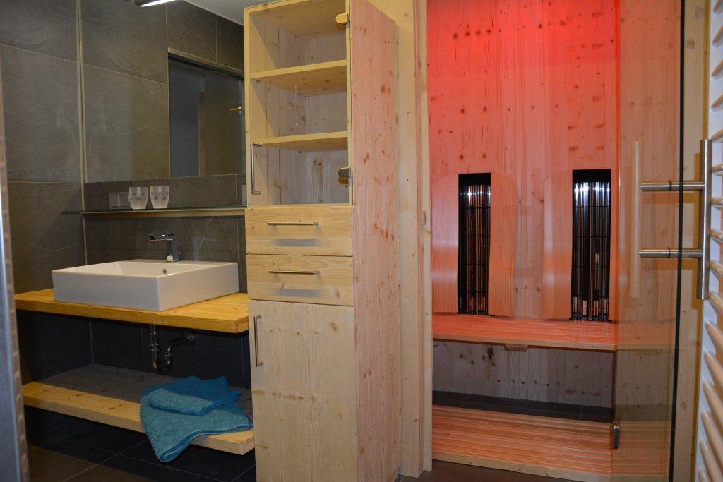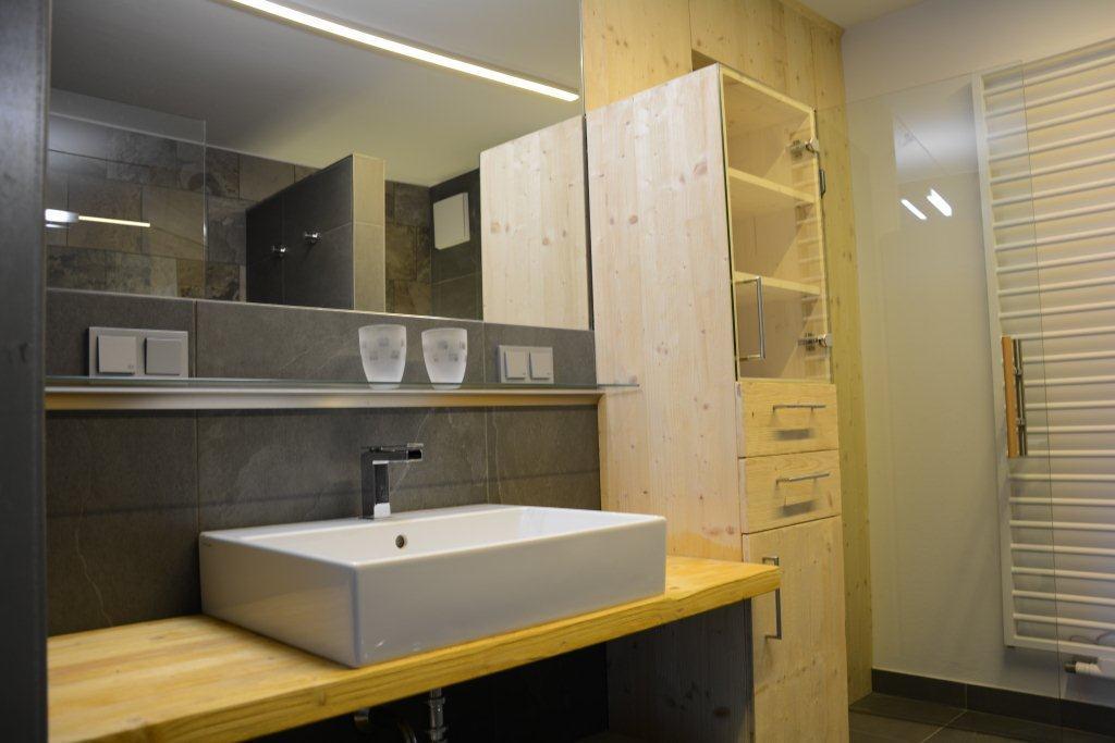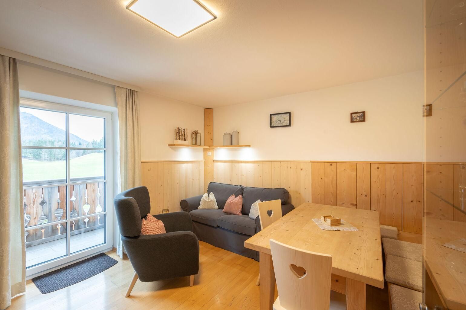 Es ist mit offener Küche im Wohnzimmer, 1 Schlafzimmer mit begehbarem Kleiderraum, einem Abstellraum, Bad, Doppelwaschbecken, Dusche, Wäremekabine und WC, Wohnzimmer mit TV und einer Schlafcouch für 2 Personen. Der Ost-Südbalkon lädt zum Sonnen ein.