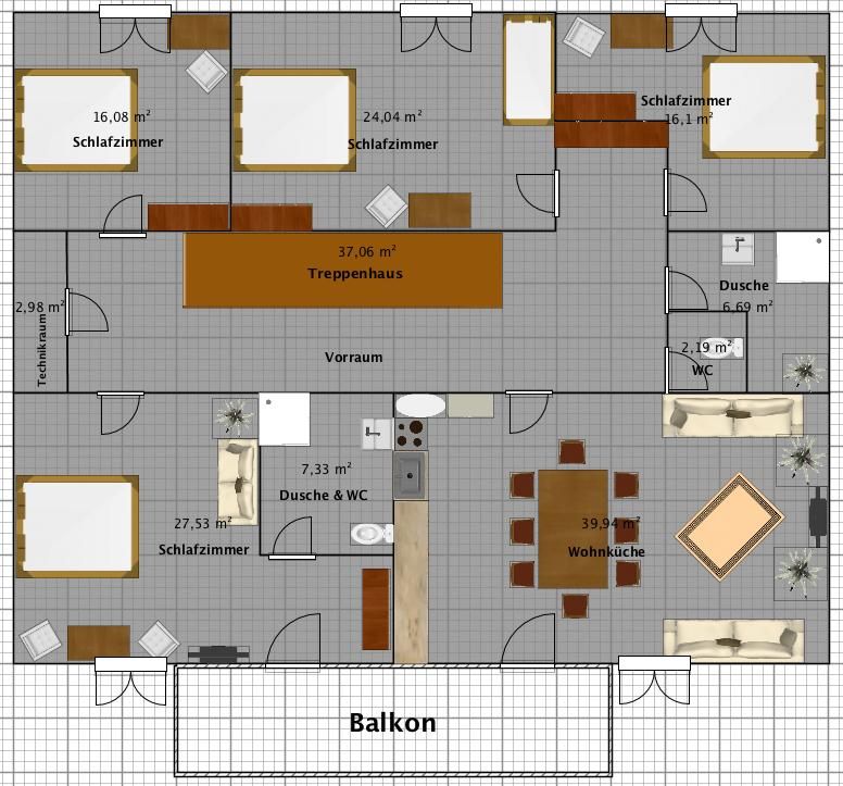 1 große Küche mit Esstisch/Flat-TV/Balkon