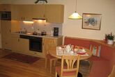 Doppelbettzimmer mit Bad und WC, kleine Küchenzeile mit Sitzecke im Raum, TV sowie Balkon.