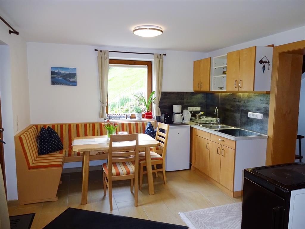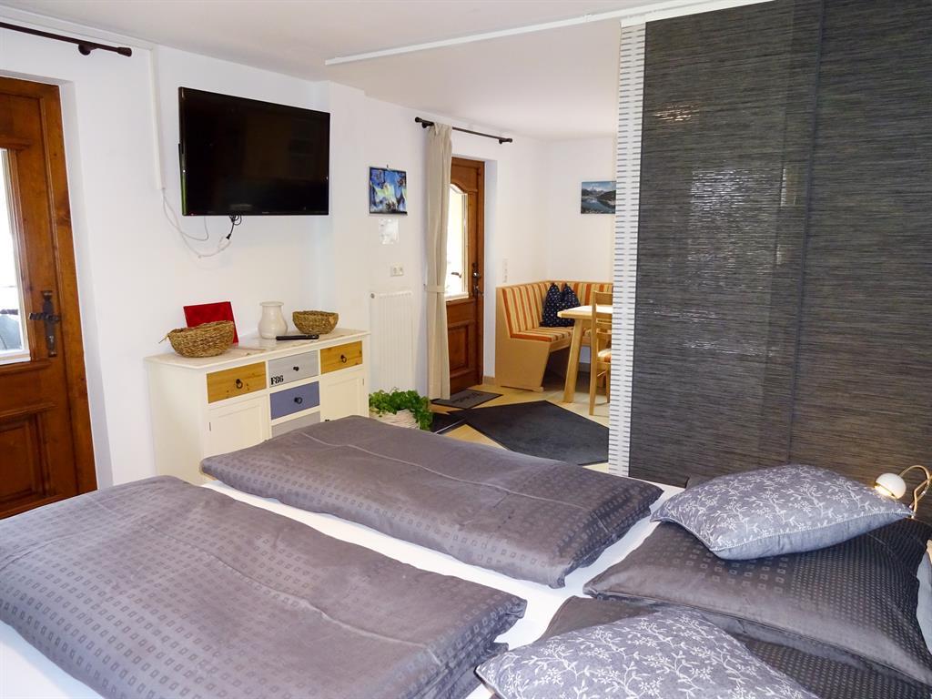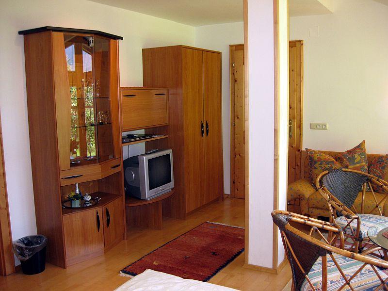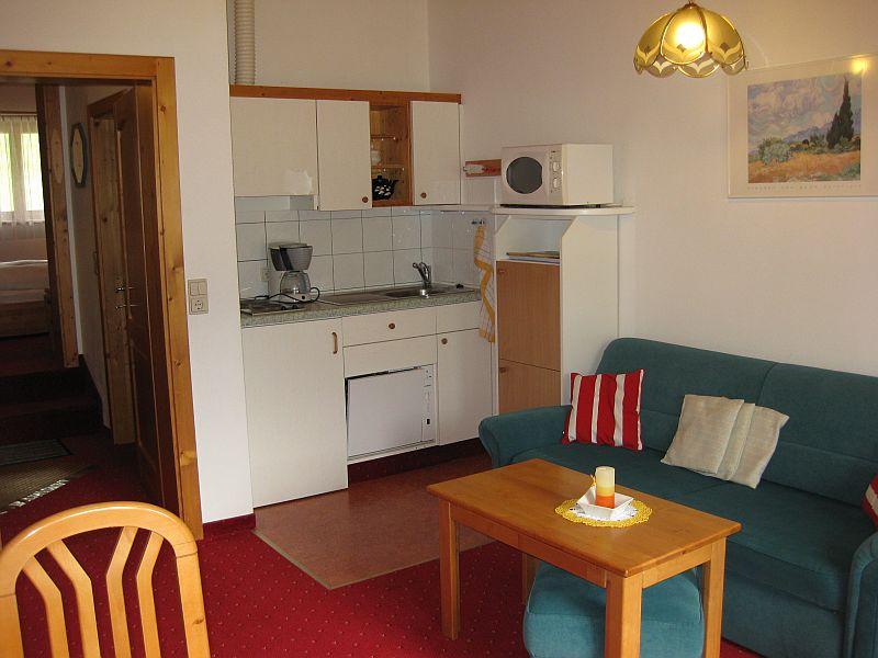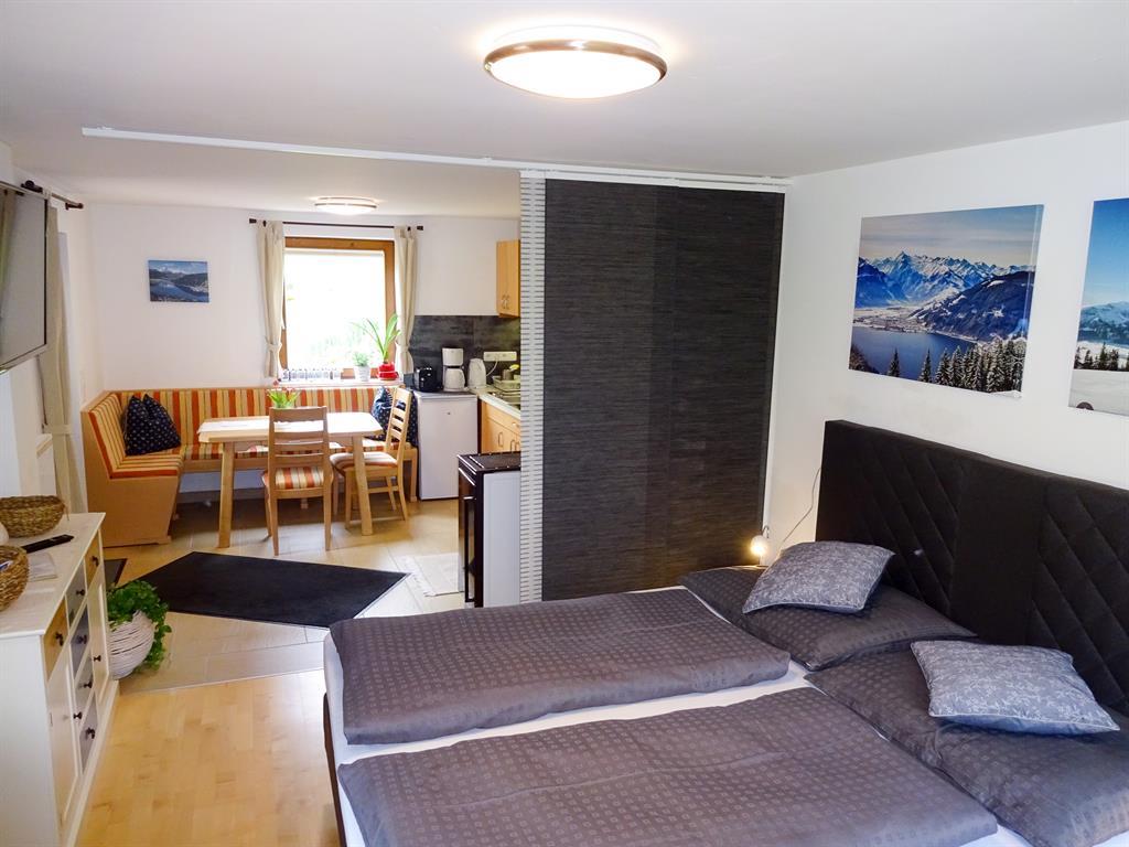 HAUS GANDLER-Studio Appartement, Ein Raum-Appartement 40 m2: 2 Personen (+max 1 Kind im Extrabett oder Kinderbett), Boxspringbett für 2 Personen (+Bettwäsche), Kleiderschrank, Raumteiler, schwenkbarer, großer TV, gemütliche Essecke mit Esstisch, kleine Küchenzeile (komplett mit Gläser, Geschirr, Besteck, Töpfe, Pfannen und Reinigungsutensilien ausgestattet), Kühlschrank, Cerankochplatte, Mikrowelle, Kaffeemaschine+Filterpapier, Wasserkocher, Vorraum mit Garderobe, DU/WC (WC-Papier, Hand- und Duschtücher vorhanden),  W-LAN, Gartenmöbel, Sonnenterrasse ebenerdig, Grillmöglichkeit, eigener, kostenloser Parkplatz, Trampolin (+Netz), beheizter Schuh- und Skiraum, Einstellmöglichkeit Fahrräder, Reinigungsservice (kostenlos) nach Aufenthaltsdauer