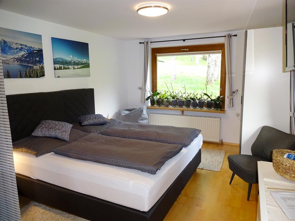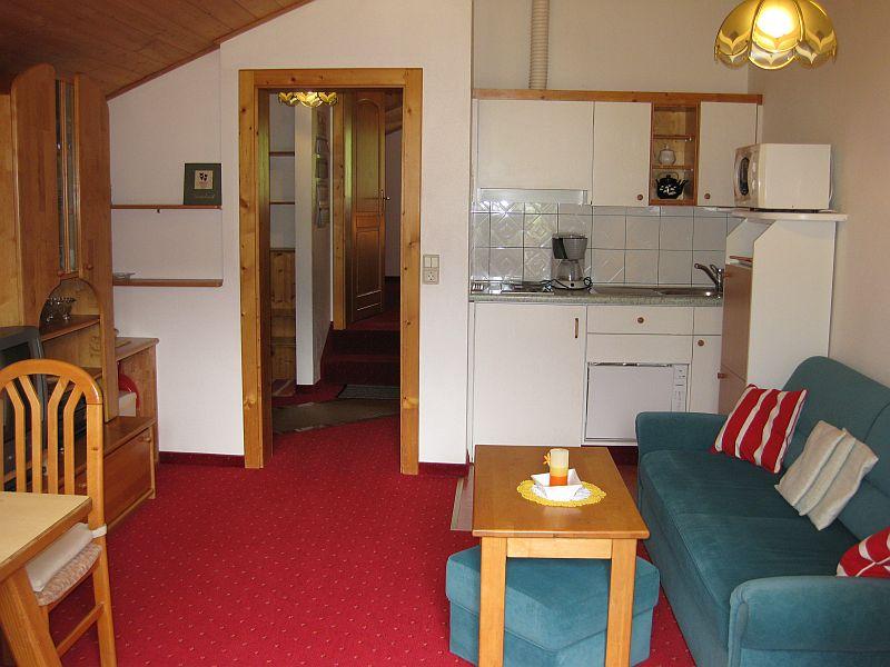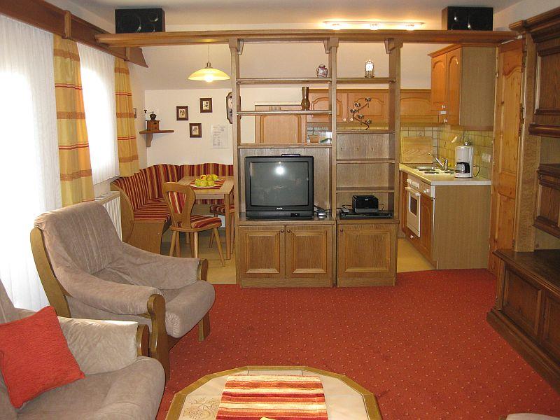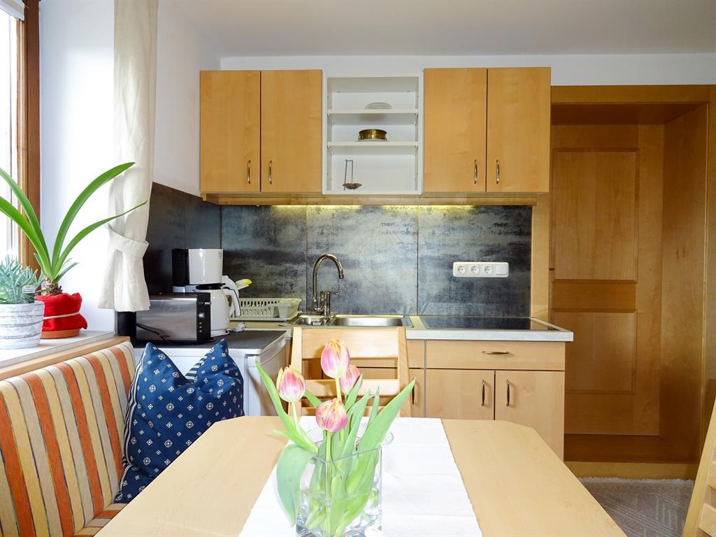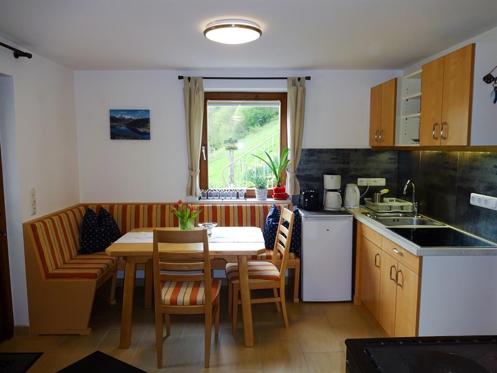 HAUS GANDLER-Studio Appartement, Ein Raum-Appartement 40 m2: 2 Personen (+max 1 Kind im Extrabett oder Kinderbett), Boxspringbett für 2 Personen (+Bettwäsche), Kleiderschrank, Raumteiler, schwenkbarer, großer TV, gemütliche Essecke mit Esstisch, kleine Küchenzeile (komplett mit Gläser, Geschirr, Besteck, Töpfe, Pfannen und Reinigungsutensilien ausgestattet), Kühlschrank, Cerankochplatte, Mikrowelle, Kaffeemaschine+Filterpapier, Wasserkocher, Vorraum mit Garderobe, DU/WC (WC-Papier, Hand- und Duschtücher vorhanden),  W-LAN, Gartenmöbel, Sonnenterrasse ebenerdig, Grillmöglichkeit, eigener, kostenloser Parkplatz, Trampolin (+Netz), beheizter Schuh- und Skiraum, Einstellmöglichkeit Fahrräder, Reinigungsservice (kostenlos) nach Aufenthaltsdauer