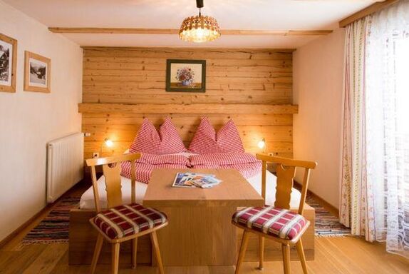 Almkammer: Im Doppelzimmer Almkammer können Sie den Panoramaausblick auf das Tennengebirge auch vom Balkon aus genießen. Zur Ausstattung gehören neben dem Doppelbett ein angenehmer Naturholzboden, ein Sitzbereich mit Tisch und zwei Sesseln sowie ein Waschbecken im Zimmer. Einzelzimmer-Belegung auf Anfrage gegen Aufpreis möglich.