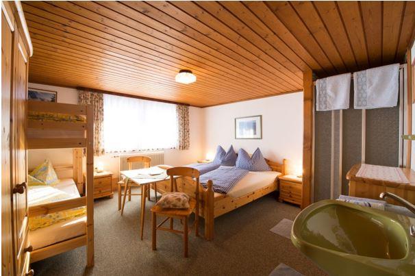 Das mit Blick auf Wiesen und Wälder nach Süden gelegene Familienzimmer Gerzkopf mit Doppelbett und Stockbett ist ideal für Familien mit zwei Kindern. Es ist mit einem Teppichboden ausgelegt, bietet eine Sitzecke mit Tisch und zwei Stühlen sowie eine eigene Duschkabine und ein Waschbecken. Einzelzimmer-Belegung auf Anfrage gegen Aufpreis möglich.