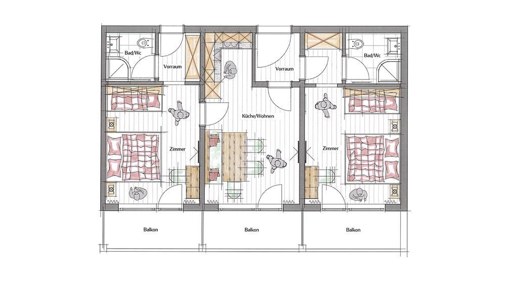 Das Appartement besteht aus 2 Schlafzimmern für je 2-4 Personen, 2 Badezimmern und einer großen Wohnküche. Die Wohnküche ist mit einem Flat-Screen-TV, großen Esstisch und Balkon ausgestattet. Die Küche verfügt über Kühlschrank, Geschirrspülmaschine, Microwelle, Kaffeemaschine, Wasserkocher, Backofen, sowie dem kompletten Geschirr. 2 Schlafzimmer mit Flat-Screen-TV, Schreibtisch, großen Ankleidespiegel und Balkon. 2 Badezimmer mit Dusche, WC, Haarföhn und Handtuchtrockner. Freies W-lan in der ganzen Wohnung.