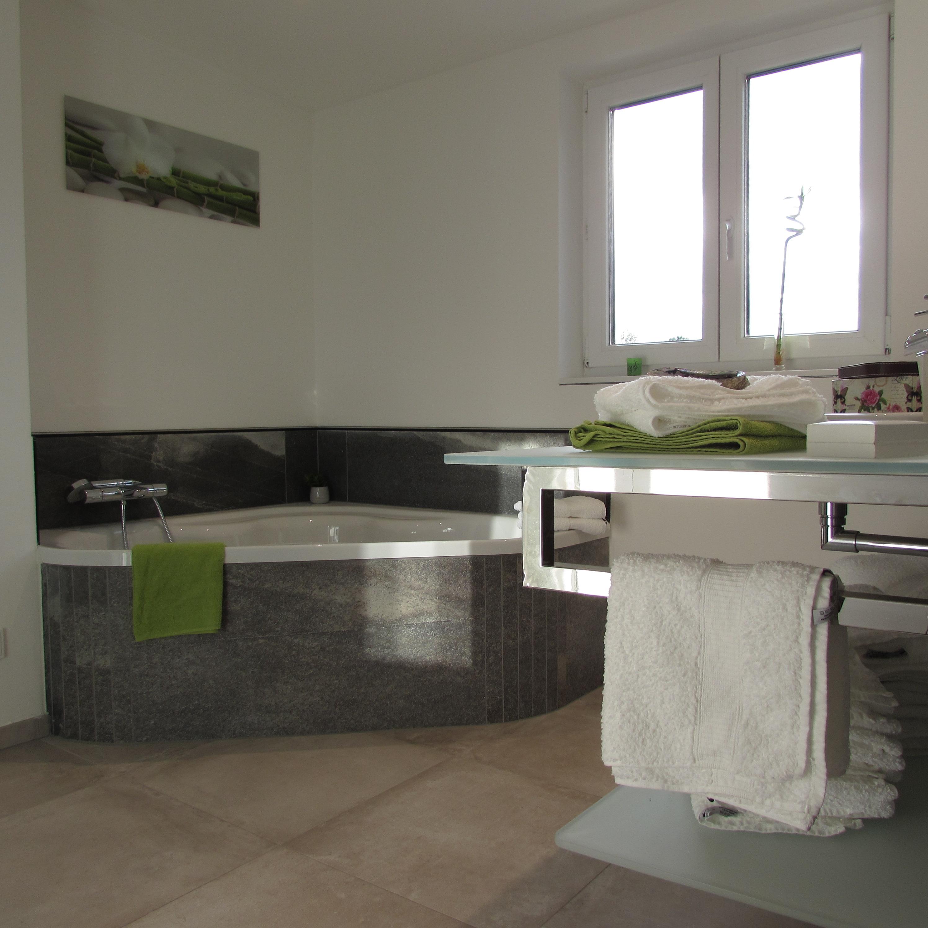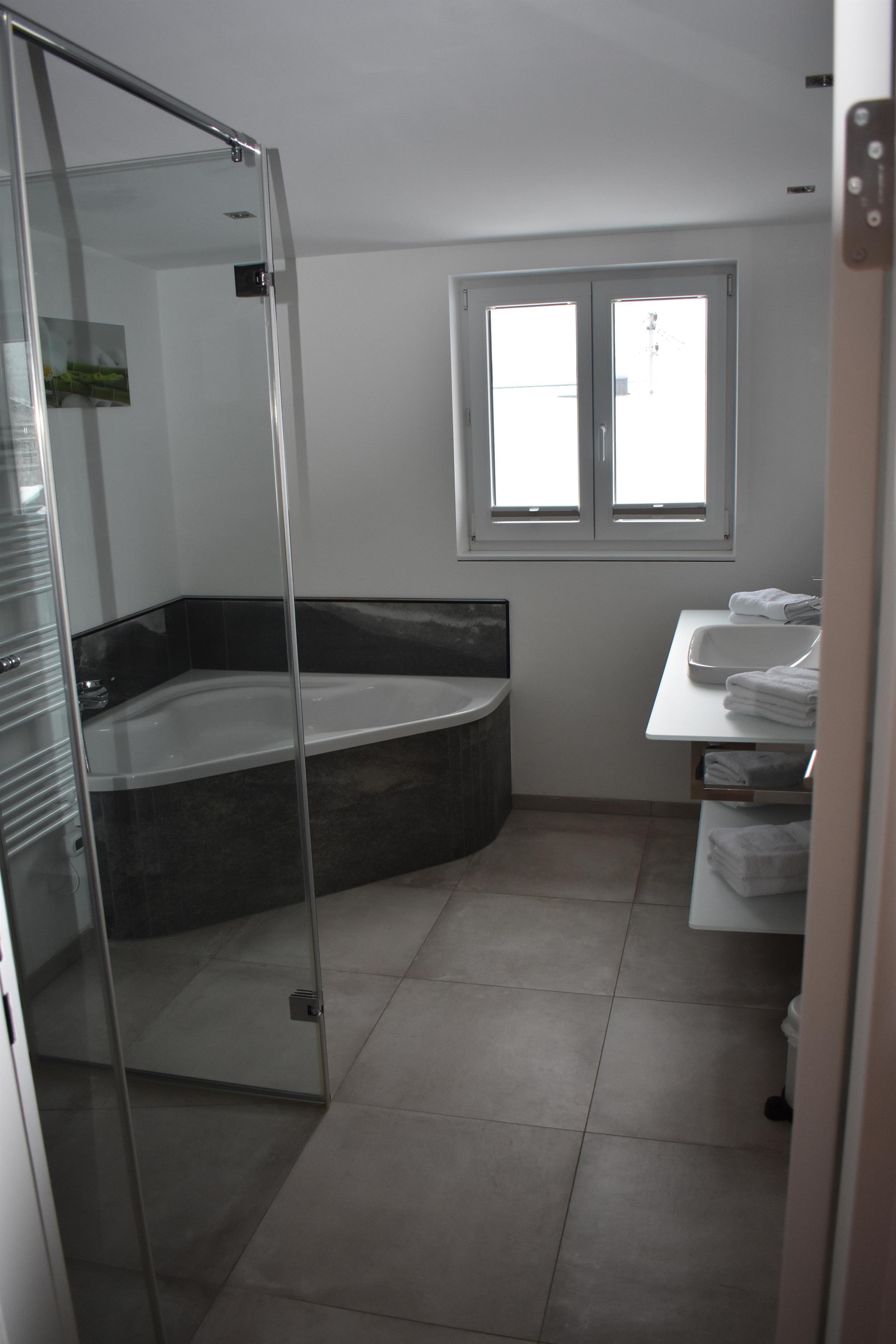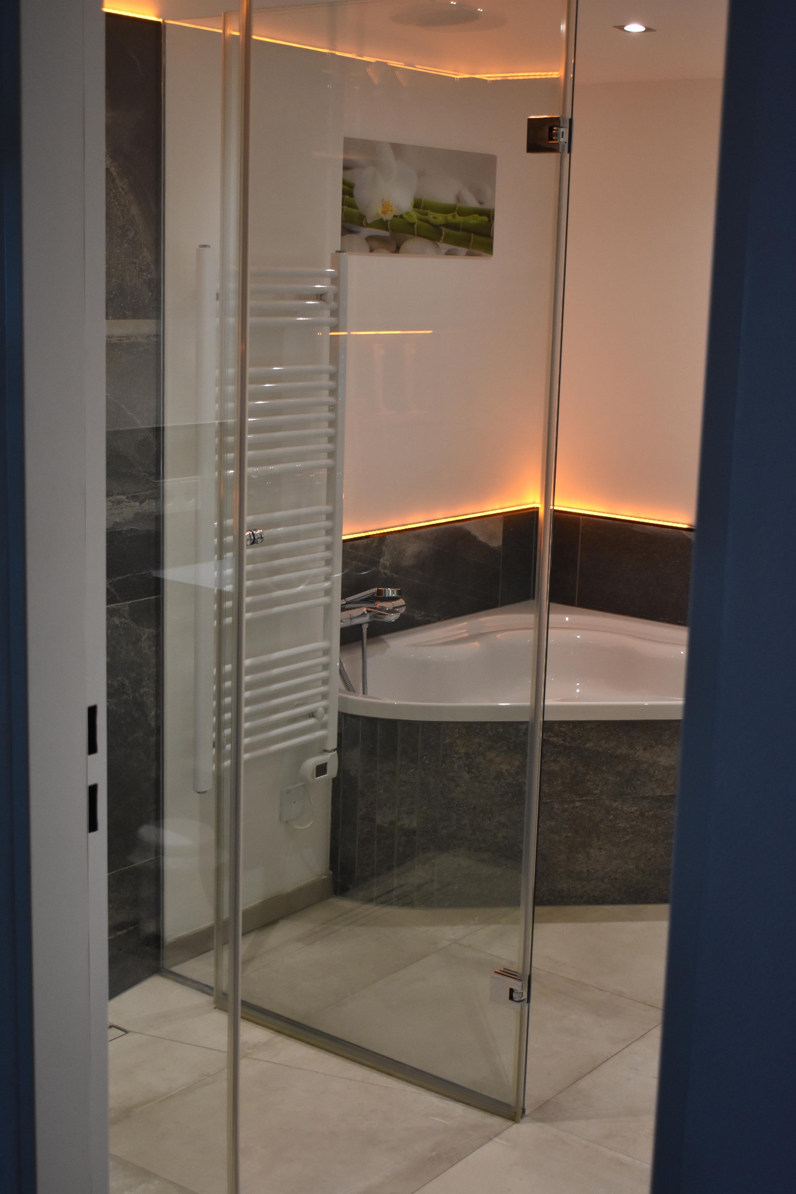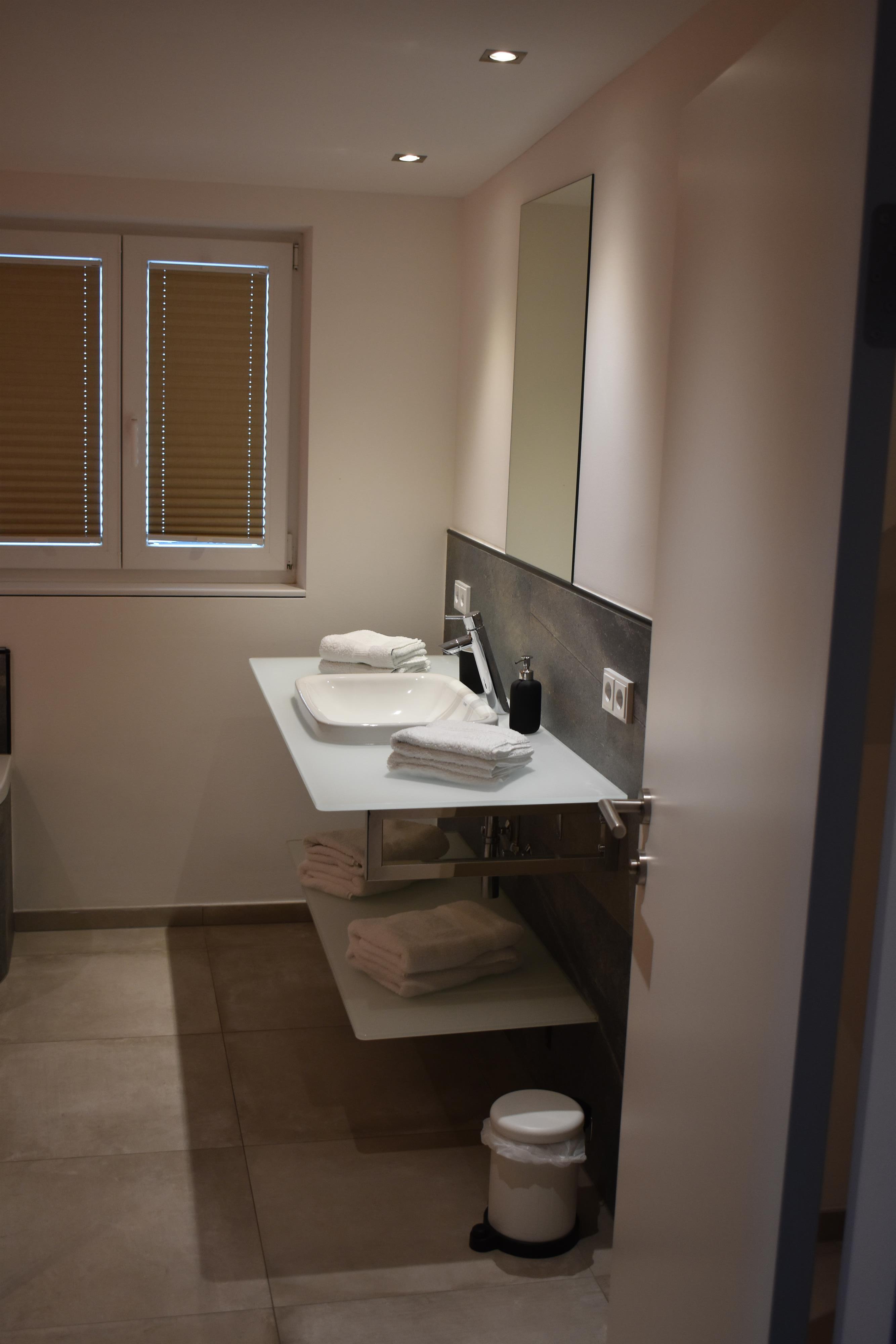 Das Badezimmer und das Schlafzimmer ist ausgestattet wie folgt: Handtücher, Bettwäsche, Badewanne, Dusche mit LED Beleuchtung.