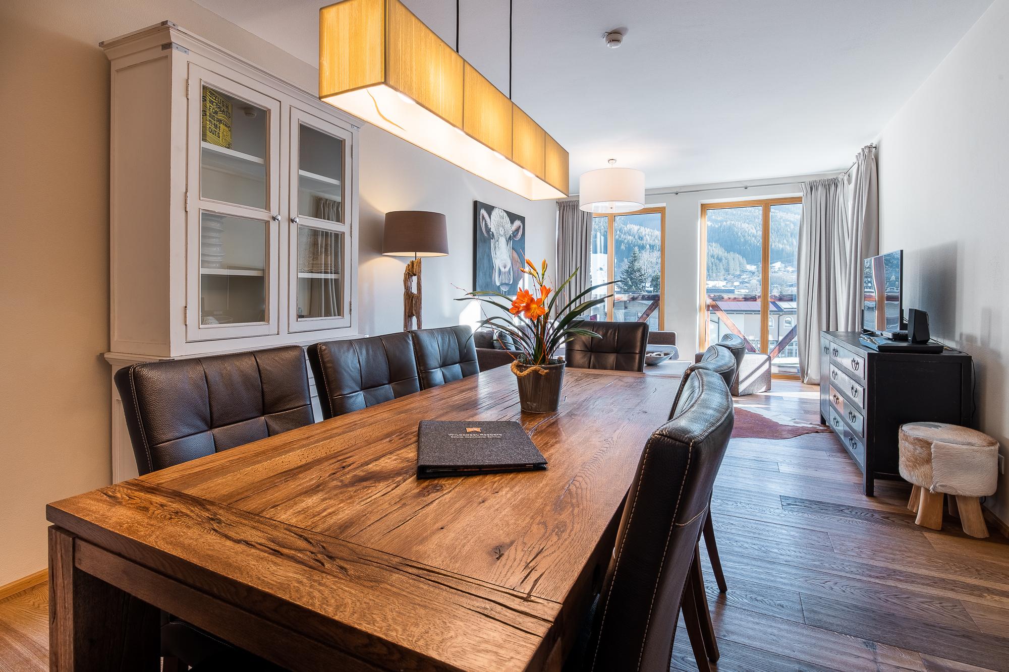 Alle Apartments und Penthouses der Wildkogel Resorts sind mit modernen Möbeln und traditionellen Materialien eingerichtet und verfügen über einen geräumigen Wohnbereich mit einem Flachbild-Sat-TV. Ihre Mahlzeiten können Sie in Ihrer modernen offenen Küchenzeile mit einem Essbereich zubereiten und genießen.