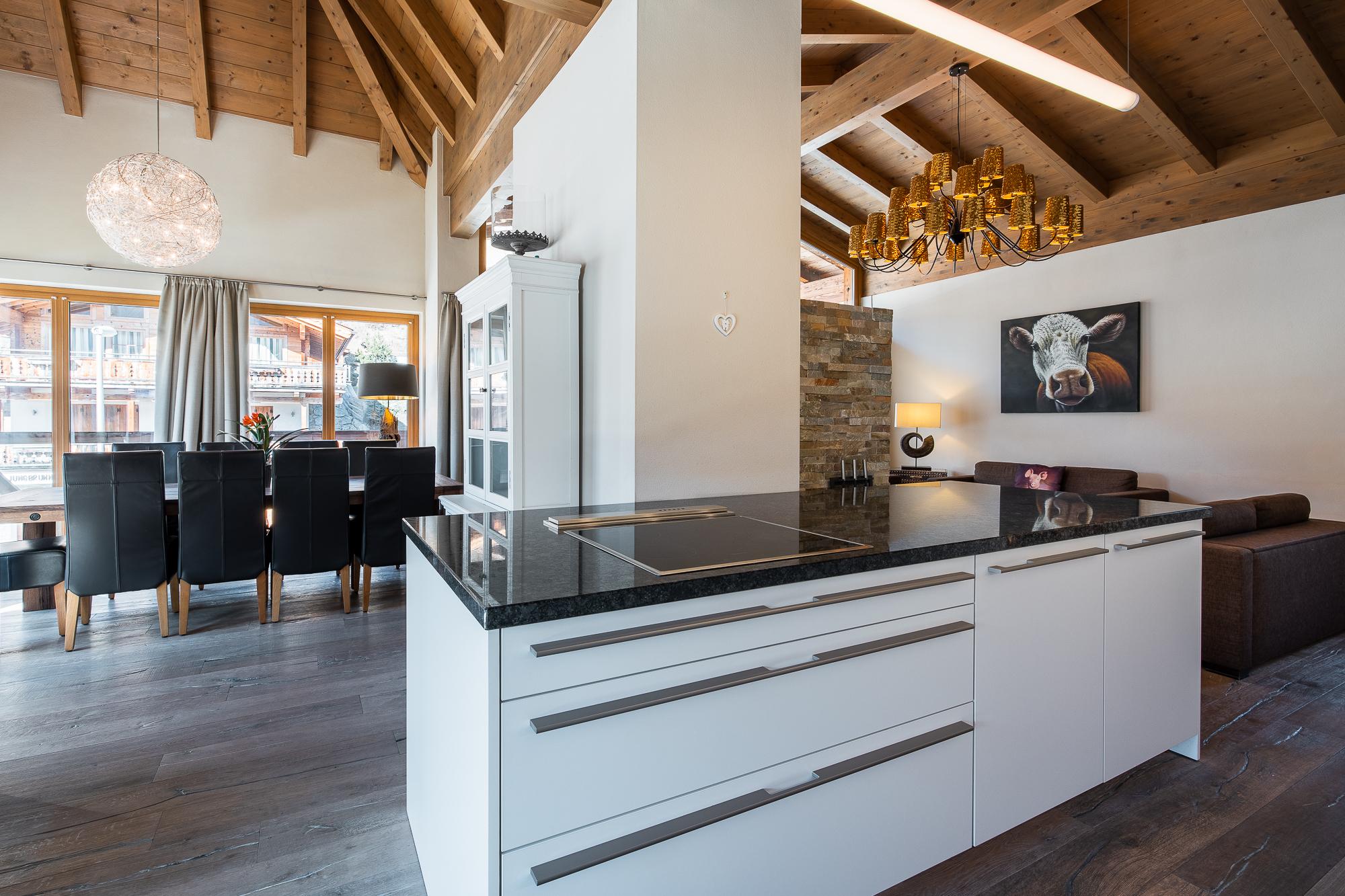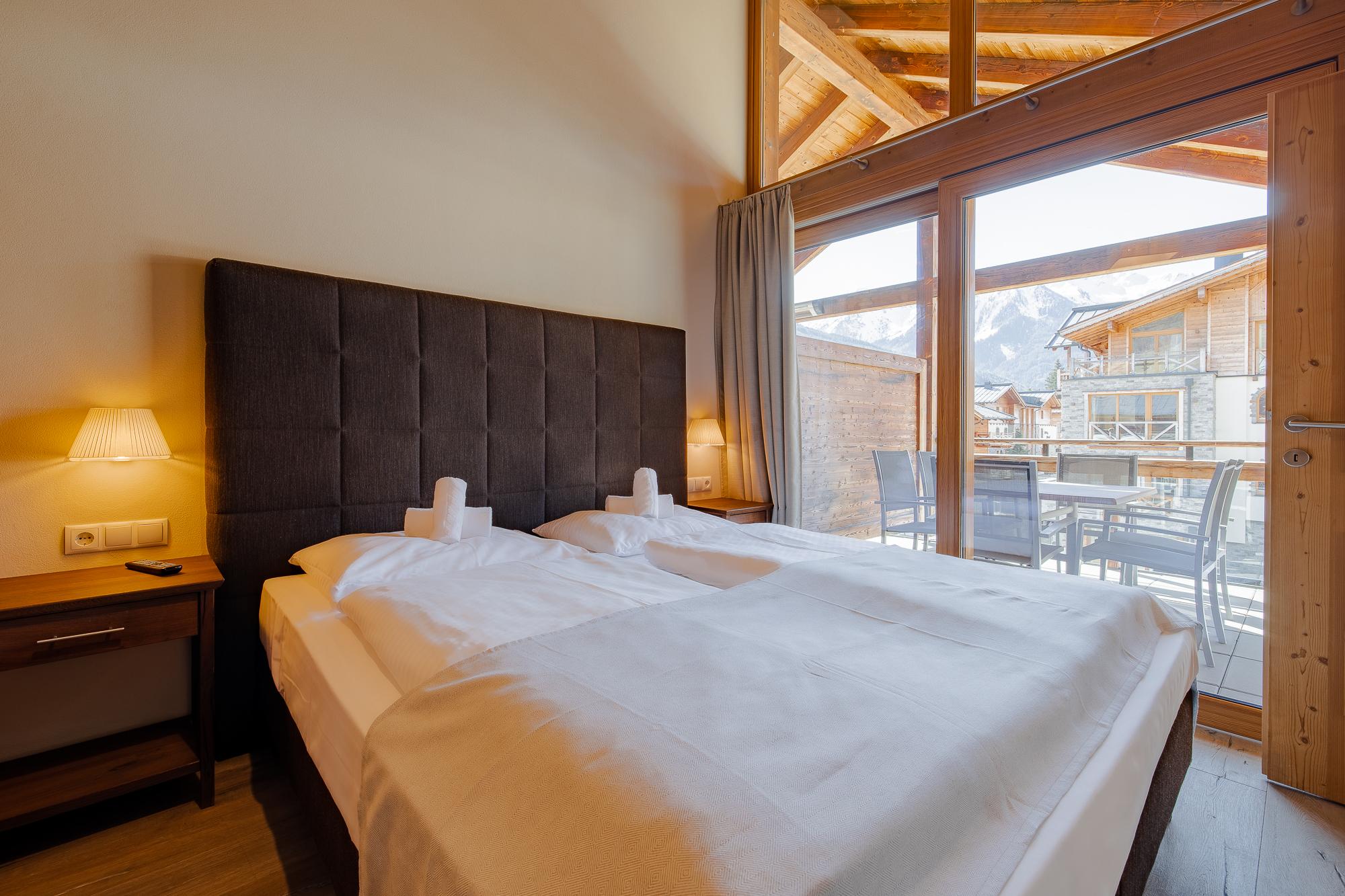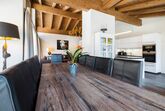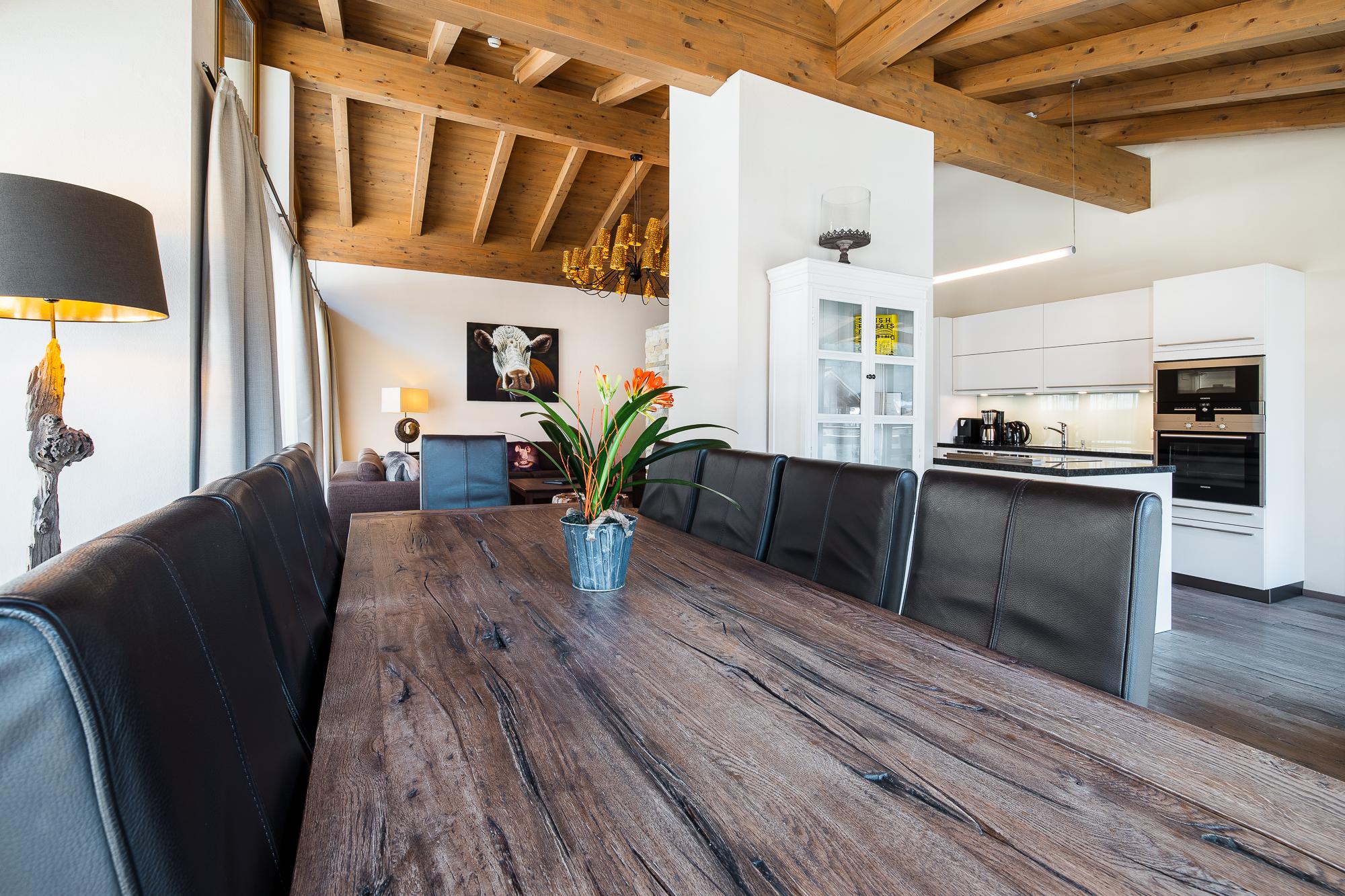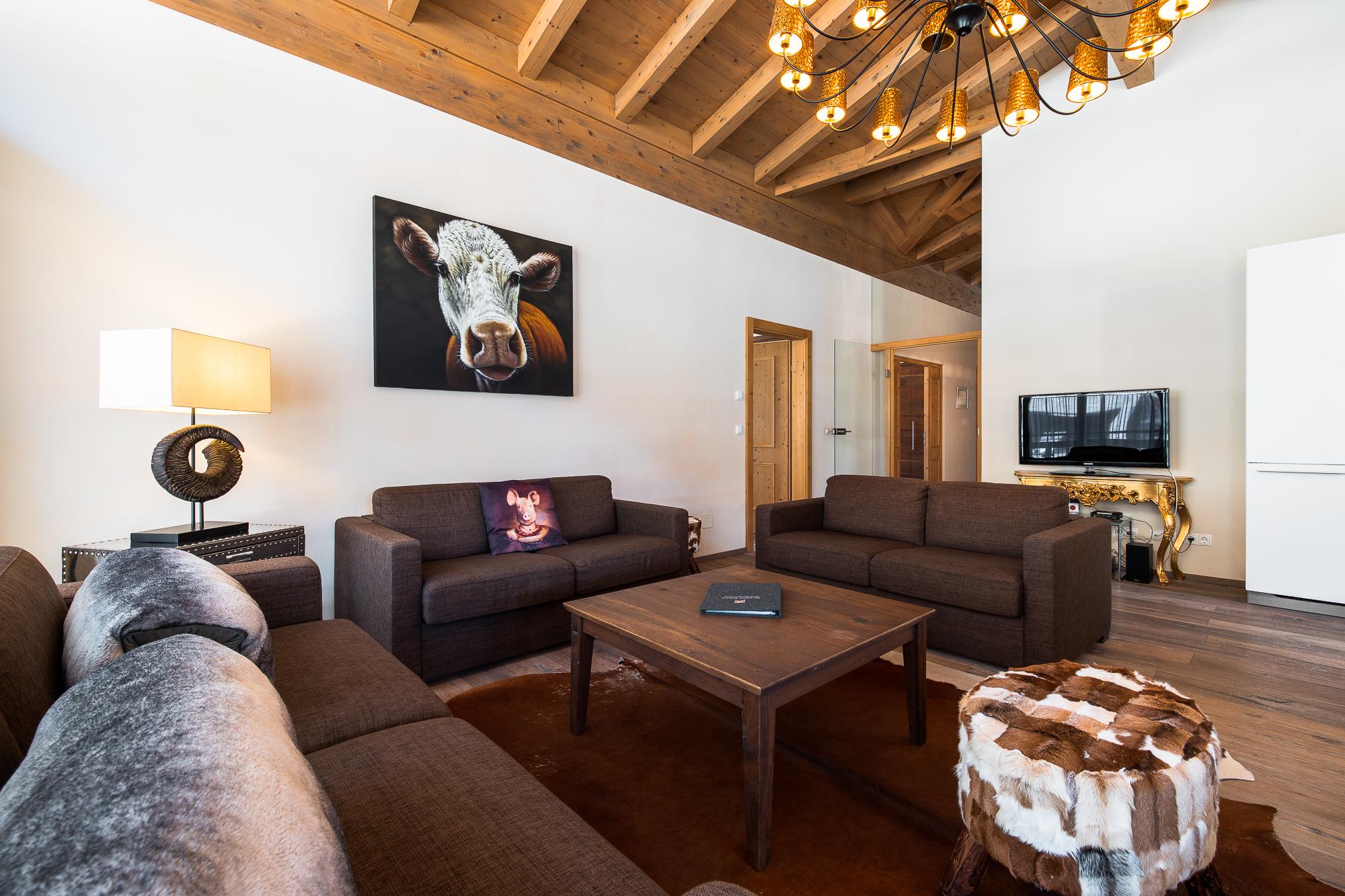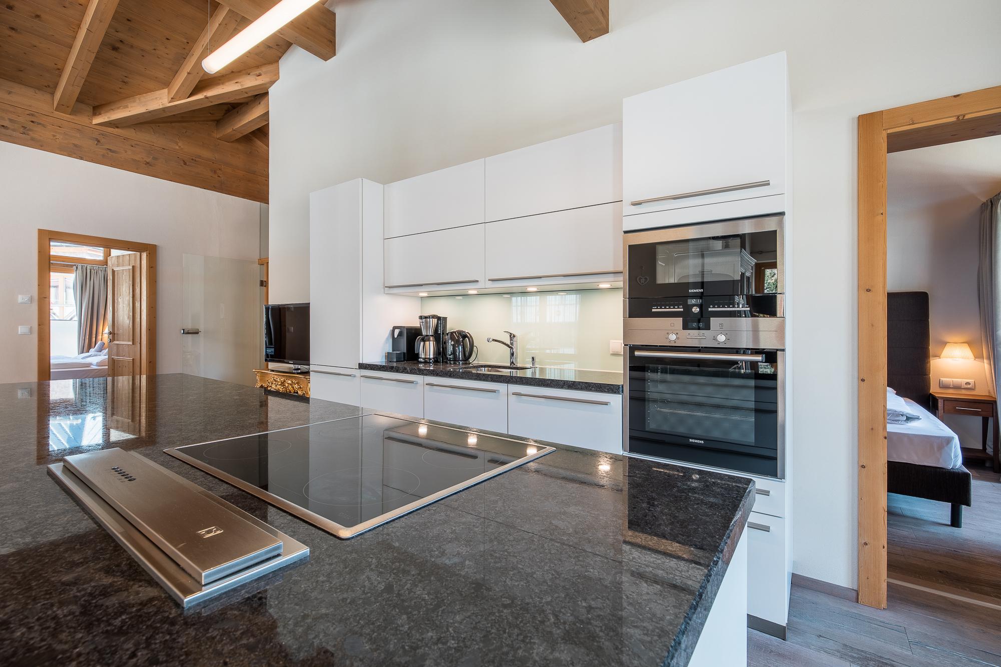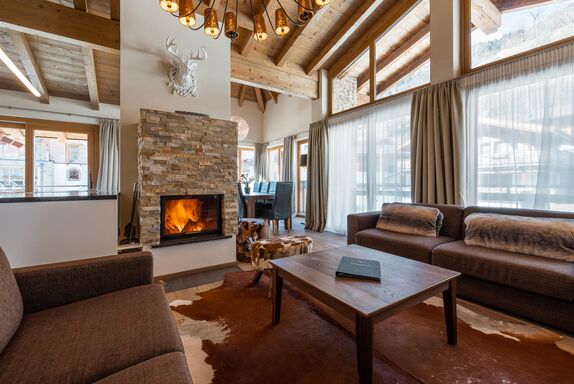 Das exquisite und stilvolle Penthouse liegt direkt unter dem Holzdach des Gebäudes und bietet eine Terrasse/Balkon mit herrlichem Blick auf den Nationalpark Hohe Tauern. Der geschmackvoll gestaltete Wohnbereich ist mit einem Kamin, LCD Flat-TV und teilweise einer komfortablen Schlafcouch für 2 Personen ausgestattet. Das Penthouse verfügt über kostenloses WLAN. Die hochwertige, offene Küche mit Kochinsel bietet viel Komfort und ist neben Markengeräten auch noch mit Wasserkocher, Filterkaffee- und Espressomaschine, Toaster, Küchenutensilien und Geschirr ausgestattet. Die 3 Schlafräume mit je einem King Size-Boxspringbett verfügen alle über Flat-TV. Außerdem gibt es 3 hochwertige Badezimmer mit Badewanne/Dusche.