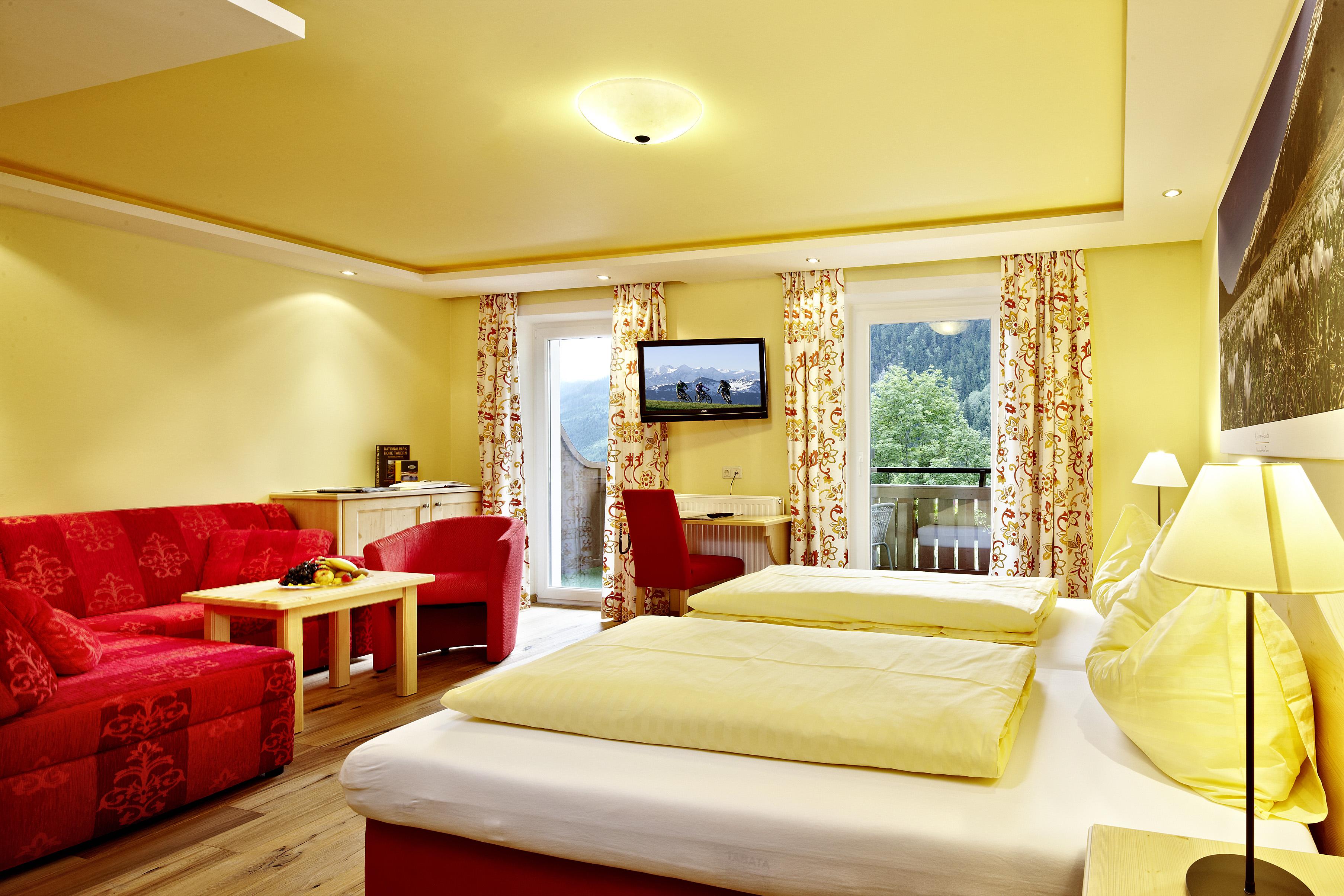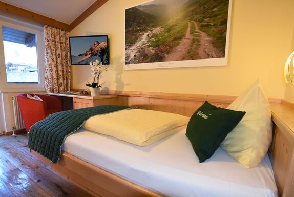 Die Einzelzimmer sind mit heimischem Fichtenholz und edlen Stoffen eingerichtet. Sie verfügen über Balkon, Internetanschluss, Flat-TV, Kühlschrank und Zimmer-Safe. Im Badezimmer sind Föhn und Kosmetikspiegel vorhanden.