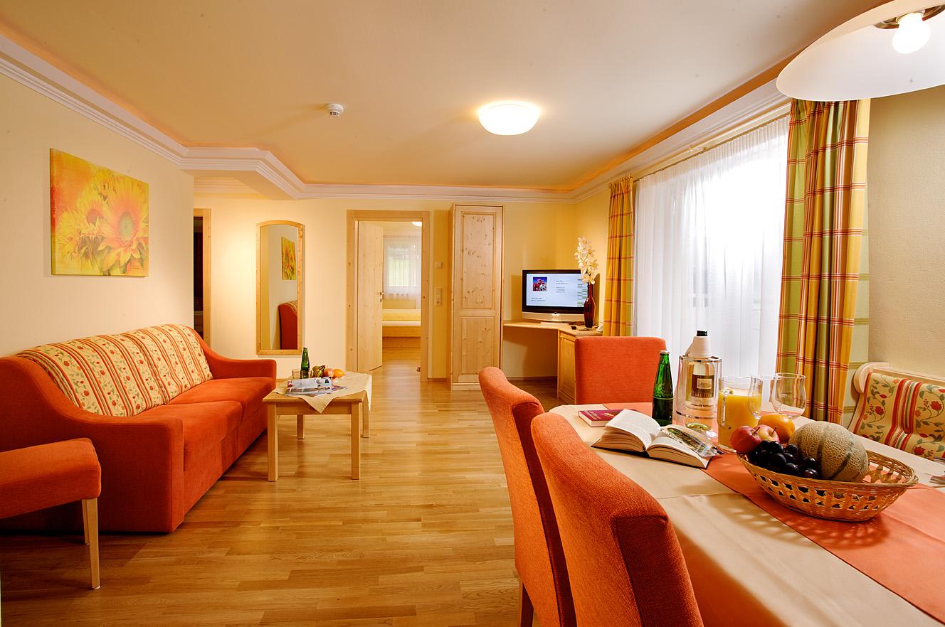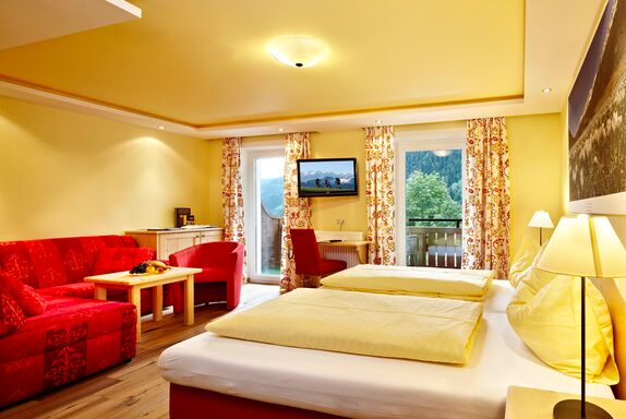 Die Familienzimmer sind mit heimischem Fichtenholz und edlen Stoffen in warmen, harmonischen Farben eingerichtet. Sie verfügen über Balkon, Internetanschluss, Flat-TV, Kühlschrank und Zimmer-Safe. Im Bad sind Föhn und Kosmetikspiegel vorhanden.