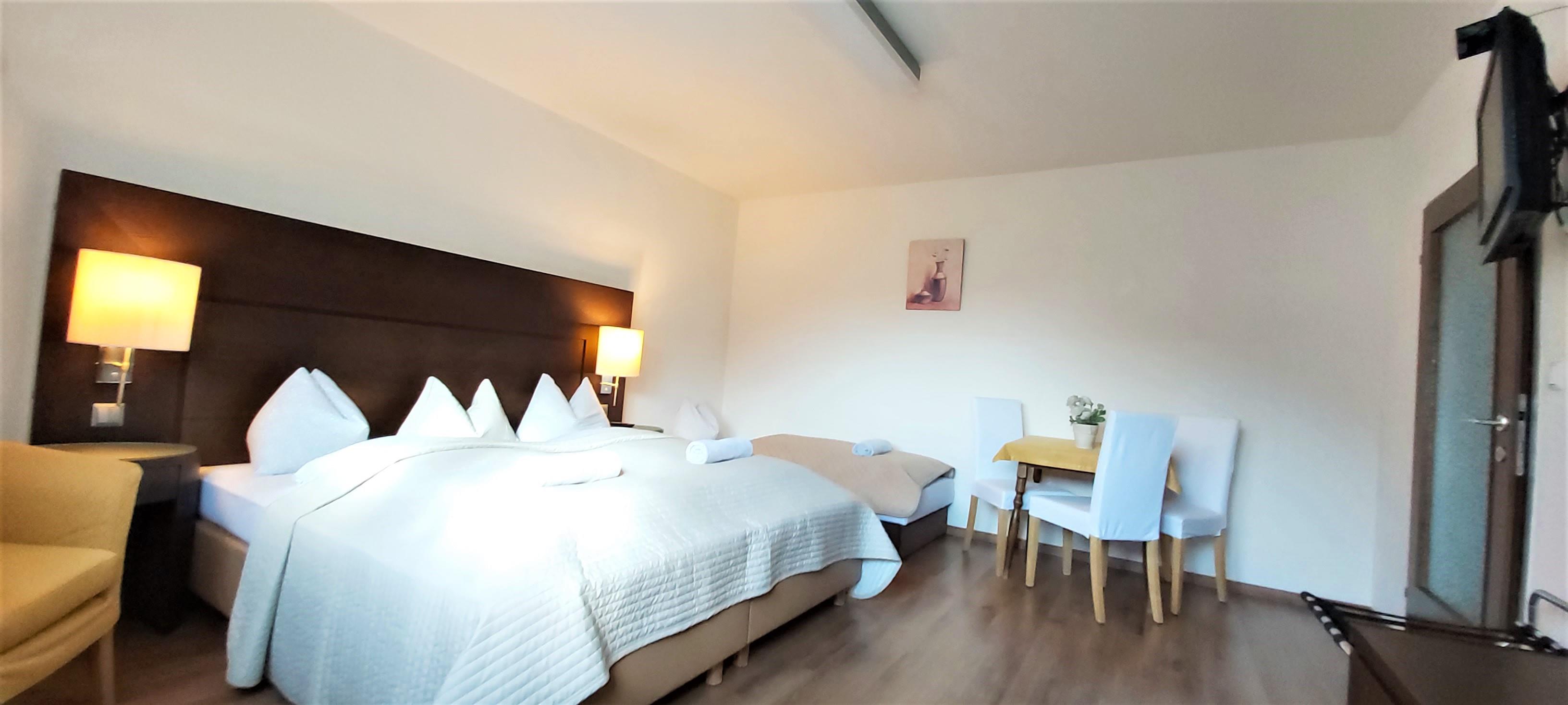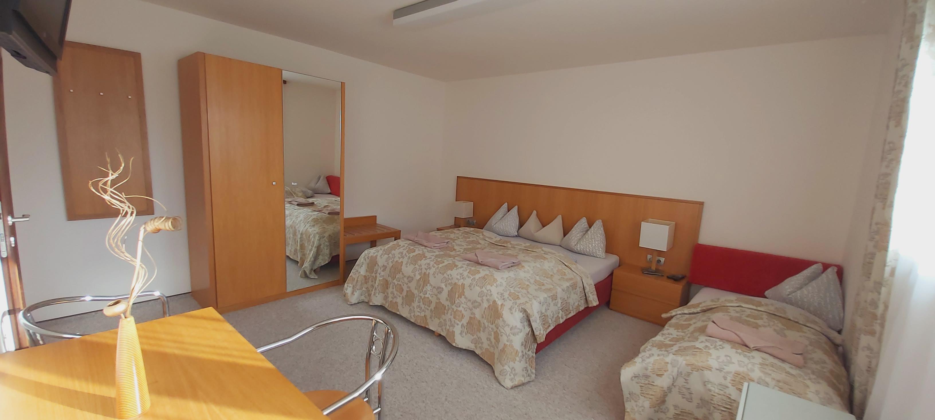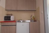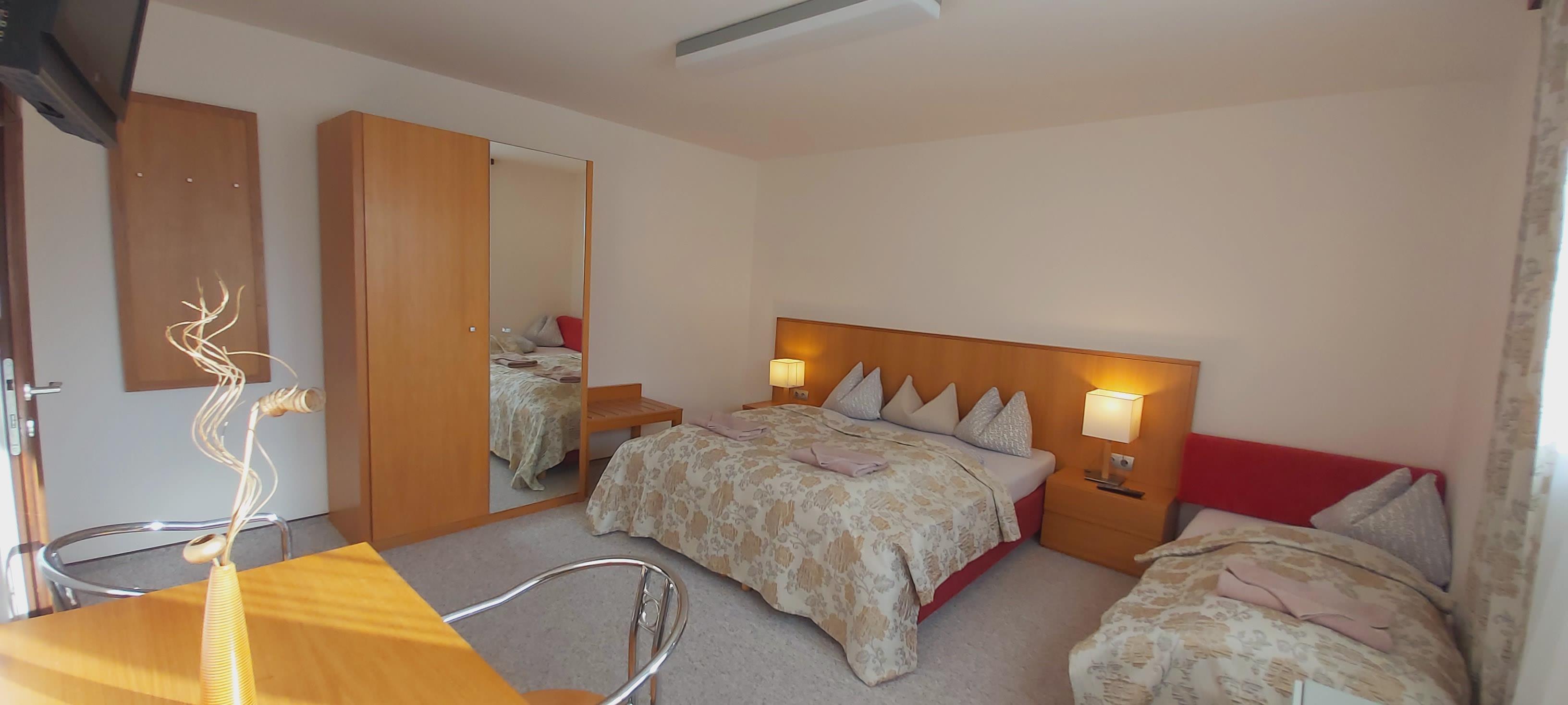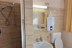 3 Personen Studio, ein Schlafzimmer mit Doppelbett und Einzelbett, eigene kleine Küche und Badezimmer mit Duschkabine
