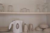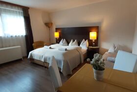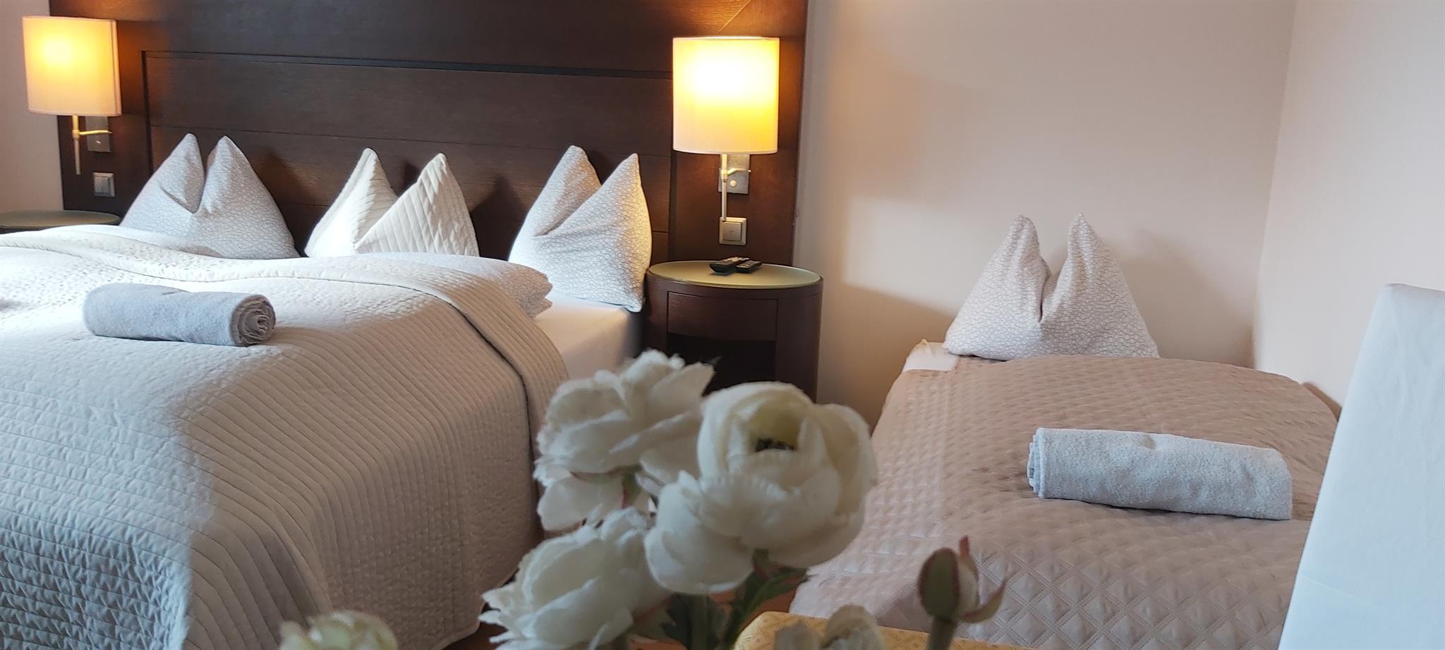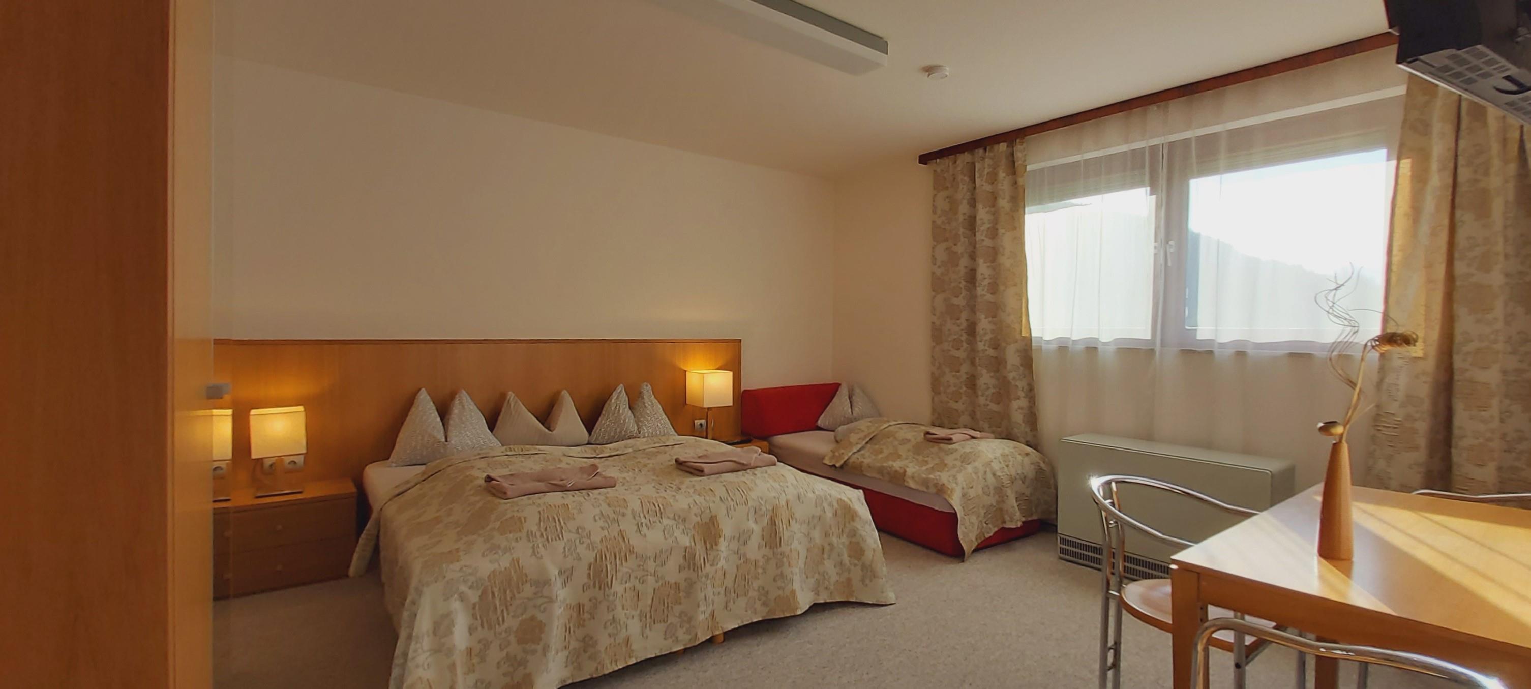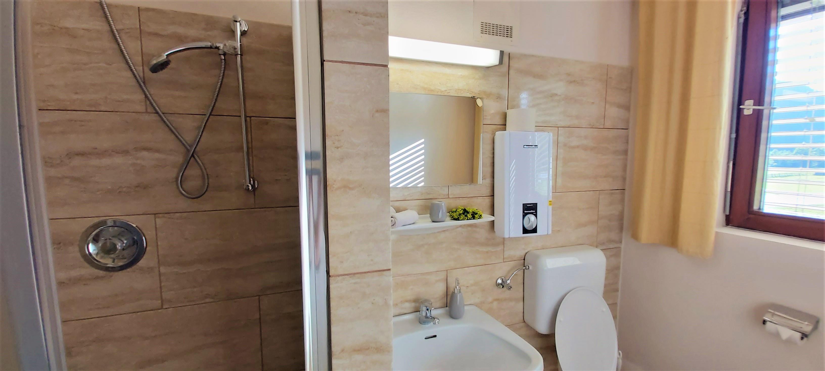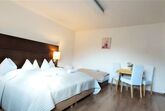 3 Personen Studio, ein Schlafzimmer mit Doppelbett und Einzelbett, eigene kleine Küche und Badezimmer mit Duschkabine