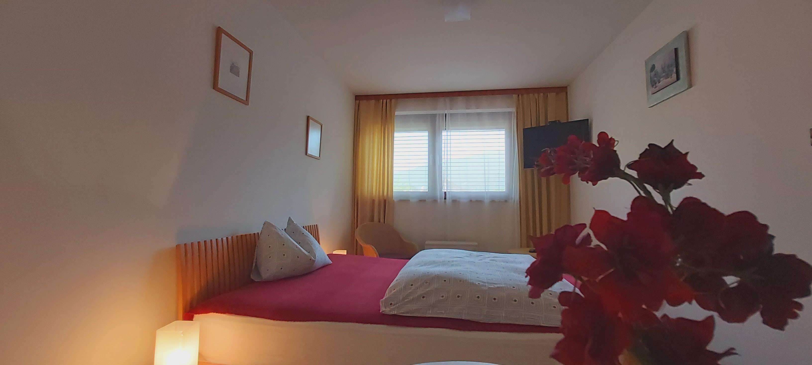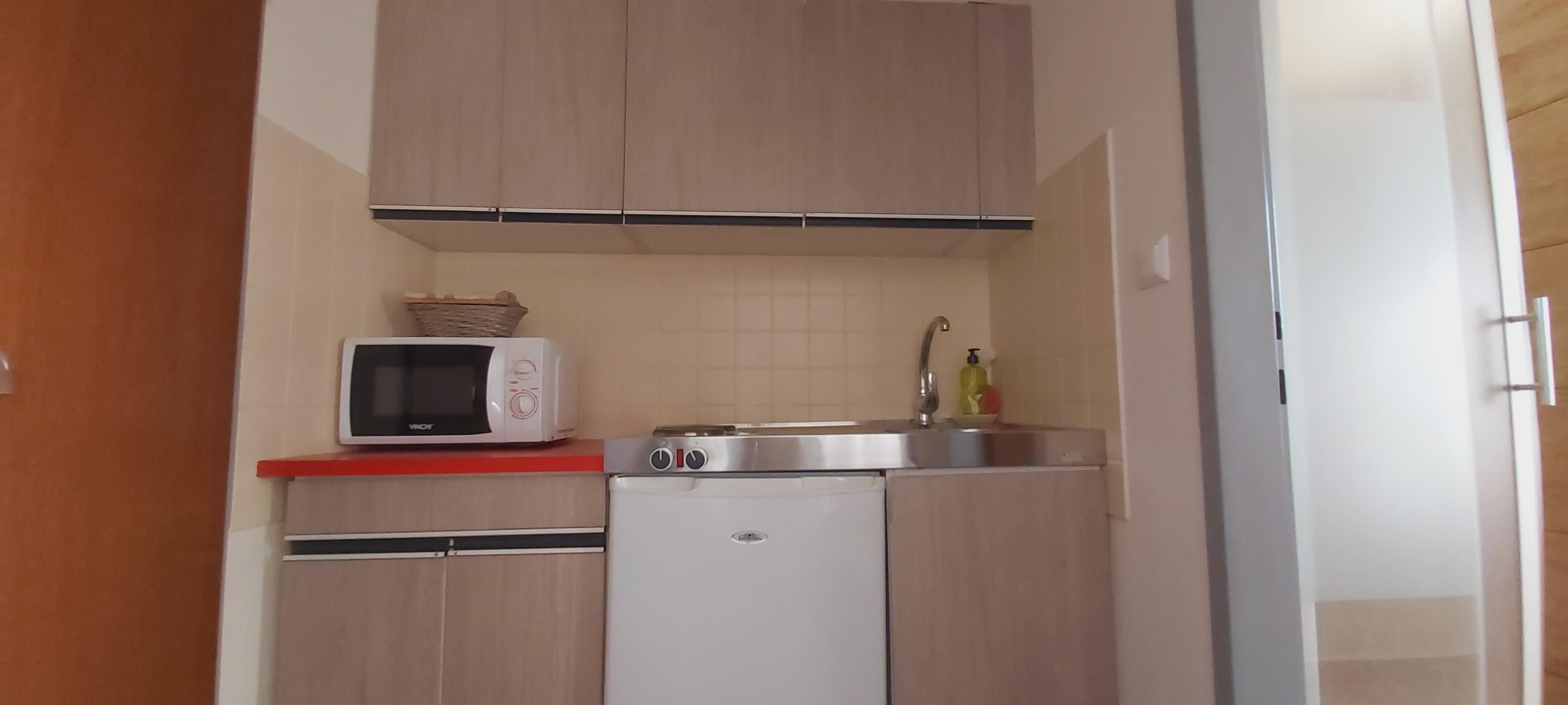 1 Schlafzimmer mit Doppelbett, Tisch und Stühle, Bad mit Dusche, 1 Küchenzeile (Kitchenette) mit Elektroherd mit 2 Plätzen, Kühlschrank, Kaffeemaschine, Mikrowelle, Geschirr, Besteck