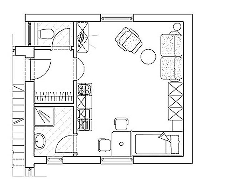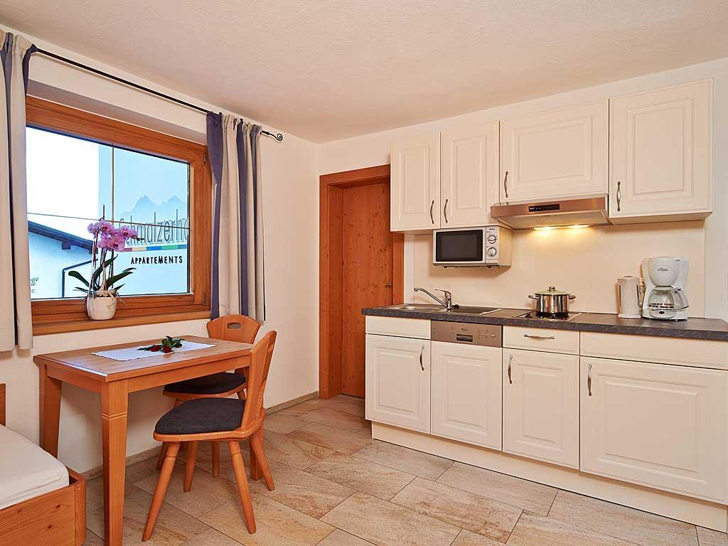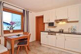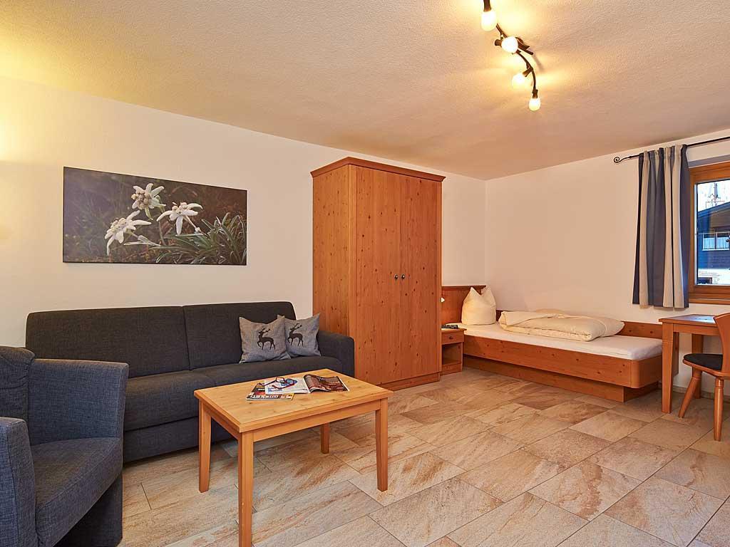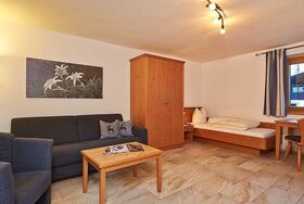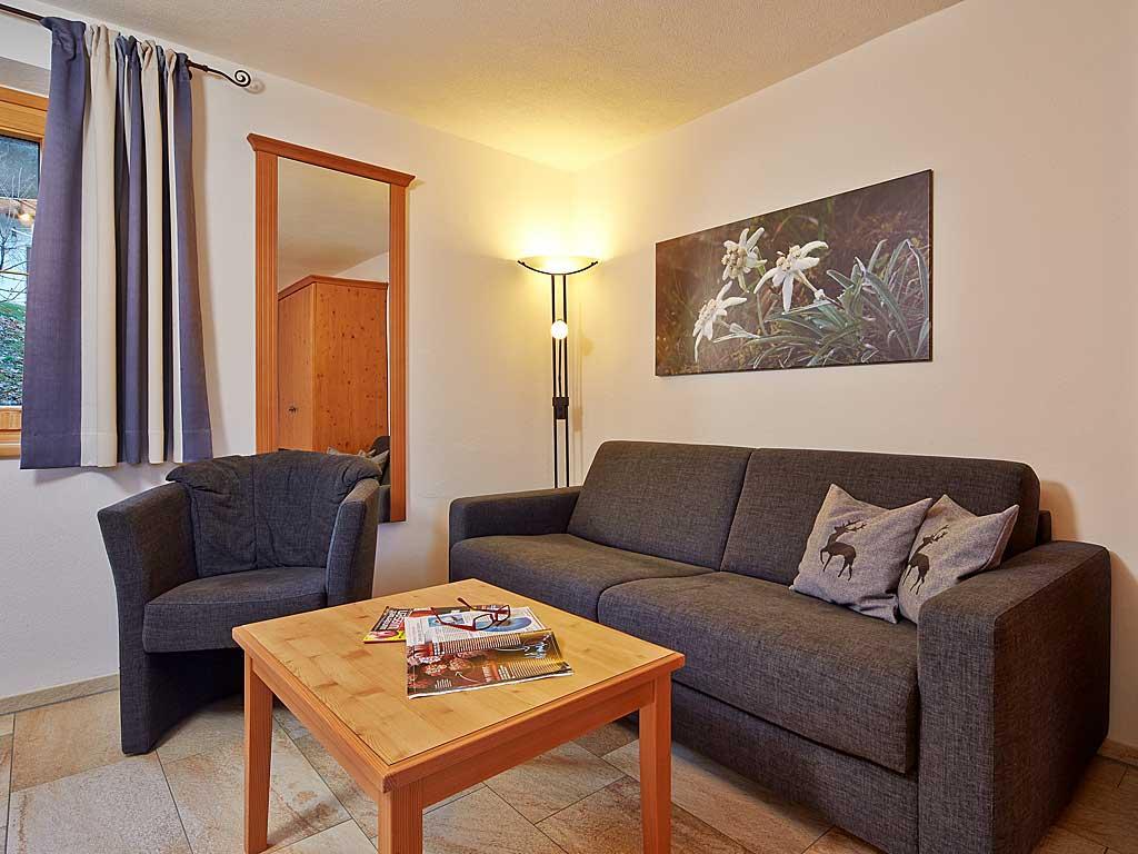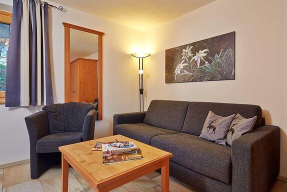 Unser Appartement Edelweiß befindet sich im Halb-Stock und bietet Ihnen einen Wohnraum mit ausziehbarem Doppelbett Sofa und Einzelbett, Küchenblock, Dusche, separates WC, sowie SAT-TV und W-Lan.