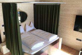 Das Spiegel Appartement ist glamourös und großzügig. Die warme Hozvertäfelung, der herrliche Süd Blick, die barocken Spiegel.