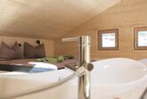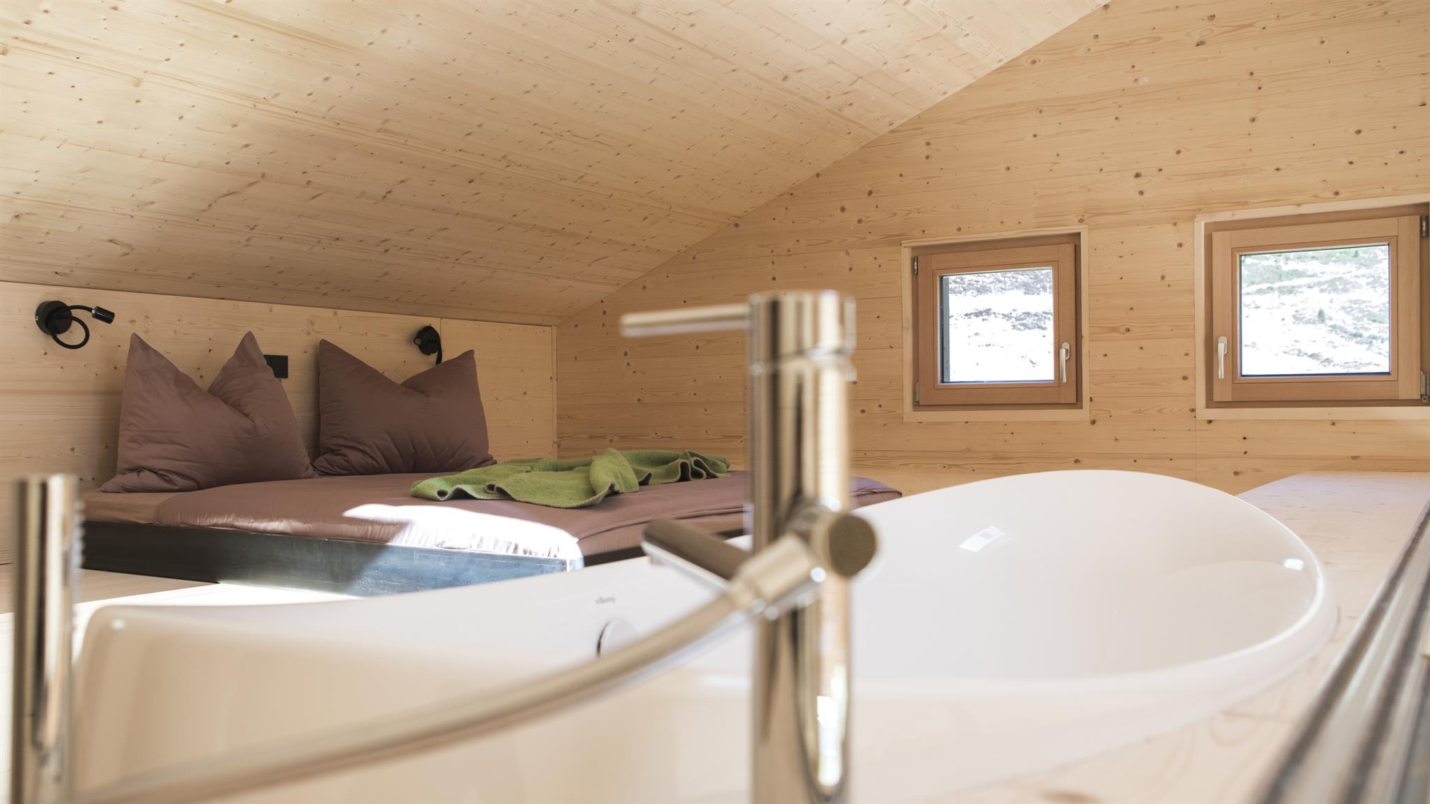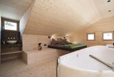 großzügiges Appartement für bis zu 6 Personen, 2. OG + Dachgeschoß, freier Blick in 3 Himmelsrichtungen, Massivholzwände mit Fichtenholzschalungen, Lärchenholzböden, Vorhänge aus Ötztaler Schafwolle. 1 Schlafzimmer auf der unteren Ebene, Ausziehcouch für die 5. und 6. Person im Dachgeschoß.