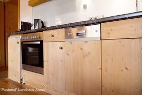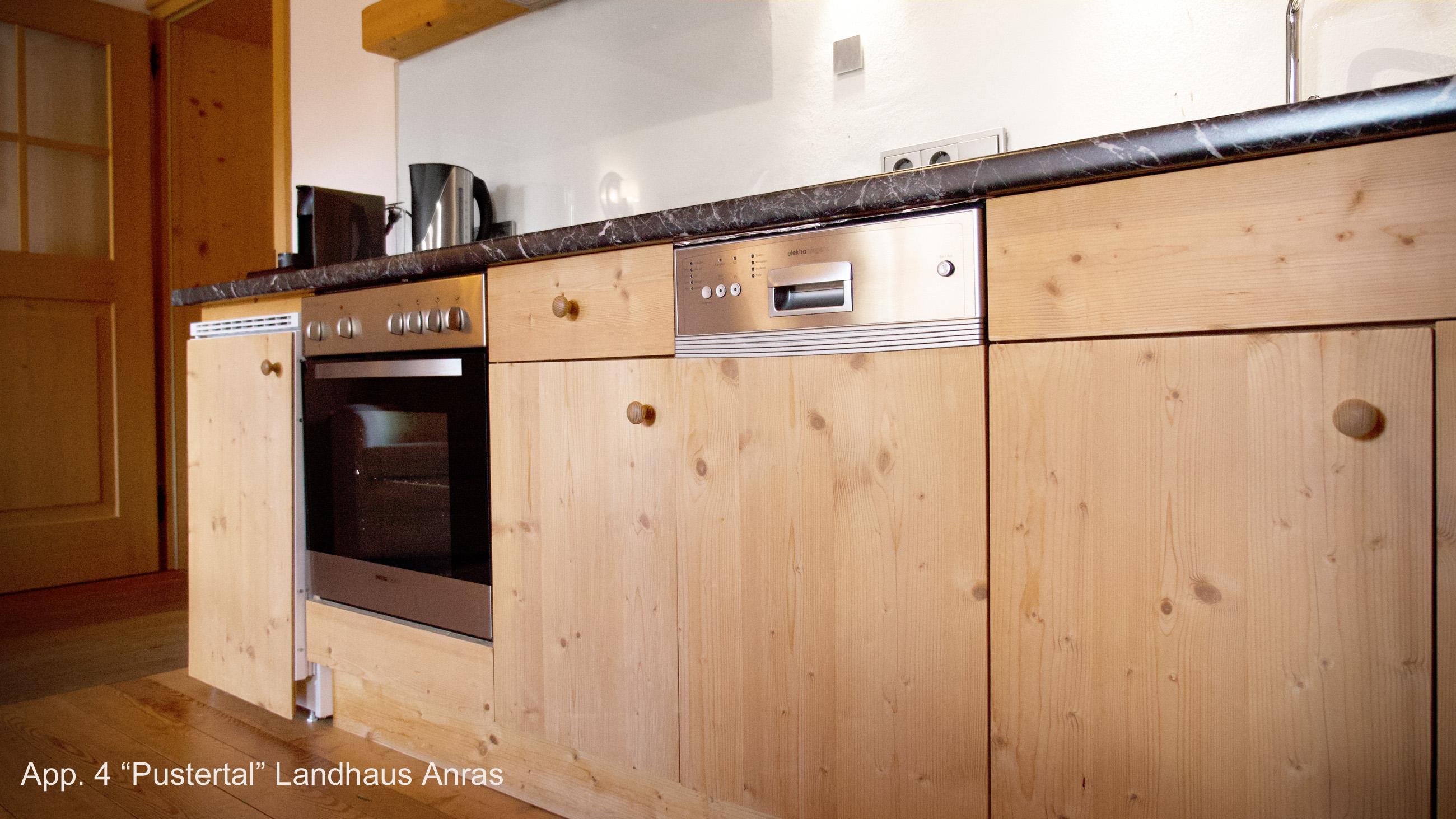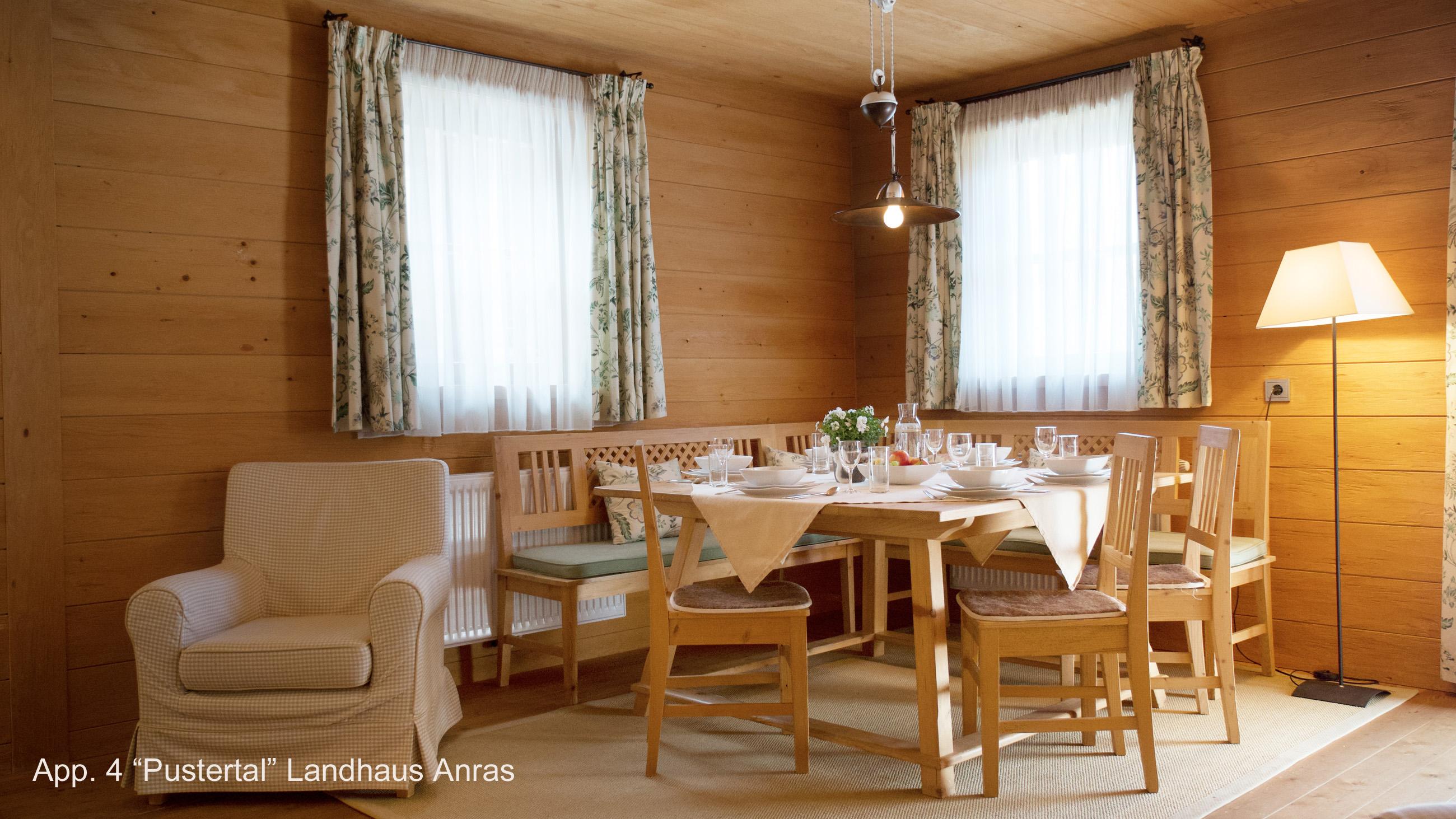 Das Appartement Pustertal ist traumhaft schön durch handgehackte Holzbalken . Gemütlicher Wohn-/Eßraum mit offener Küche, Luxus-Bad mit Wanne, Dusche, WC, Bidet, Handtuchwärmer (nur Heizperiode), Leuchtspiegel Südbalkon mit Blick aufs Schloss