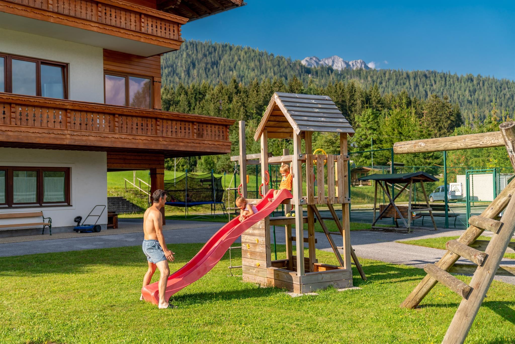 Unser Landhotel Kielhuberhof liegt im südlichen Teil der Ramsau, inmitten der eigenen grünen Wiesen: eine traumhaft ruhige und sonnige Lage am Fuße des Dachsteins mit freiem Panoramablick auf die Planai und die Niederen Tauern. Die vielen Sport- und Freizeitmöglichkeiten wie langlaufen, wandern oder Ski fahren laden zu einem einzigartigen Urlaub in die Ramsau ein! Der Skibus in die familienfreundlichen Skigebiete Ramsau und Ski amadé hält direkt beim Hotel Kielhuberhof. Der Kielhuberhof bietet Ihnen gemütliche Einzel- und Doppelzimmer, ein ebenerdig begehbares, barrierefreies Doppelzimmer mit Zugang über eine eigene Haustüre, geräumige Familienzimmer sowie Appartements und Ferienwohnungen für bis zu 6 Personen. Auch größere Gruppen sind bei uns im Hotel Kielhuberhof gerne willkommen. Alle Zimmer und Ferienwohnungen sind im modernen Landhaus-Stil eingerichtet und verfügen ab der Kategorie 25m² über neue große Wohlfühl-Badezimmer und über einen herrlichen Balkon mit Aussicht auf die umliegende Bergwelt. In den geräumigen Familienzimmern für 2 - 5 Personen finden Sie einen Vorraum mit Garderobe und eine kleine Küchenzeile mit bequemer Essecke. Gerne bieten wir Ihnen auch 1 barrierefreies Zimmer mit einem speziell auf die Bedürfnisse von Rollstuhlfahrern abgestimmten Badezimmer an. Für Ihr leibliches Wohl sorgen wir mit unserem reichhaltigen Frühstücksbuffet mit Produkten heimischer Bauern und dem köstlichen 3- oder 4-Gang Wahlmenü mit vegetarischer Alternative, Salat- und Dessertbuffet. Im Sommer laden wir einmal wöchentlich zu einem gemütlichen Grillabend ein. Das Hotel Kielhuberhof bietet Ihnen eine Freizeithalle mit Tischtennis, Tischfußball und Billard, einen 400 m² großen Natur-Schwimmteich, eine Liegewiese, 2 Tennisplätze und einen Sportplatz für Fußball, Volleyball und Badminton. Nach einem aktiven Tag mit Wandern oder Langlaufen, entspannen Sie im neu gestalteten Wellnessbereich des Landhotels Kielhuberhof. Der Panorama-Wellnessbereich erstreckt sich über 2 Etagen und bietet eine urige Blockholz-Sauna-Hütte. Relaxen Sie auch in der Bio-Sauna, dem Kräuterdampfbad, der Infrarotkabine und im Ruheraum mit Blick auf das Dachstein-Massiv. Auf Anfrage organisieren wir für Sie entspannende Wohlfühl-Massagen. Von der Sonnenterrasse genießen Sie bei einem hausgemachten Apfelstrudel einen herrlichen Ausblick auf die Naturkulisse der Dachstein-Tauern-Region. In der gemütlichen Stube mit offenem Kamin verbringen Sie gediegene Stunden mit einem spannenden Buch oder bei einem Glas guten Österreichischen Weins. Im Sommer lädt Sie die idyllische Umgebung der Ramsau am Dachstein zu gemütlichen Spaziergängen, aktivem Nordic-Walking und Wanderungen auf die urigen Almen der Region ein. Für Kinder bieten Hochseilgärten, Freizeitparks und Naturlehrpfade spannende Erlebnisse. Den Winter in der Ramsau verbringen Sie auf den herrlich präparierten Pisten der Skigebiete Ramsau und Planai, auf den traumhaft gespurten Langlaufloipen, auf den Winterwanderwegen zu Fuß oder im Pferdeschlitten, oder ganz gemütlich in einer der umliegenden Hütten. Familie Tritscher freut sich schon sehr, Sie im Landhotel Kielhuberhof in Ramsau am Dachstein zu begrüßen und zu bewirten!