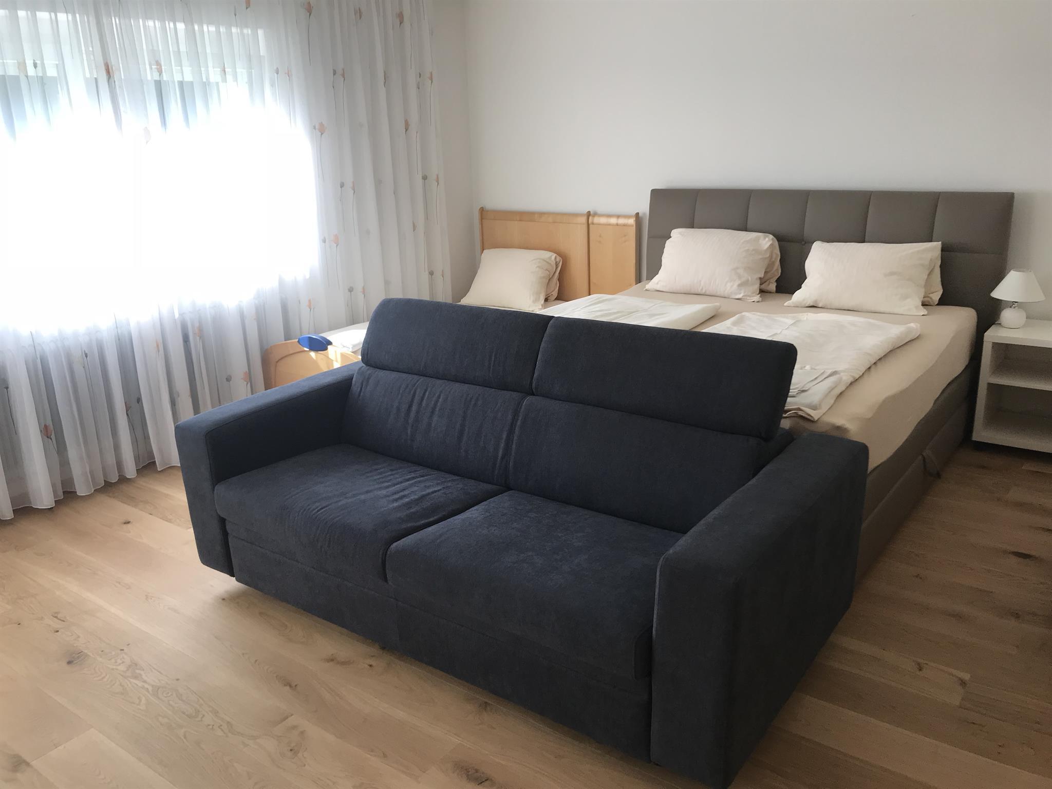• ein Schlafzimmer mit Doppelbett und Schlafcouch für 2 Personen