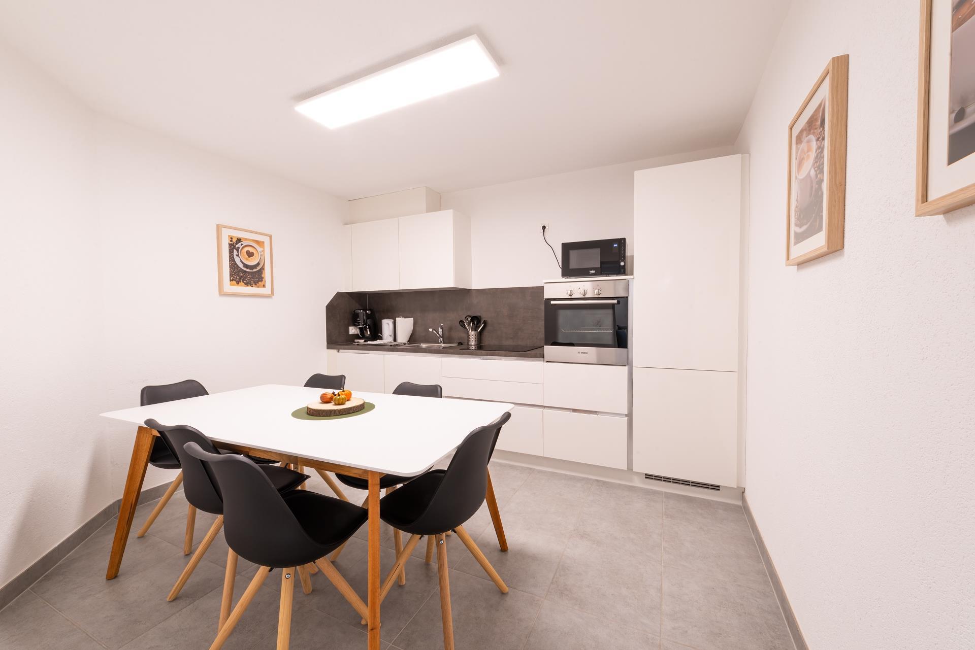 Mikrowelle, Backofen und gemütlicher Essplatz für 8 Personen