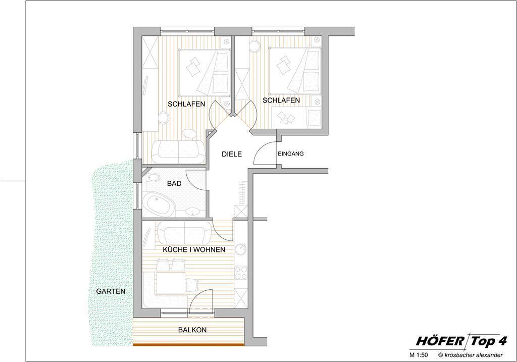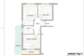 64 m2, schöne Wohnküche mit Balkon und eigenem Garten, 2 separate Schlafzimmer, modernes Badezimmer, großer Vorraum.