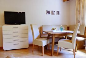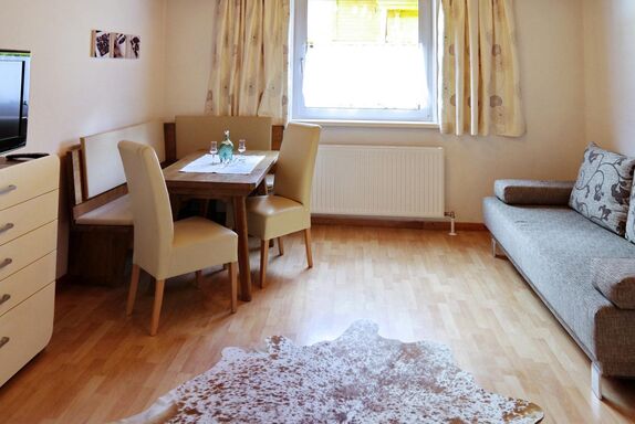 Wohnraum mit Essecke, Schlafsofa (200cm x 160cm)und Flat Sat-TV.