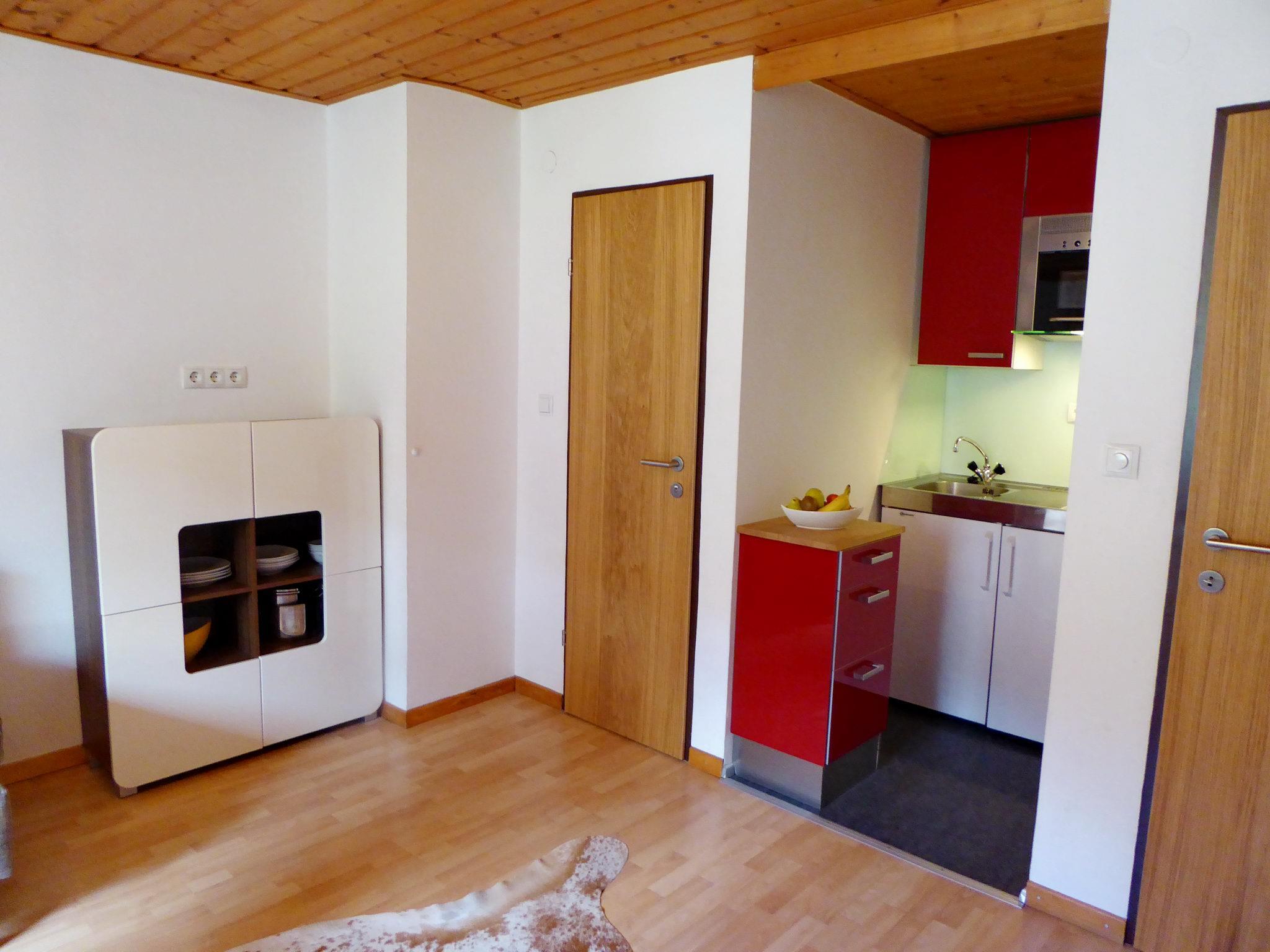 Gemütlich ausgestattet mit Kochnische, Kühlschrank, Geschirr, Toaster, Kaffeemaschine.