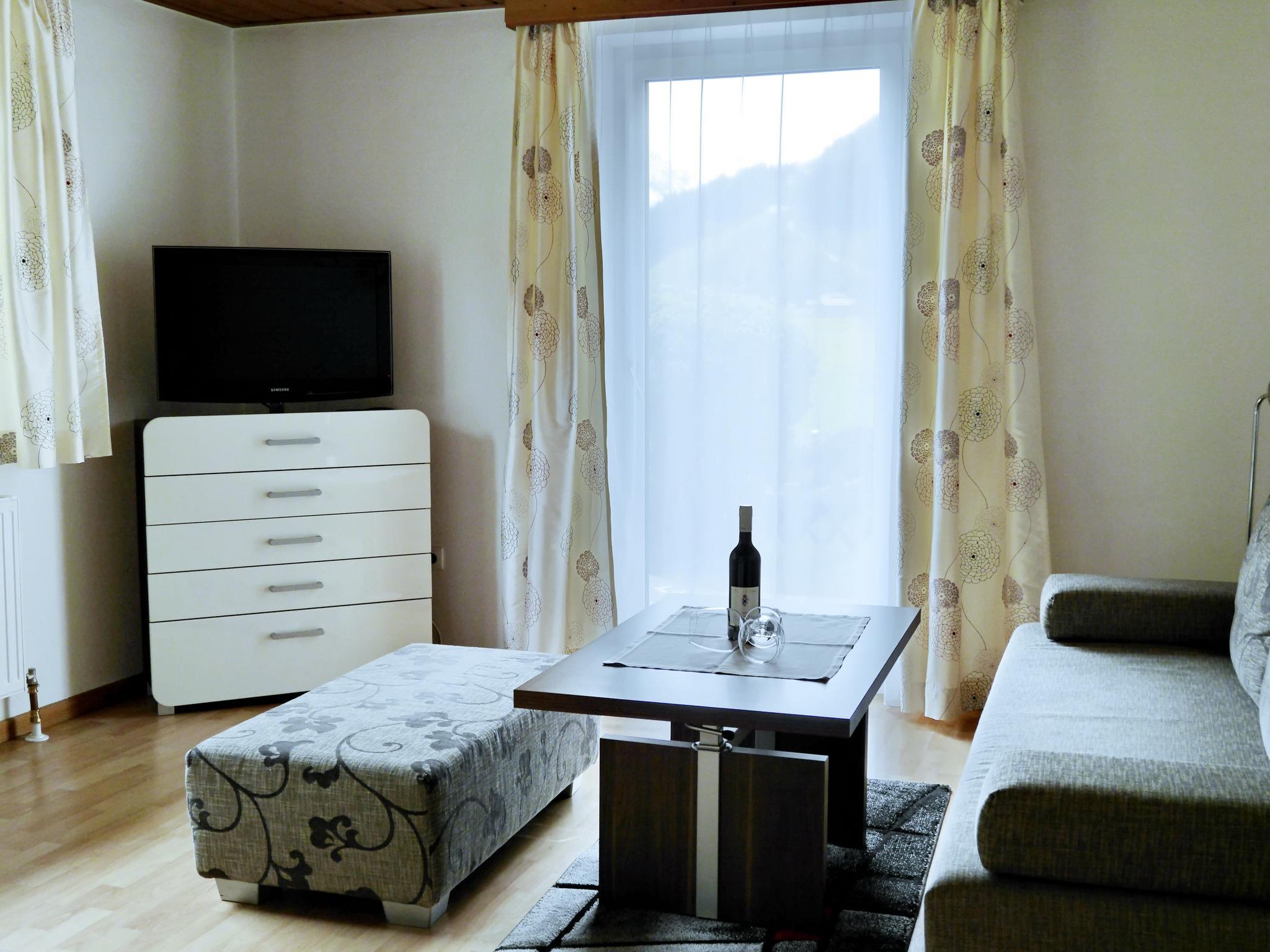 Wohnzimmer mit Schlafsofa (200cm x 160 cm) und Flat Sat-TV.