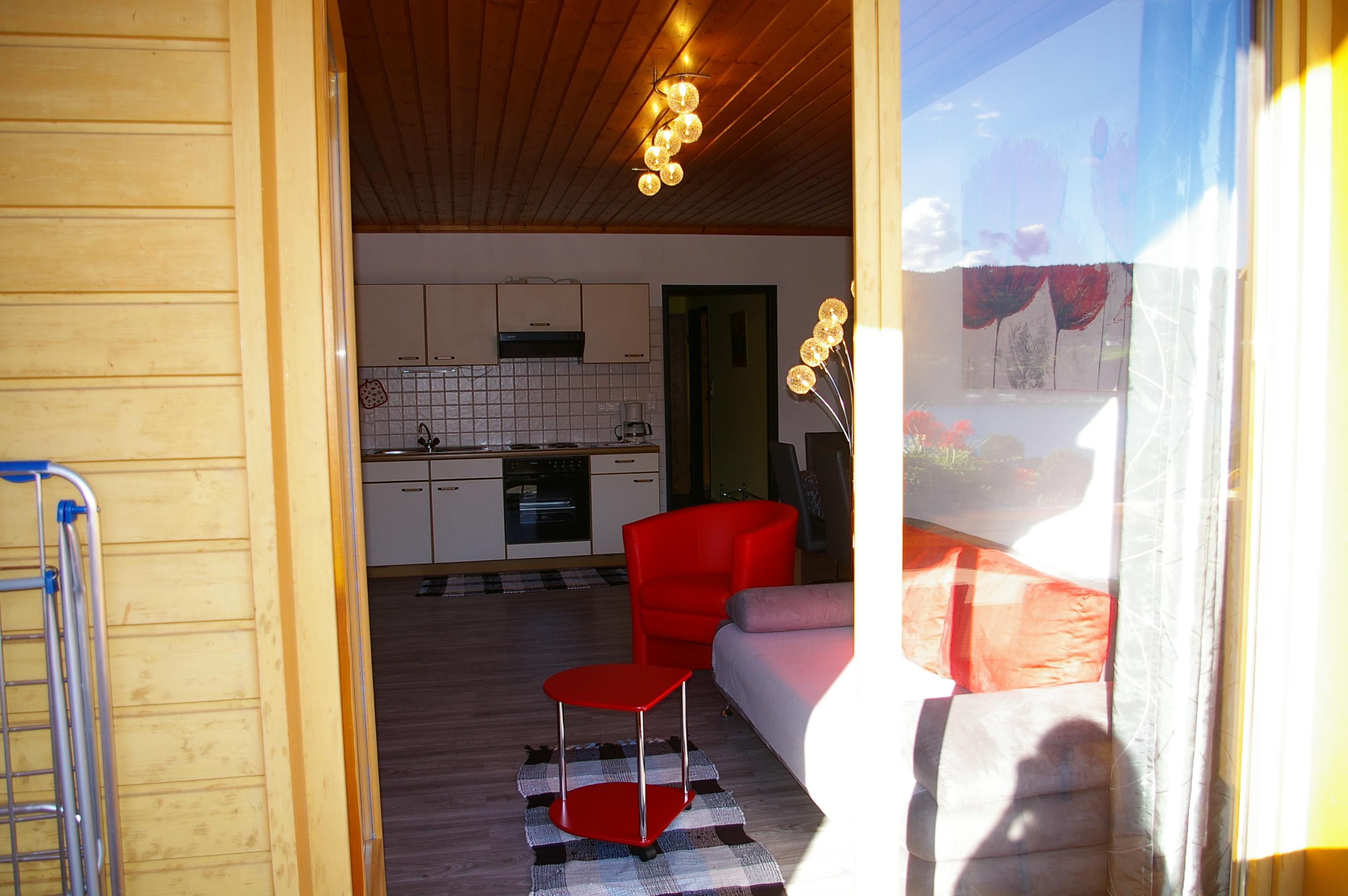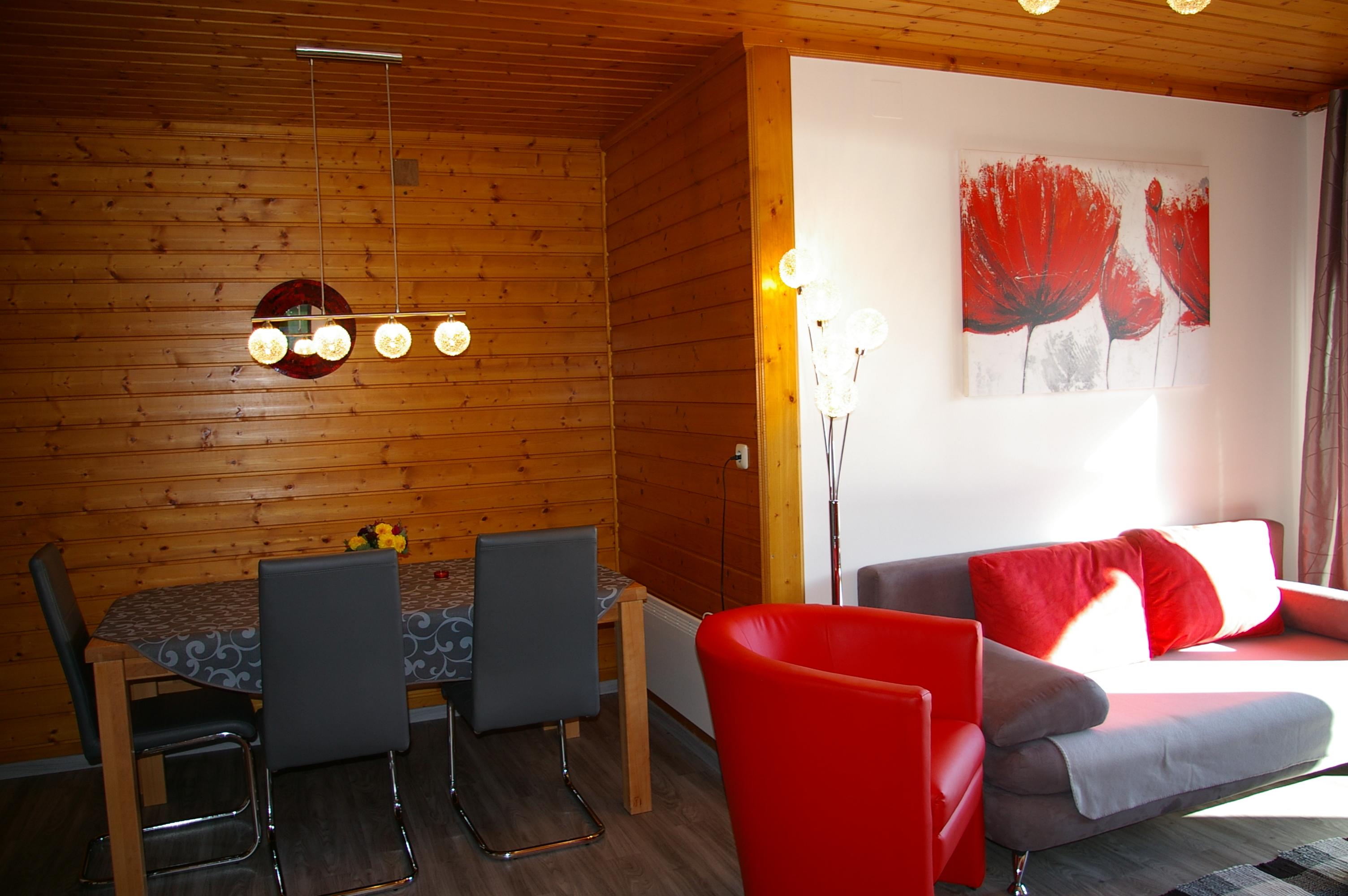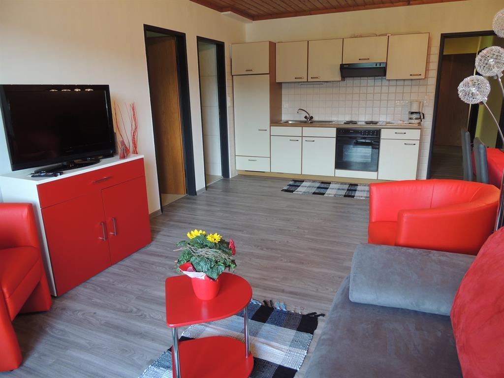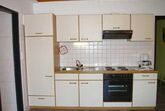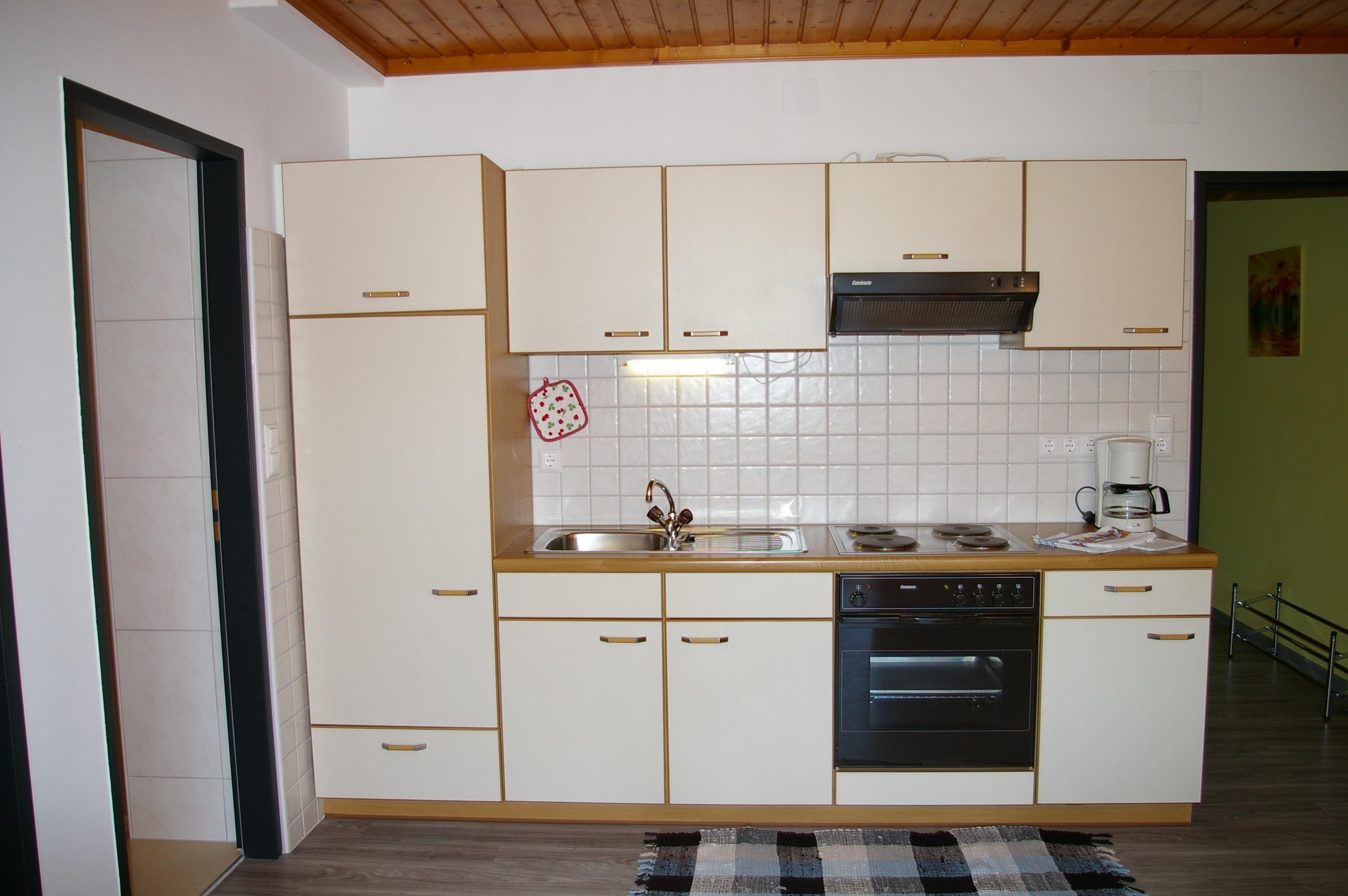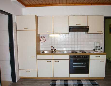 Die Wohnküche bietet eine gemütliche Essecke. Der Küchenblock besteht aus einem großen Kühlschrank mit Gefrierfach, einer Spüle, einem Herd mit Backofen. Die Couch mit zwei Sesseln und direktem Blick auf den Fernseher mit Sat - TV schafft eine Wohnzimmeratmosphäre. Das Appartement ist beheizbar.