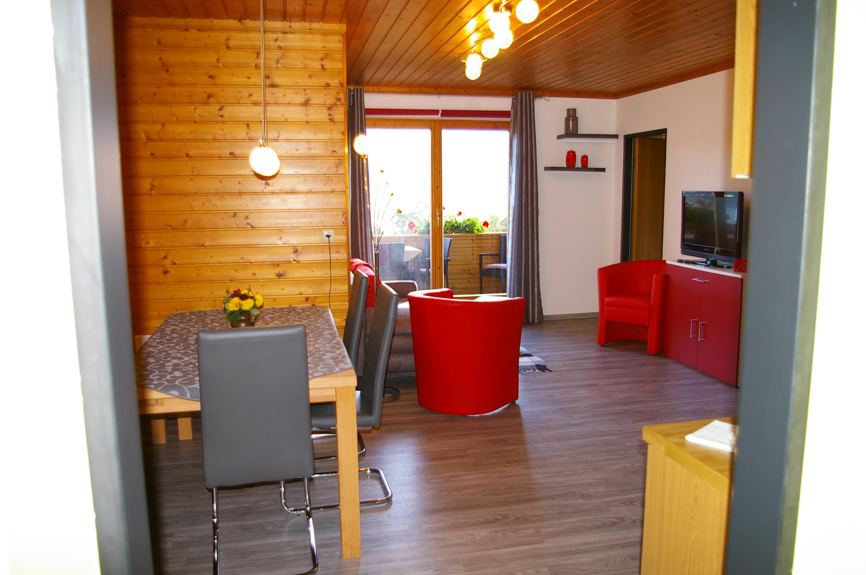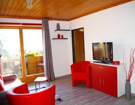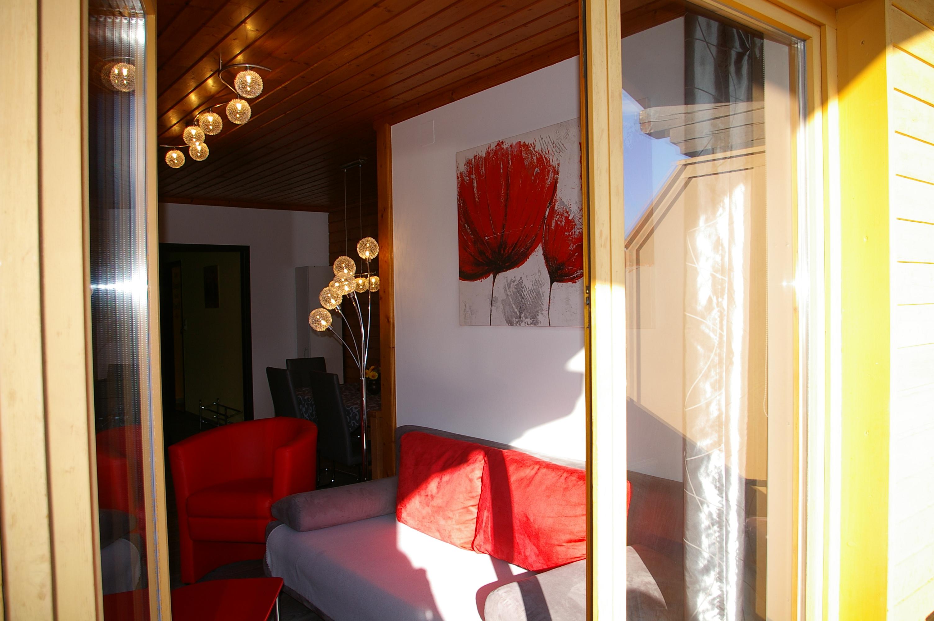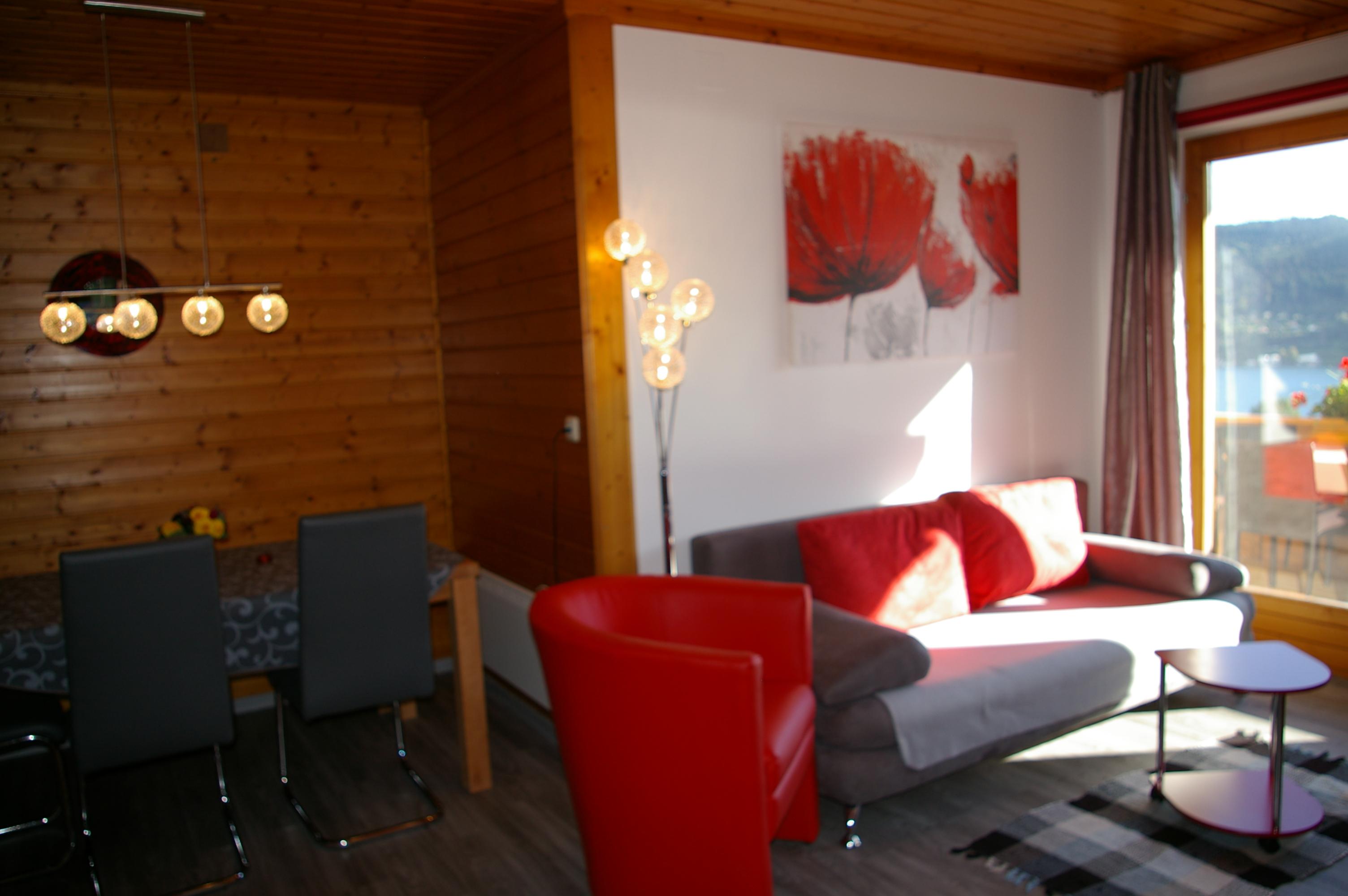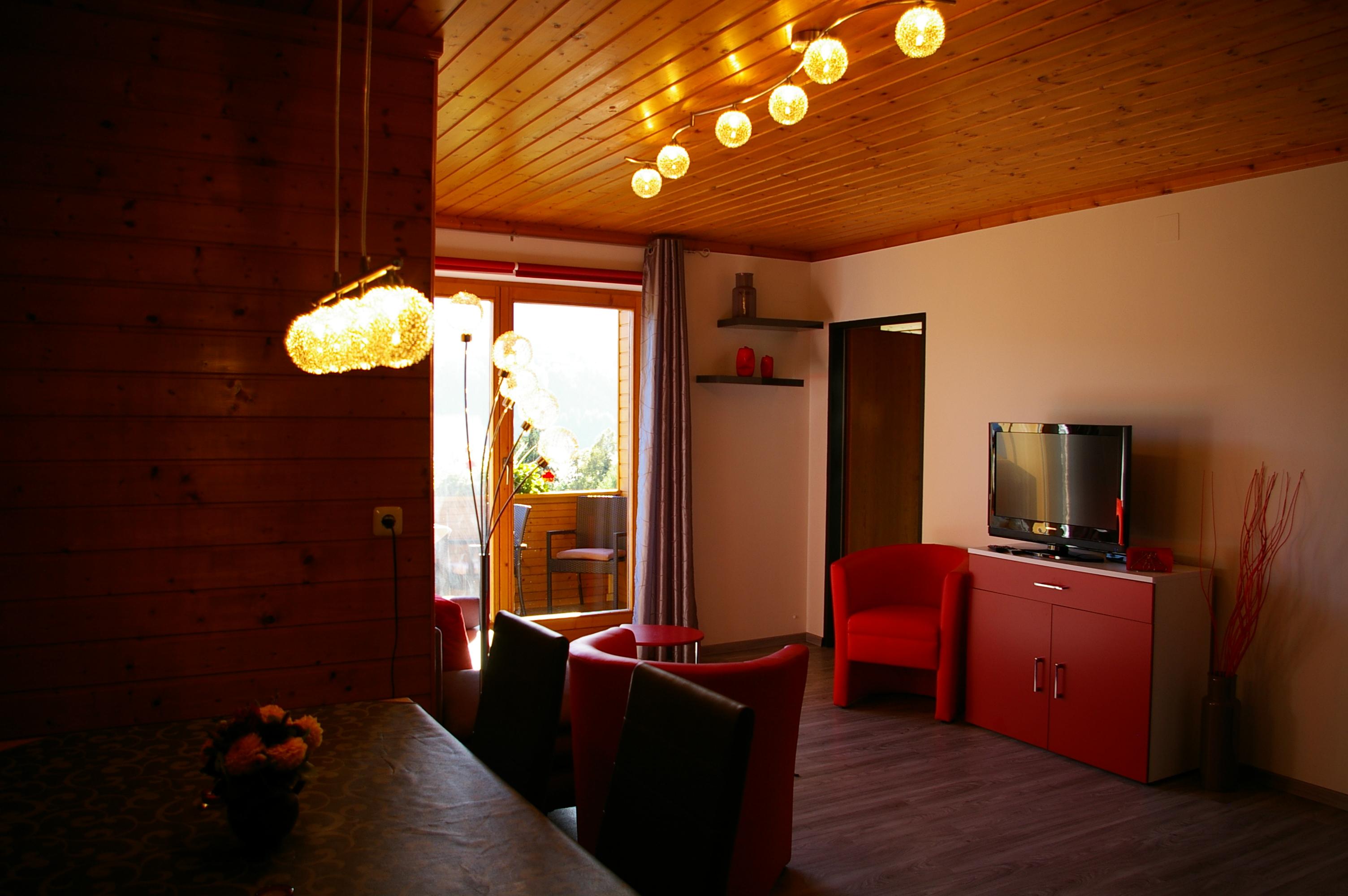 Die Wohnküche bietet eine gemütliche Essecke. Der Küchenblock besteht aus einem großen Kühlschrank mit Gefrierfach, einer Spüle, einem Herd mit Backofen. Die Couch mit zwei Sesseln und direktem Blick auf den Fernseher mit Sat - TV schafft eine Wohnzimmeratmosphäre. Das Appartement ist beheizbar.