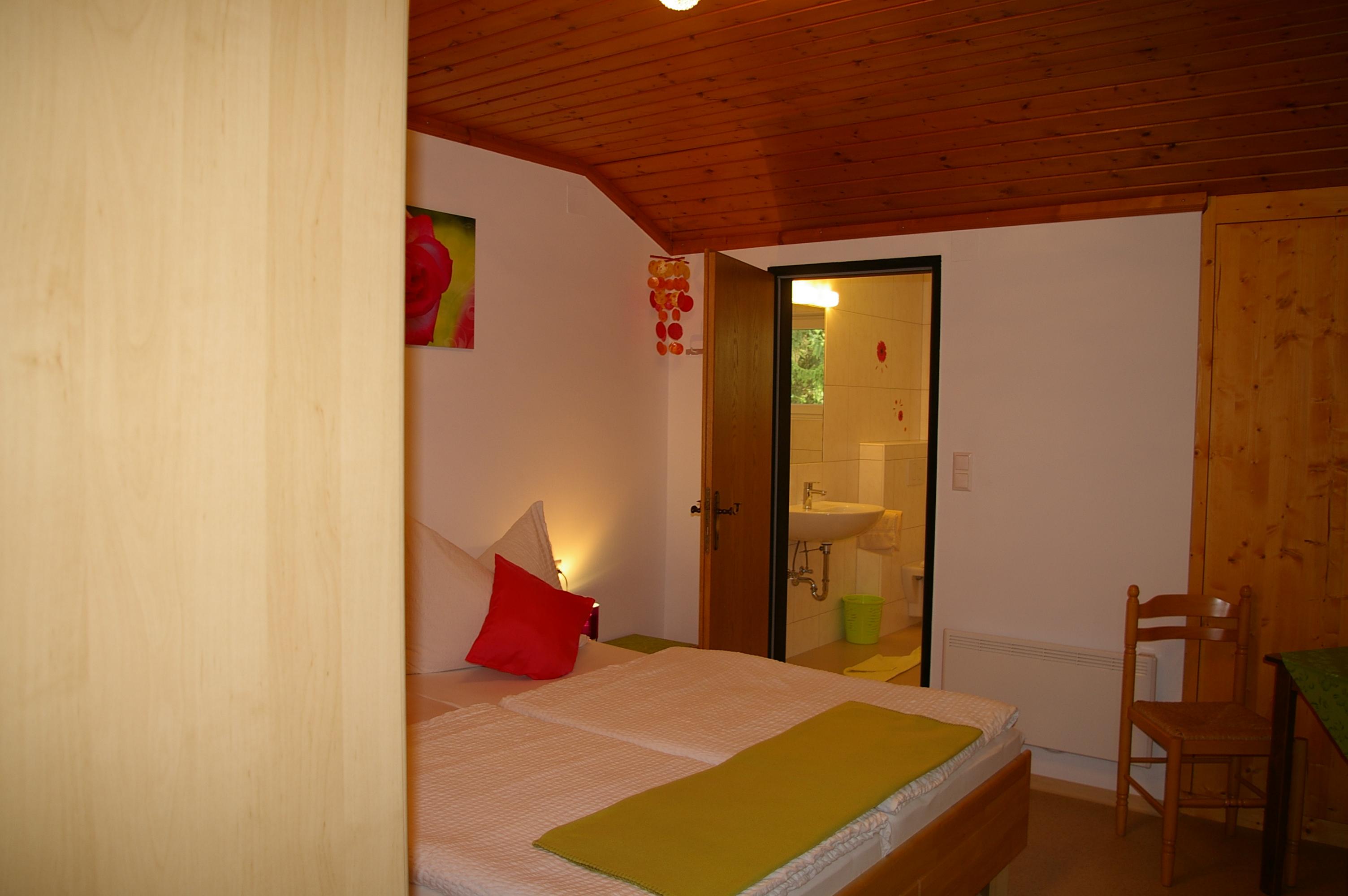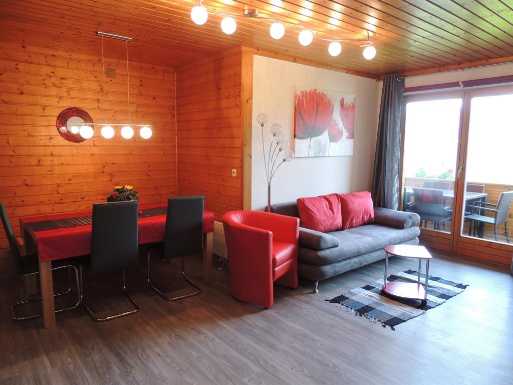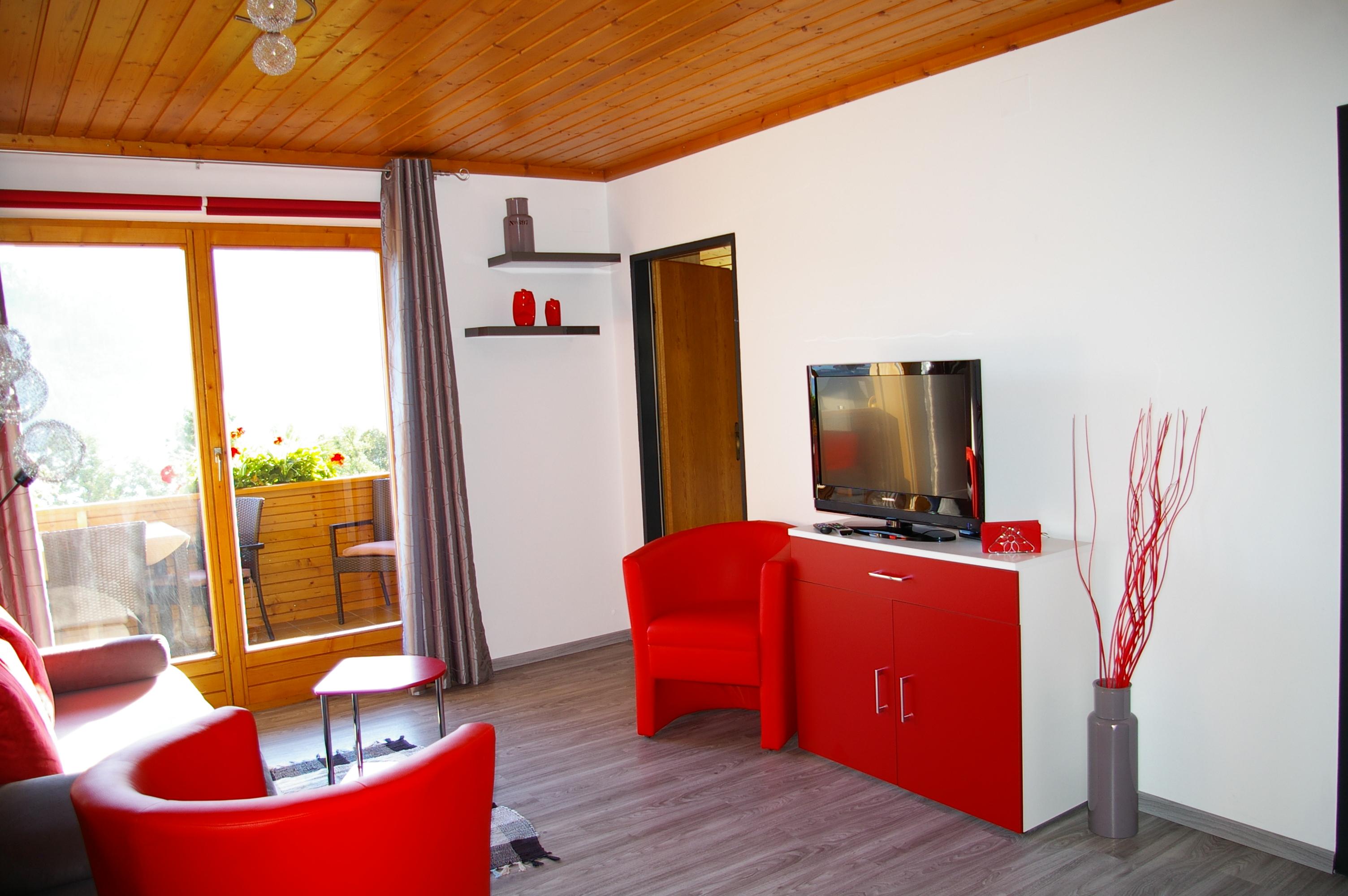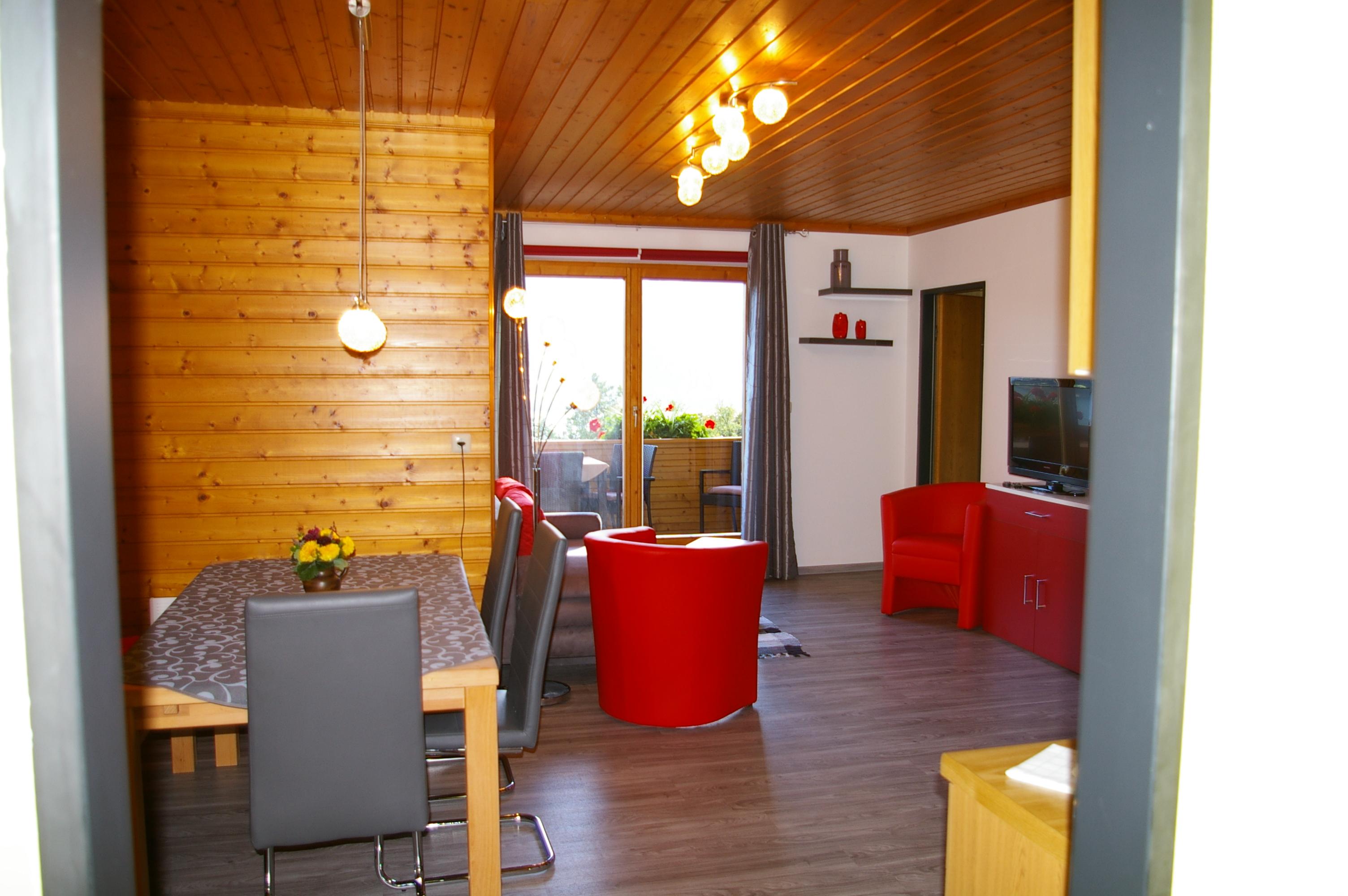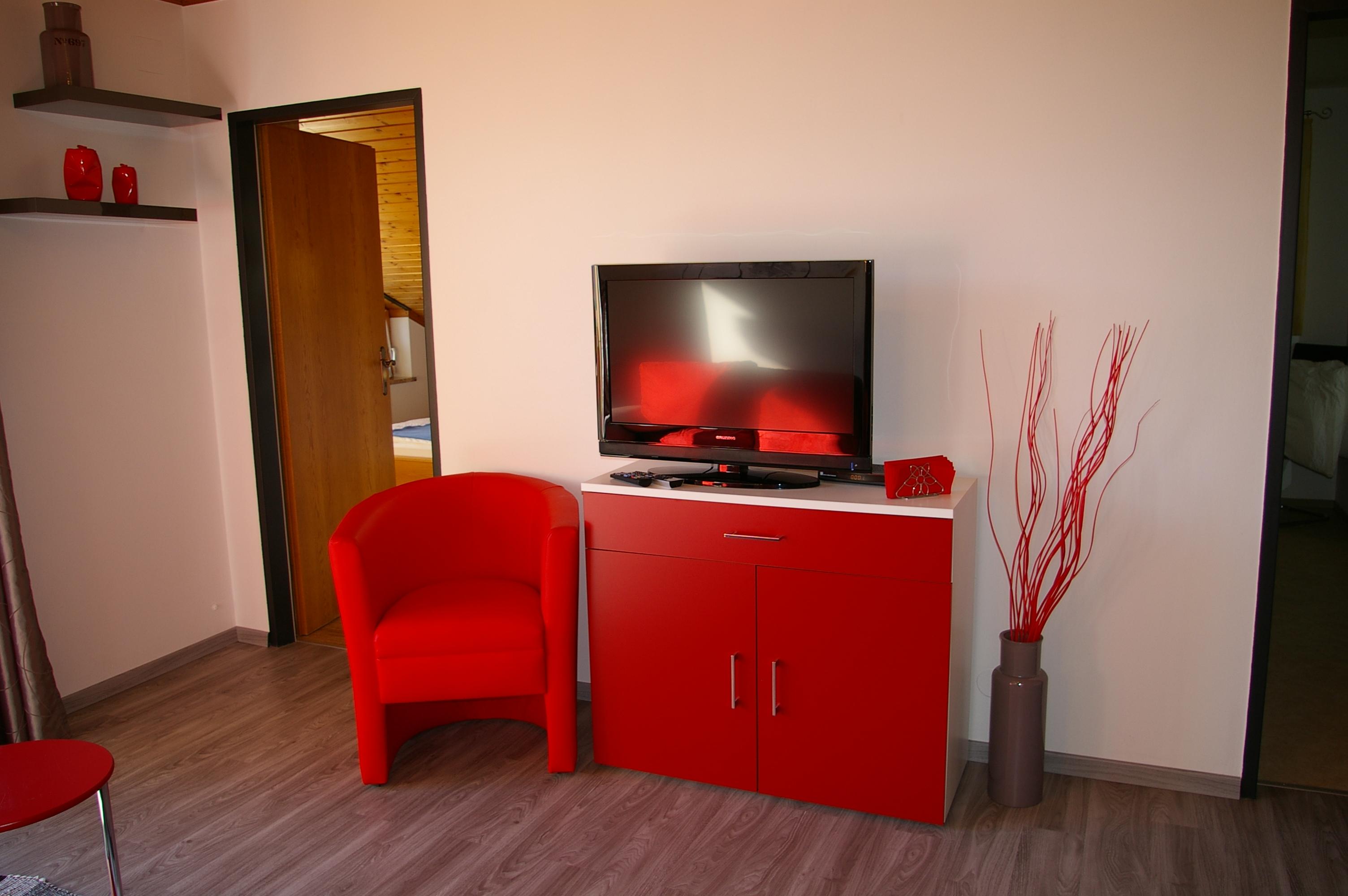 Die Wohnküche bietet eine gemütliche Essecke. Der Küchenblock besteht aus einem großen Kühlschrank mit Gefrierfach, einer Spüle, einem Herd mit Backofen. Die Couch mit zwei Sesseln und direktem Blick auf den Fernseher mit Sat - TV schafft eine Wohnzimmeratmosphäre. Das Appartement ist beheizbar.