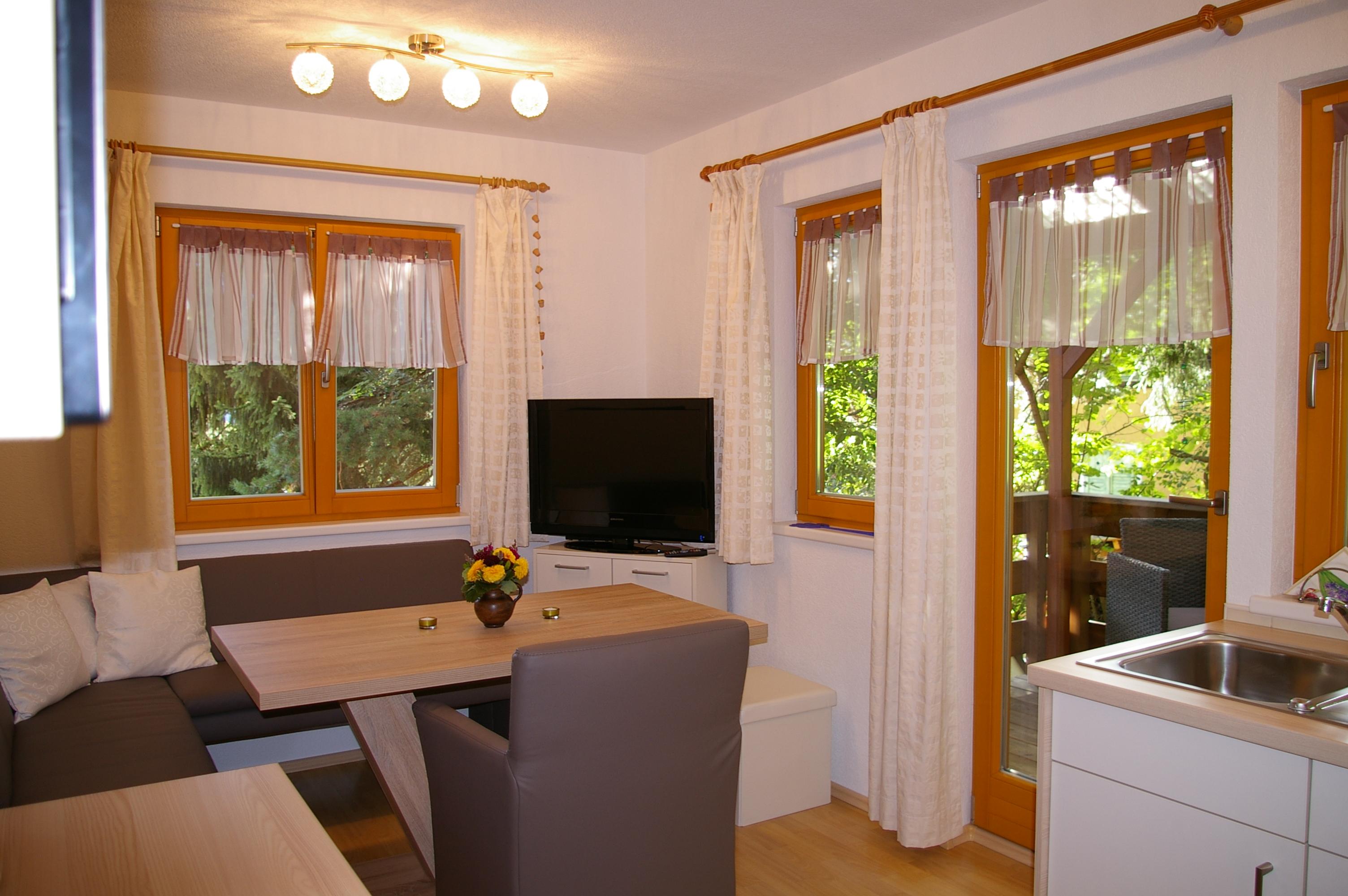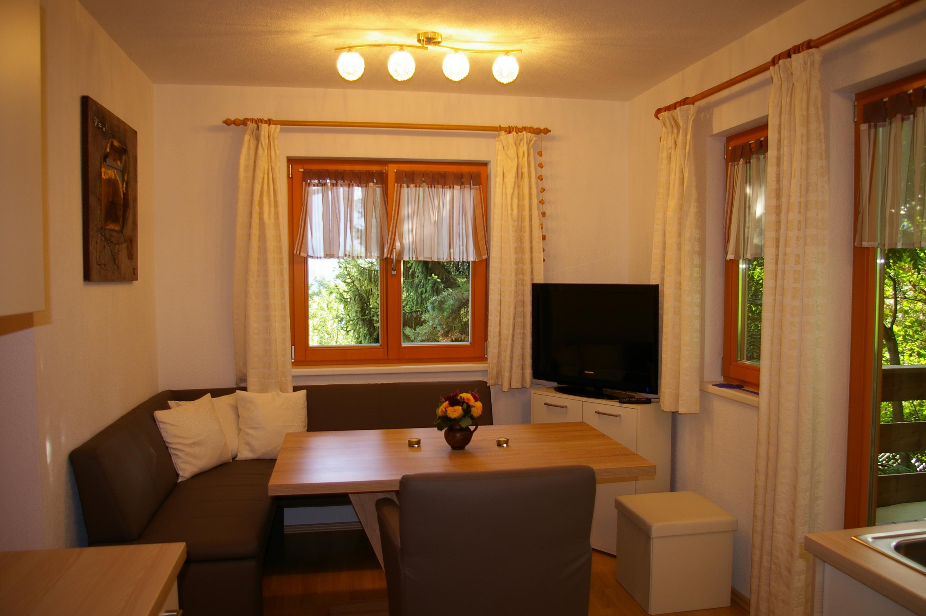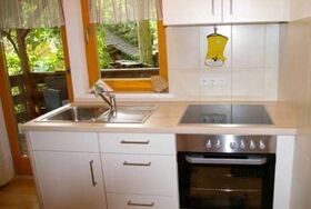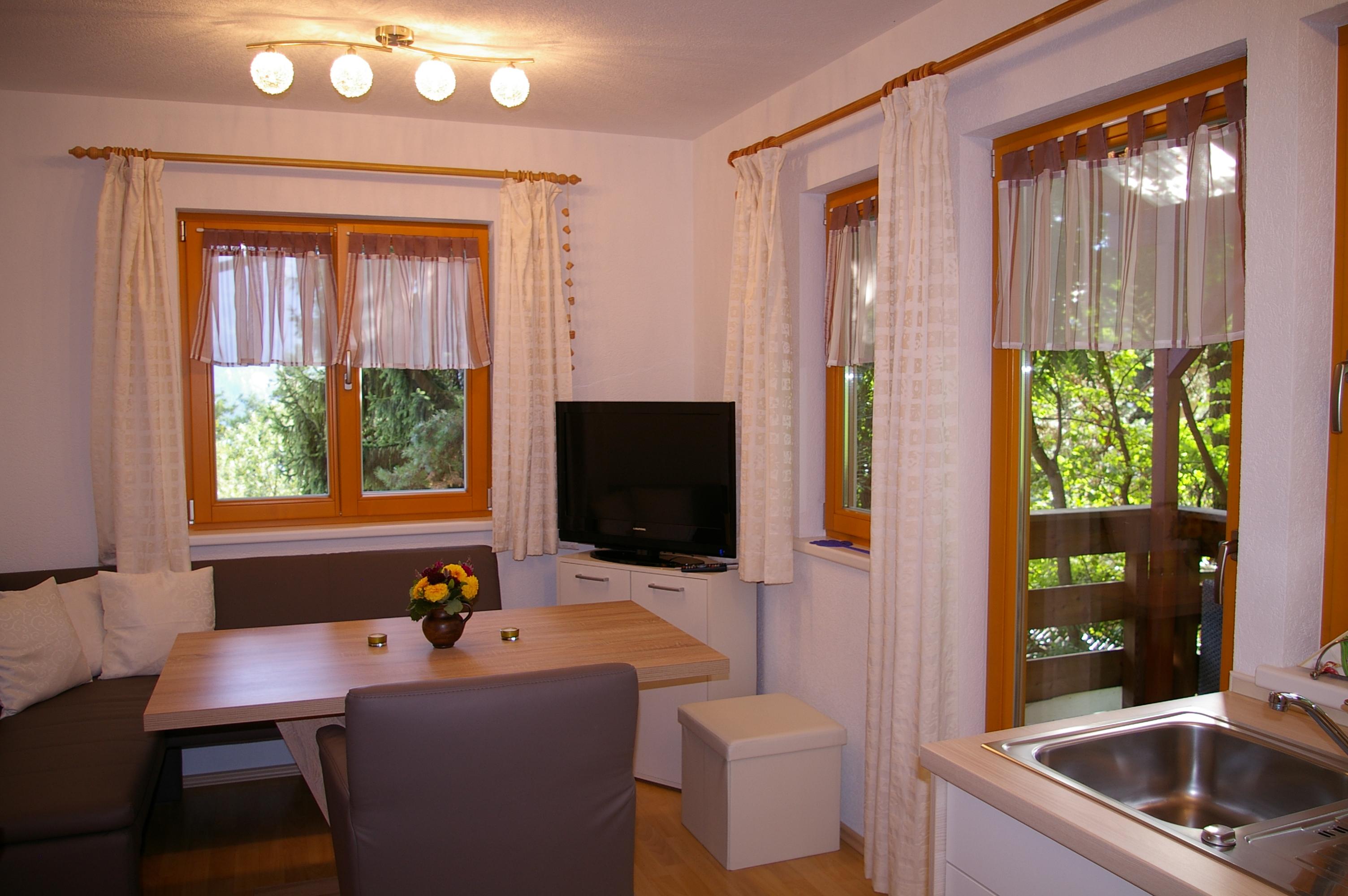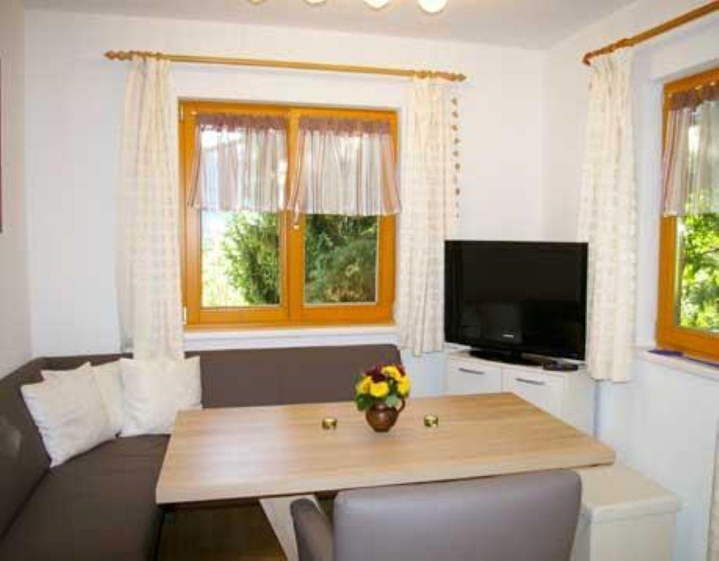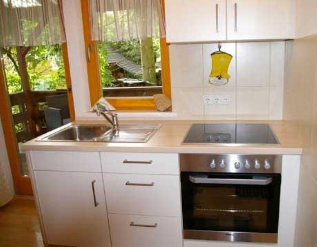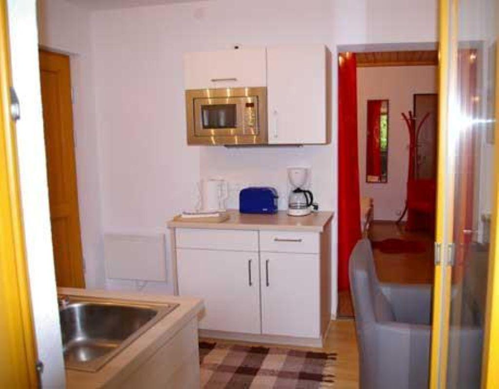 Die Wohnküche verfügt über eine gemütliche Essecke mit direktem Blick auf den Fernseher mit Sat - TV. Der Küchenblock besteht aus einer Spüle, Herd mit Backrohr, Kühlschrank mit Gefrierfach, Mikrowelle und ausreichend Staumöglichkeit. Das Schlafzimmer ist hell und geräumig. Die Süd-Westterrasse bietet den Blick auf See und Berge. Das Appartement ist beheizbar.