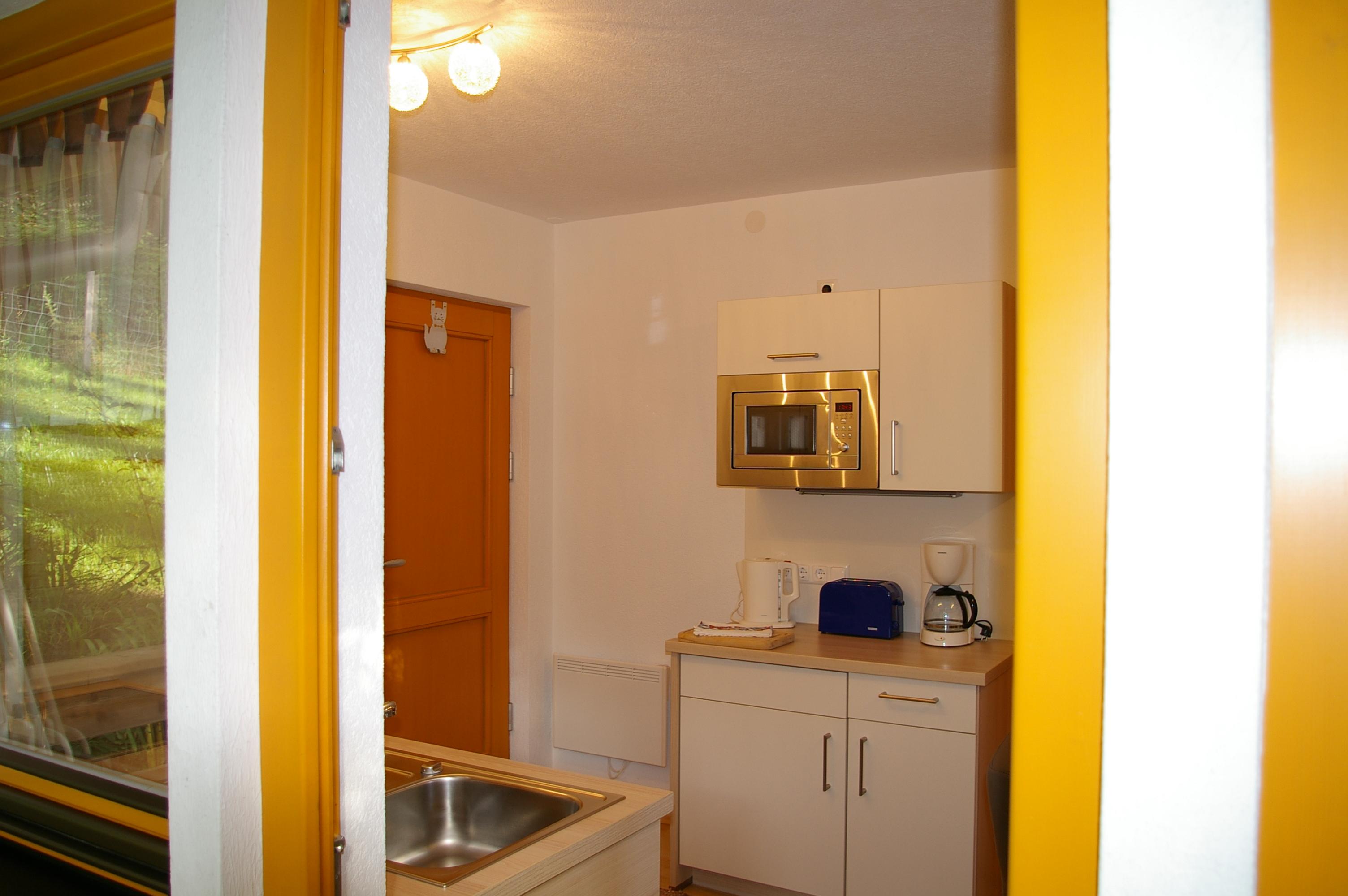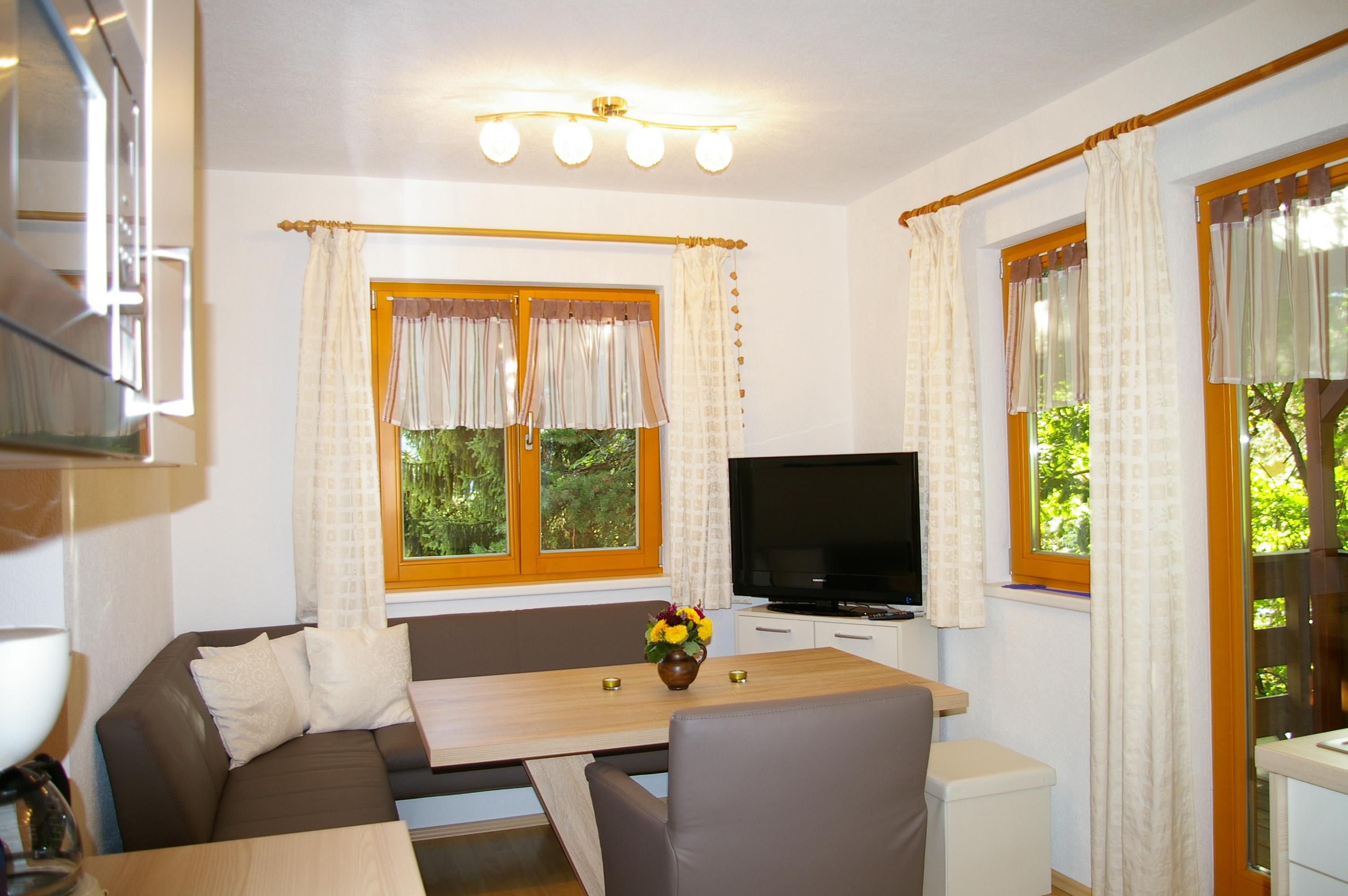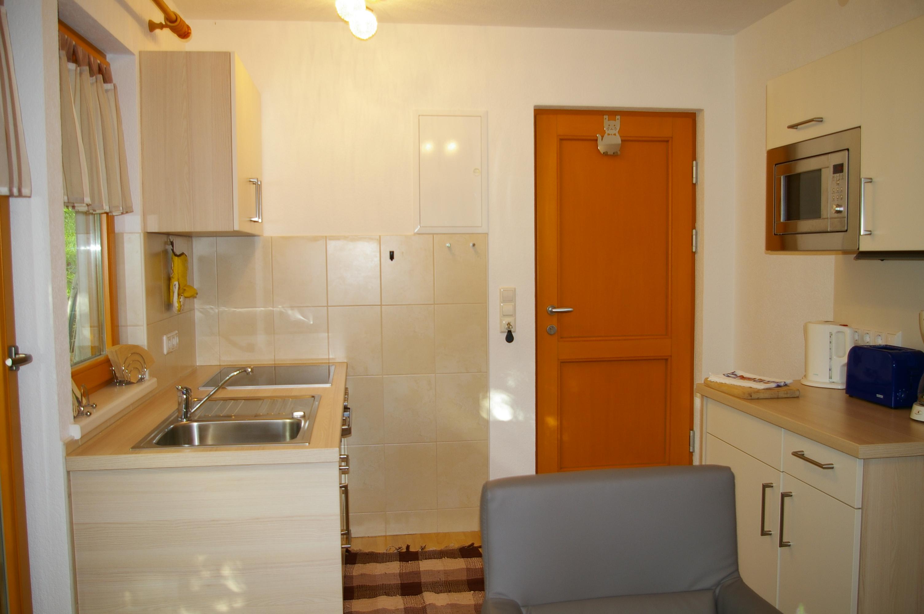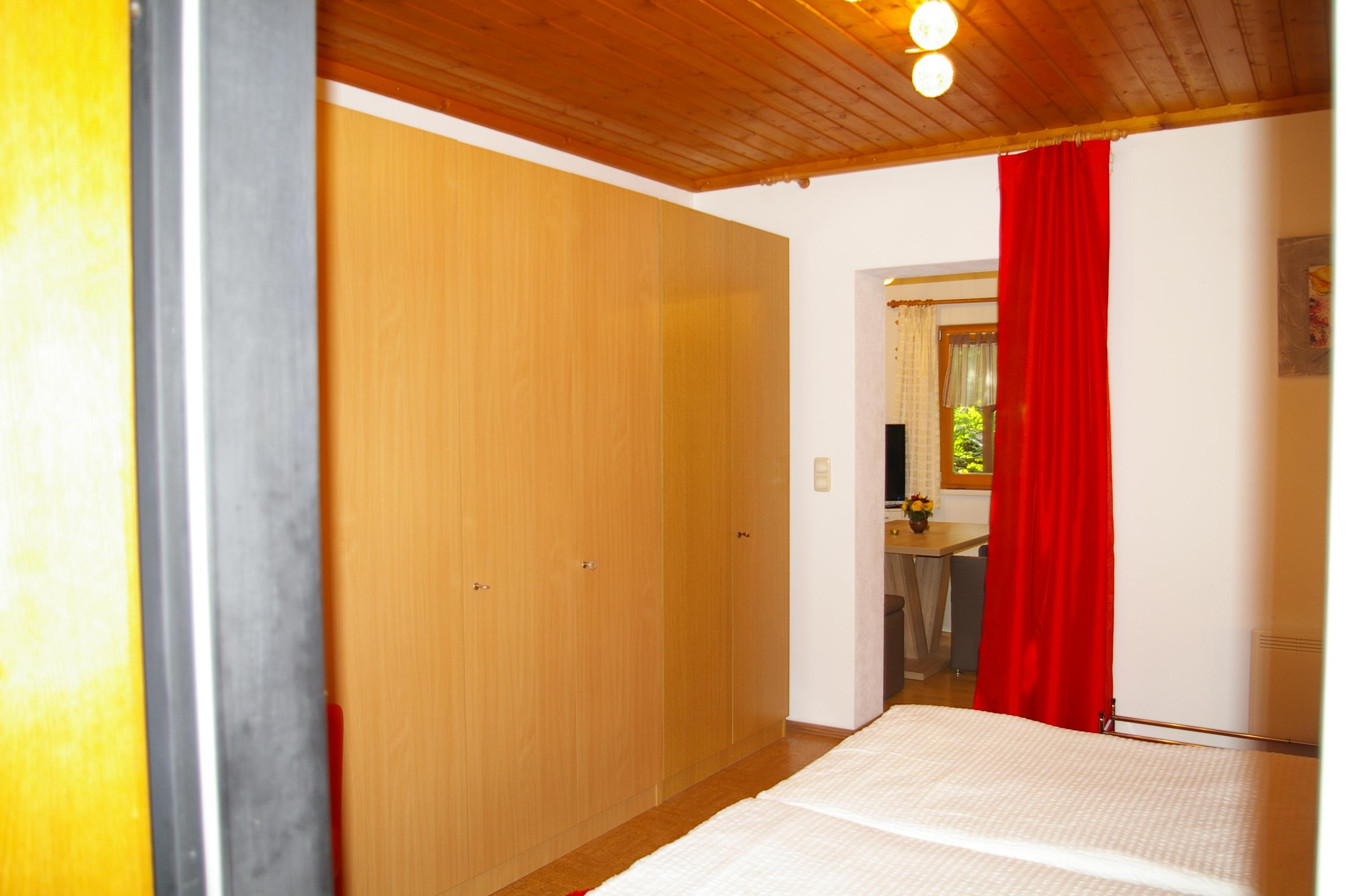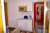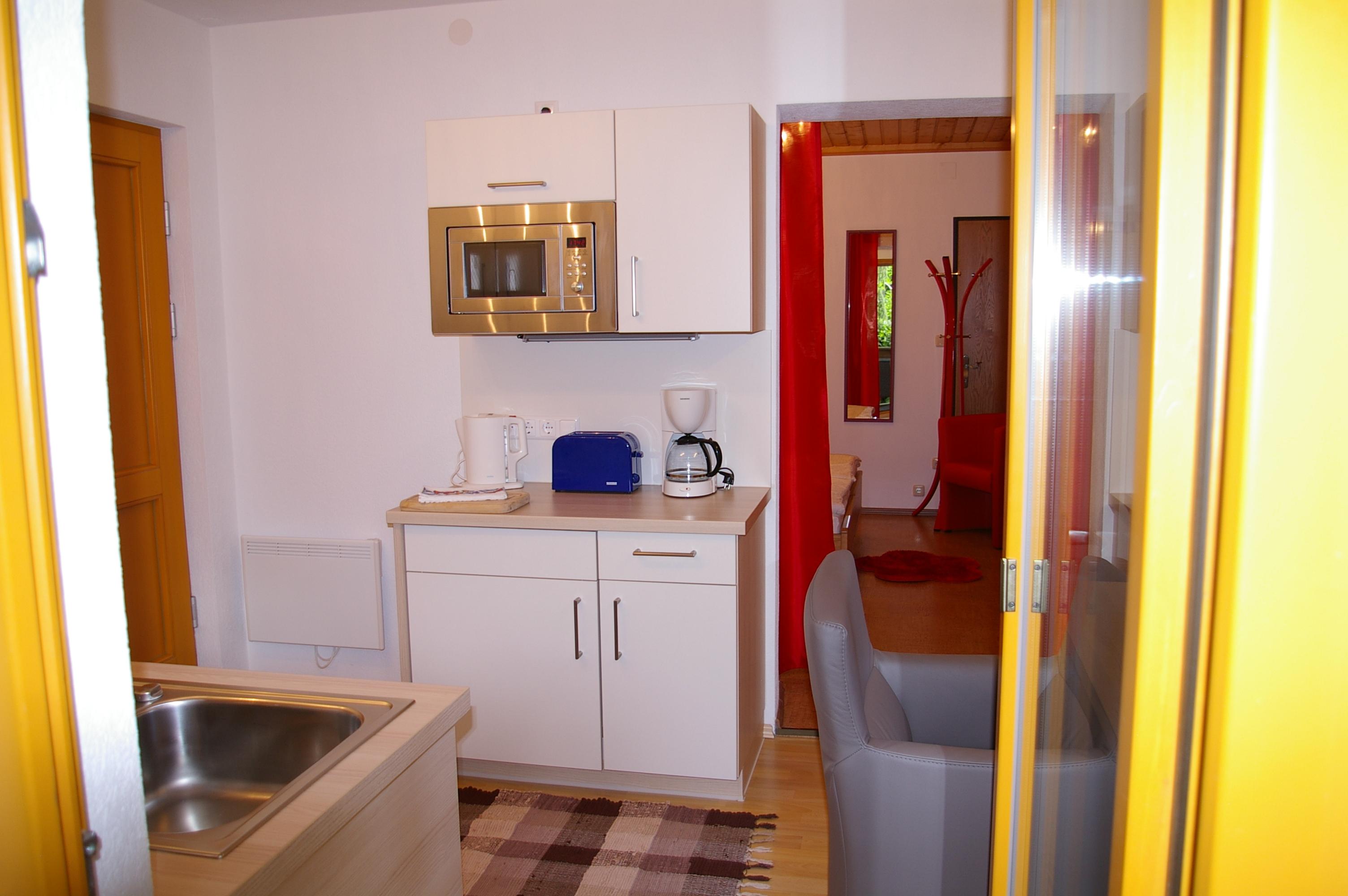 Die Wohnküche verfügt über eine gemütliche Essecke mit direktem Blick auf den Fernseher mit Sat - TV. Der Küchenblock besteht aus einer Spüle, Herd mit Backrohr, Kühlschrank mit Gefrierfach, Mikrowelle und ausreichend Staumöglichkeit. Das Schlafzimmer ist hell und geräumig. Die Süd-Westterrasse bietet den Blick auf See und Berge. Das Appartement ist beheizbar.